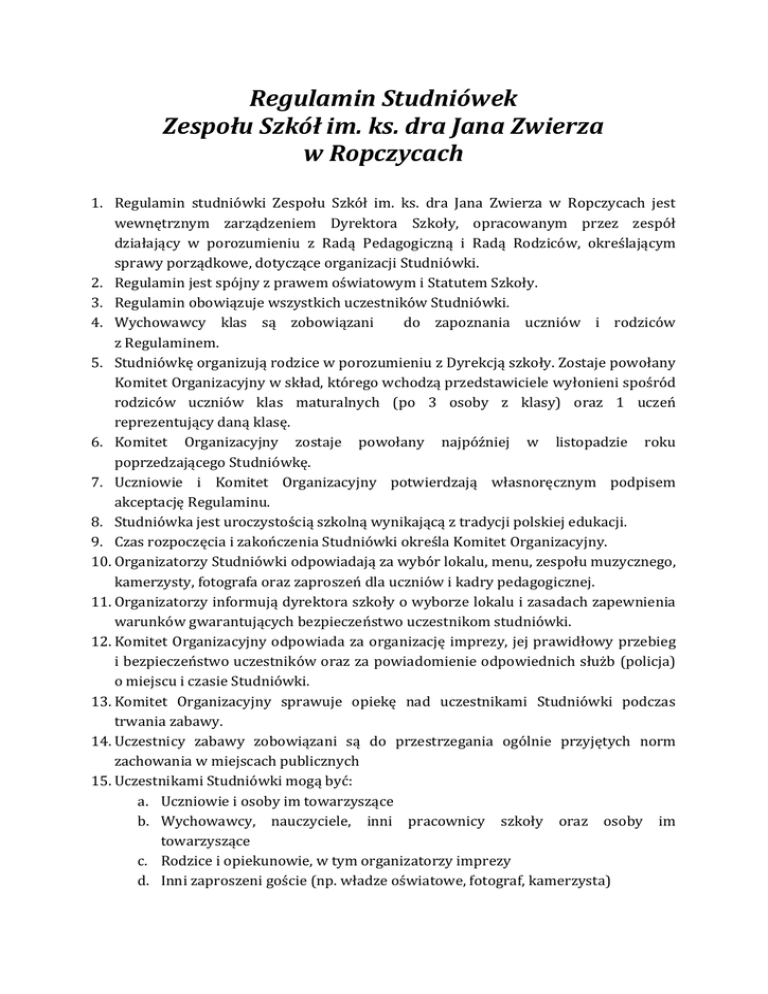 Regulamin Studniówek Zespołu Szkół im. ks. dra Jana Zwierza w Ropczycach 1. Regulamin studniówki Zespołu Szkół im. ks. dra Jana Zwierza w Ropczycach jest wewnętrznym zarządzeniem Dyrektora Szkoły, opracowanym przez zespół działający w porozumieniu z Radą Pedagogiczną i Radą Rodziców, określającym sprawy porządkowe, dotyczące organizacji Studniówki. 2. Regulamin jest spójny z prawem oświatowym i Statutem Szkoły. 3. Regulamin obowiązuje wszystkich uczestników Studniówki. 4. Wychowawcy klas są zobowiązani do zapoznania uczniów i rodziców z Regulaminem. 5. Studniówkę organizują rodzice w porozumieniu z Dyrekcją szkoły. Zostaje powołany Komitet Organizacyjny w skład, którego wchodzą przedstawiciele wyłonieni spośród rodziców uczniów klas maturalnych (po 3 osoby z klasy) oraz 1 uczeń reprezentujący daną klasę. 6. Komitet Organizacyjny zostaje powołany najpóźniej w listopadzie roku poprzedzającego Studniówkę. 7. Uczniowie i Komitet Organizacyjny potwierdzają własnoręcznym podpisem akceptację Regulaminu. 8. Studniówka jest uroczystością szkolną wynikającą z tradycji polskiej edukacji. 9. Czas rozpoczęcia i zakończenia Studniówki określa Komitet Organizacyjny. 10. Organizatorzy Studniówki odpowiadają za wybór lokalu, menu, zespołu muzycznego, kamerzysty, fotografa oraz zaproszeń dla uczniów i kadry pedagogicznej. 11. Organizatorzy informują dyrektora szkoły o wyborze lokalu i zasadach zapewnienia warunków gwarantujących bezpieczeństwo uczestnikom studniówki. 12. Komitet Organizacyjny odpowiada za organizację imprezy, jej prawidłowy przebieg i bezpieczeństwo uczestników oraz za powiadomienie odpowiednich służb (policja) o miejscu i czasie Studniówki. 13. Komitet Organizacyjny sprawuje opiekę nad uczestnikami Studniówki podczas trwania zabawy. 14. Uczestnicy zabawy zobowiązani są do przestrzegania ogólnie przyjętych norm zachowania w miejscach publicznych 15. Uczestnikami Studniówki mogą być: a. Uczniowie i osoby im towarzyszące b. Wychowawcy, nauczyciele, inni pracownicy szkoły oraz osoby im towarzyszące c. Rodzice i opiekunowie, w tym organizatorzy imprezy d. Inni zaproszeni goście (np. władze oświatowe, fotograf, kamerzysta) 16. Nauczyciele potwierdzają udział w Studniówce (koszty za osoby towarzyszące pokrywają sami nauczyciele). 17. Zasady dotyczące uczniów i osób im towarzyszącym: a. Uczniowie zapraszający osoby towarzyszące zobowiązani są podać wychowawcom (najpóźniej na 7 dni przed studniówką) dane osobowe zapraszanych osób (imię, nazwisko, adres). Dane zgodnie z ustawą o ochronie danych osobowych nie będą nikomu udostępniane i służą wyłącznie do celów organizacyjnych. b. Uczniowie zapraszający osoby towarzyszące ponoszą odpowiedzialność za ich zachowanie. c. Uczniowie odpowiadają finansowo za ewentualne szkody materialne wyrządzone przez siebie lub osoby przez nich zaproszone. 18. Podczas Studniówki obowiązuje całkowity zakaz wnoszenia i spożywania alkoholu zgodnie z art. 14 ust. 1pkt. 1 ustawy z dnia 26 października 1982 r. o wychowaniu w trzeźwości i przeciwdziałaniu alkoholizmowi z późniejszymi zmianami (Dz. U. 2002 nr 147 poz. 1231). 19. Podczas Studniówki obowiązuje całkowity zakaz używania środków odurzających (narkotyki, dopalacze, itp.) zgodnie z ustawa z dnia 24.04.1997 o przeciwdziałaniu narkomanii (Dz. U. 1997 nr 75, poz. 468). 20. Podczas Studniówki obowiązuje zakaz palenia papierosów poza wydzielonymi przez właściciela lokalu pomieszczeniami. 21. Uczestnicy Studniówki naruszający zasady organizacji i przebiegu imprezy zostaną pociągnięci do odpowiedzialności cywilnej i karnej. Poniosą oni również ewentualne koszty interwencji służb porządkowych i medycznych. 22. Zasady dotyczące wychowawców: a. Wychowawcy powinni mieć przy sobie spis telefonów, umożliwiający kontakt z poszczególnymi rodzicami. b. W przypadku naruszenia przez ucznia regulaminu wychowawca jest zobowiązany zawiadomić o incydencie rodziców. 23. Zasady dotyczące rodziców: a. Rodzice uczniów biorących udział w Studniówce udostępniają wychowawcom numery telefonów, umożliwiające natychmiastowy kontakt z nimi w czasie Studniówki. b. Rodzice zobowiązani są zapewnić swoim dzieciom bezpieczny powrót do domu. c. Rodzice sprawujący opiekę nad uczniami podczas Studniówki powinni kontrolować przestrzeganie Regulaminu przez uczestników zabawy. 24. W przypadku nieakceptowania niniejszego Regulaminu przez Komitet Organizacyjny i uczniów zabawa traci status imprezy szkolnej Zespołu Szkół im. ks. dra Jana Zwierza w Ropczycach, zwanej Studniówką, a Dyrektor i grono pedagogiczne nie wyrażają zgody na udział w imprezie.