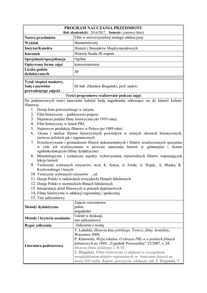 PROGRAM NAUCZANIA PRZEDMIOTU Rok akademicki: 2016/2017, Semestr: (zimowy-letni) Nazwa przedmiotu Wydział Instytut/Katedra Kierunek Specjalność/specjalizacja Opisywana forma zajęć Liczba godzin dydaktycznych Tytuł /stopień naukowy. Imię i nazwisko prowadzącego zajęcia Film w uniwersyteckiej strategii edukacyjnej Humanistyczny Historii i Stosunków Międzynarodowych Historia Studia III stopnia Ogólna konwersatorium 30 Dr hab. Zdzisław Biegański, prof. nadzw. Treści programowe realizowane podczas zajęć Do podstawowych treści nauczania należeć będą zagadnienia odnoszące się do historii kultury filmowej: 1. Dzieje kina powszechnego w zarysie, 2. Film historyczny – podstawowe pojęcia 3. Najstarsze polskie filmy historyczne (do 1939 roku) 4. Film historyczny w latach PRL 5. Najnowsze produkcje filmowe w Polsce (po 1989 roku) 6. Ocena i analiza filmów historycznych powstałych w różnych okresach historycznych, zarówno polskich jak i zagranicznych 7. Przechowywanie i gromadzenie filmów dokumentalnych i filmów zrealizowanych specjalnie w celu ich wykorzystania w procesie nauczania historii w gimnazjum i liceum ogólnokształcącym (filmy dydaktyczne) 8. Metodologiczne i techniczne aspekty wykorzystania różnorodnych filmów wspierających lekcje historii 9. Twórczość wybranych reżyserów, m.in. K. Kutza, A. Forda, A. Wajdy, A. Munka, K. Kieślowskiego i innych 10. Twórczość wybranych reżyserów …cd. 11. Dzieje Polski w radzieckich (rosyjskich) filmach fabularnych 12. Dzieje Polski w niemieckich filmach fabularnych 13. Interpretacje dzieł filmowych w pracach dyplomowych 14. Filmy historyczne w edukacji regionalnej i społecznej 15. Test zaliczeniowy Zajęcia warsztatowe pokaz Metody dydaktyczne pogadanka Udział w dyskusji, Metody i kryteria oceniania test zaliczeniowy Zaliczenie z oceną Rygor zaliczenia T. Lubelski, Historia kina polskiego. Twórcy, filmy, konteksty, Warszawa 2009; P. Kletowski, Wizja lokalna. O obrazie PRL-u w polskich filmach fabularnych po 1989, „Tygodnik Powszechny" 22/2007, s. 24; Literatura podstawowa Historia filmu polskiego, t. II-VI ; Z. Biegański, Filmy historyczne w edukacji ze szczególnym uwzględnieniem dziejów regionalnych, w: Nauczanie historii na miarę XXI wieku. Region, patriotyzm, edukacja, red. Z. Biegański, T. Literatura uzupełniająca Maresz, Bydgoszcz 2010, s. 114-128; M. Henrykowski, Film jako źródło historyczne, Poznań 2000; J. Płażewski, Historia filmu 1895-2005, Warszawa 2006; Historia filmu polskiego, t. I-VI, Warszawa 1966-1994; Encyklopedia kultury polskiej XX w. Film, kinematografia, pod red. E. Zajička, Warszawa 1994; Kino ma sto lat. Dekada po dekadzie, red. J. Rek, E. Ostrowska, Łódź 1998; Kino w dziesięciu sekwencjach, red. E. Nurczyńska-Fidelska, Łódź 1996; P. Zwierzchowski, Zapomniani bohaterowie. O bohaterach filmowych polskiego socrealizmu, Warszawa 2000. Kino polskie po 1989 roku, red. P. Zwierzchowski, D. Mazur, Bydgoszcz 2006; D. Skotarczuk, Obraz społeczeństwa PRL w komedii filmowej, Poznań 2004; D. Konieczka-Śliwińska, Filmy i programy telewizyjne w szkolnej edukacji historycznej, „Wiadomości Historyczne” 2008, nr 3; Multimedia w edukacji historycznej i społecznej, red. J. Rulka, B. Tarnowska, Bydgoszcz 2002; M. Guzek, Filmowa Bydgoszcz 1896-1939, Warszawa 2004; P. Zwierzchowski, Czy „Sąsiedzi” opowiadają o sąsiadach? Filmowa wizja bydgoskiego września 1939, „Kwartalnik Filmowy”, 2003, nr 43. www.Film polski.pl