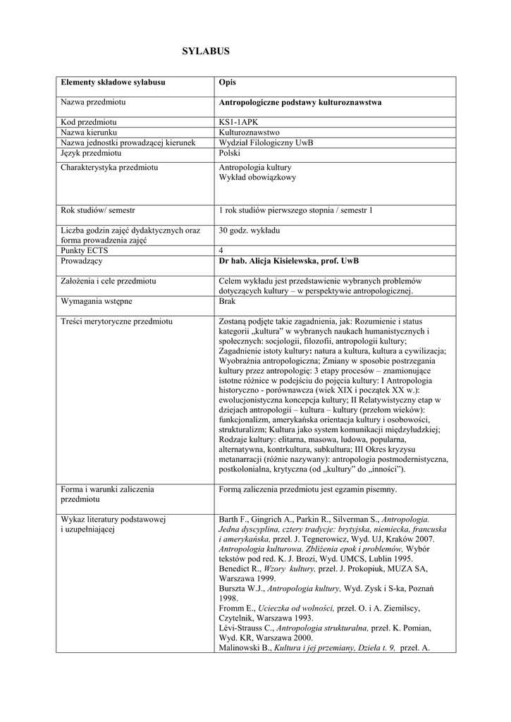 SYLABUS Elementy składowe sylabusu Opis Nazwa przedmiotu Antropologiczne podstawy kulturoznawstwa Kod przedmiotu Nazwa kierunku Nazwa jednostki prowadzącej kierunek Język przedmiotu KS1-1APK Kulturoznawstwo Wydział Filologiczny UwB Polski Charakterystyka przedmiotu Antropologia kultury Wykład obowiązkowy Rok studiów/ semestr 1 rok studiów pierwszego stopnia / semestr 1 Liczba godzin zajęć dydaktycznych oraz forma prowadzenia zajęć Punkty ECTS Prowadzący 30 godz. wykładu Założenia i cele przedmiotu Celem wykładu jest przedstawienie wybranych problemów dotyczących kultury – w perspektywie antropologicznej. Brak Wymagania wstępne 4 Dr hab. Alicja Kisielewska, prof. UwB Treści merytoryczne przedmiotu Zostaną podjęte takie zagadnienia, jak: Rozumienie i status kategorii „kultura” w wybranych naukach humanistycznych i społecznych: socjologii, filozofii, antropologii kultury; Zagadnienie istoty kultury: natura a kultura, kultura a cywilizacja; Wyobraźnia antropologiczna; Zmiany w sposobie postrzegania kultury przez antropologię: 3 etapy procesów – znamionujące istotne różnice w podejściu do pojęcia kultury: I Antropologia historyczno - porównawcza (wiek XIX i początek XX w.): ewolucjonistyczna koncepcja kultury; II Relatywistyczny etap w dziejach antropologii – kultura – kultury (przełom wieków): funkcjonalizm, amerykańska orientacja kultury i osobowości, strukturalizm; Kultura jako system komunikacji międzyludzkiej; Rodzaje kultury: elitarna, masowa, ludowa, popularna, alternatywna, kontrkultura, subkultura; III Okres kryzysu metanarracji (różnie nazywany): antropologia postmodernistyczna, postkolonialna, krytyczna (od „kultury” do „inności”). Forma i warunki zaliczenia przedmiotu Formą zaliczenia przedmiotu jest egzamin pisemny. Wykaz literatury podstawowej i uzupełniającej Barth F., Gingrich A., Parkin R., Silverman S., Antropologia. Jedna dyscyplina, cztery tradycje: brytyjska, niemiecka, francuska i amerykańska, przeł. J. Tegnerowicz, Wyd. UJ, Kraków 2007. Antropologia kulturowa. Zbliżenia epok i problemów, Wybór tekstów pod red. K. J. Brozi, Wyd. UMCS, Lublin 1995. Benedict R., Wzory kultury, przeł. J. Prokopiuk, MUZA SA, Warszawa 1999. Burszta W.J., Antropologia kultury, Wyd. Zysk i S-ka, Poznań 1998. Fromm E., Ucieczka od wolności, przeł. O. i A. Ziemilscy, Czytelnik, Warszawa 1993. Lévi-Strauss C., Antropologia strukturalna, przeł. K. Pomian, Wyd. KR, Warszawa 2000. Malinowski B., Kultura i jej przemiany, Dzieła t. 9, przeł. A. Bydłoń i A. Mach, PWN, Warszawa 2000. Nowicka E., Świat człowieka – świat kultury, PWN, Warszawa 1997. Olszewska-Dyoniziak B., Człowiek-kultura-osobowość. Wstęp do klasycznej antropologii kulturowej, Atla 2, Wrocław 2001.