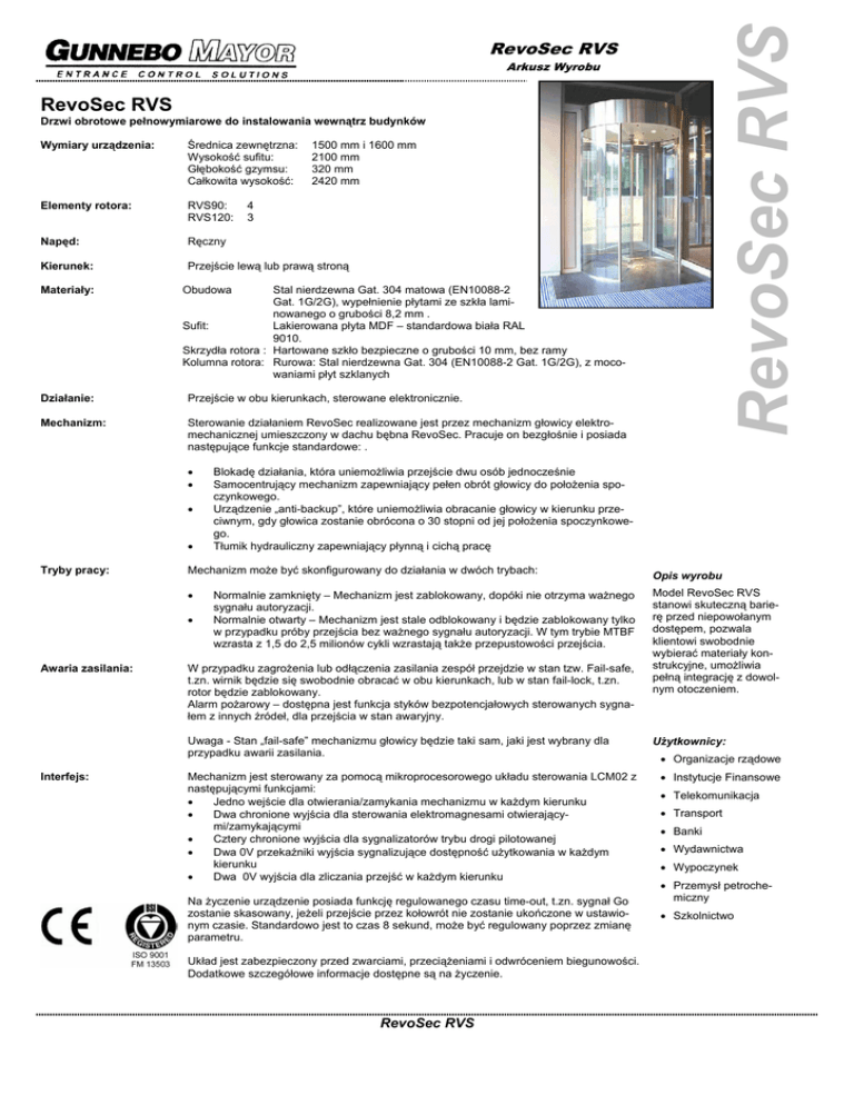 RevoSec RVS RevoSec RVS Arkusz Wyrobu RevoSec RVS Drzwi obrotowe pełnowymiarowe do instalowania wewnątrz budynków Wymiary urządzenia: Średnica zewnętrzna: Wysokość sufitu: Głębokość gzymsu: Całkowita wysokość: Elementy rotora: RVS90: RVS120: Napęd: Ręczny Kierunek: Przejście lewą lub prawą stroną Materiały: 1500 mm i 1600 mm 2100 mm 320 mm 2420 mm 4 3 Obudowa Stal nierdzewna Gat. 304 matowa (EN10088-2 Gat. 1G/2G), wypełnienie płytami ze szkła laminowanego o grubości 8,2 mm . Sufit: Lakierowana płyta MDF – standardowa biała RAL 9010. Skrzydła rotora : Hartowane szkło bezpieczne o grubości 10 mm, bez ramy Kolumna rotora: Rurowa: Stal nierdzewna Gat. 304 (EN10088-2 Gat. 1G/2G), z mocowaniami płyt szklanych Działanie: Przejście w obu kierunkach, sterowane elektronicznie. Mechanizm: Sterowanie działaniem RevoSec realizowane jest przez mechanizm głowicy elektromechanicznej umieszczony w dachu bębna RevoSec. Pracuje on bezgłośnie i posiada następujące funkcje standardowe: . • • • • Tryby pracy: Mechanizm może być skonfigurowany do działania w dwóch trybach: • • Awaria zasilania: Blokadę działania, która uniemożliwia przejście dwu osób jednocześnie Samocentrujący mechanizm zapewniający pełen obrót głowicy do położenia spoczynkowego. Urządzenie „anti-backup”, które uniemożliwia obracanie głowicy w kierunku przeciwnym, gdy głowica zostanie obrócona o 30 stopni od jej położenia spoczynkowego. Tłumik hydrauliczny zapewniający płynną i cichą pracę Normalnie zamknięty – Mechanizm jest zablokowany, dopóki nie otrzyma ważnego sygnału autoryzacji. Normalnie otwarty – Mechanizm jest stale odblokowany i będzie zablokowany tylko w przypadku próby przejścia bez ważnego sygnału autoryzacji. W tym trybie MTBF wzrasta z 1,5 do 2,5 milionów cykli wzrastają także przepustowości przejścia. W przypadku zagrożenia lub odłączenia zasilania zespół przejdzie w stan tzw. Fail-safe, t.zn. wirnik będzie się swobodnie obracać w obu kierunkach, lub w stan fail-lock, t.zn. rotor będzie zablokowany. Alarm pożarowy – dostępna jest funkcja styków bezpotencjałowych sterowanych sygnałem z innych źródeł, dla przejścia w stan awaryjny. Uwaga - Stan „fail-safe” mechanizmu głowicy będzie taki sam, jaki jest wybrany dla przypadku awarii zasilania. Interfejs: Mechanizm jest sterowany za pomocą mikroprocesorowego układu sterowania LCM02 z następującymi funkcjami: • Jedno wejście dla otwierania/zamykania mechanizmu w każdym kierunku • Dwa chronione wyjścia dla sterowania elektromagnesami otwierającymi/zamykającymi • Cztery chronione wyjścia dla sygnalizatorów trybu drogi pilotowanej • Dwa 0V przekaźniki wyjścia sygnalizujące dostępność użytkowania w każdym kierunku • Dwa 0V wyjścia dla zliczania przejść w każdym kierunku Na życzenie urządzenie posiada funkcję regulowanego czasu time-out, t.zn. sygnał Go zostanie skasowany, jeżeli przejście przez kołowrót nie zostanie ukończone w ustawionym czasie. Standardowo jest to czas 8 sekund, może być regulowany poprzez zmianę parametru. Układ jest zabezpieczony przed zwarciami, przeciążeniami i odwróceniem biegunowości. Dodatkowe szczegółowe informacje dostępne są na życzenie. RevoSec RVS Opis wyrobu Model RevoSec RVS stanowi skuteczną barierę przed niepowołanym dostępem, pozwala klientowi swobodnie wybierać materiały konstrukcyjne, umożliwia pełną integrację z dowolnym otoczeniem. Użytkownicy: • Organizacje rządowe • Instytucje Finansowe • Telekomunikacja • Transport • Banki • Wydawnictwa • Wypoczynek • Przemysł petrochemiczny • Szkolnictwo RevoSec RVS Arkusz Wyrobu Zabezpieczenie: By uniemożliwić przejście przez „martwą strefę”, w suficie przejścia zainstalowany jest czujnik do wykrywania niewłaściwego użycia. W takim przypadku drzwi zostaną w tym kierunku zablokowane, a następnie zwolnione, poprzez wyłącznik zainstalowany w cokole górnym. Podświetlenie: Standardowo zainstalowane są lampy podświetlenia. Obsługa serwisowa: Poprzez włazy w suficie przejścia i/lub od góry. Zasilanie: 115/230 V prąd zmienny 50/60 Hz. Moc znamionowa: 110 VA Napięcie sterowania: 24 V prąd stały Szczegóły instalowania: Modele RevoSec RVS są dostarczane w zestawie częściowo zmontowanych zespołów, t.zn. skrzydła, rama i kolumna, które mogą wymagać podnośnika dla rozładunku. Przybliżony ciężar 500 kg, zależnie od specyfikacji. Dostępne modele Ręczny kołowrót RevoSec do instalowania wewnątrz • • Model RVS 90 Model RVS 120 Średnica 1500 lub 1600 mm z bezramowym hartowanym szkłem bezpiecznym o grubości 10 mm (detekcja IR) Średnica 1500 lub 1600 mm z bezramowym hartowanym szkłem bezpiecznym o grubości 10 mm (detekcja IR) • • Model RVS 90FP Model RVS 120FP Średnica 1500 lub 1600 mm z obramowanym rotorem szklanym z/bez uszczelnień taśmami szczotkowymi (detekcja IR) Średnica 1500 lub 1600 mm z obramowanym rotorem szklanym z/bez uszczelnień taśmami szczotkowymi (detekcja IR) • • Model RVS 90SL Model RVS 120SL Średnica 1500 lub 1600 mm z rotorem listwowym i prętami statora (bez detekcji IR) Średnica 1500 lub 1600 mm z rotorem listwowym i prętami statora (bez detekcji IR) Akcesoria i dodatki opcjonalne Alternatywne materiały i wykończenia • Wymagania konstrukcyjne dotyczące materiałów specjalnych – patrz Gunnebo Mayor. • Alternatywne kolory RAL epoksydowego lakieru proszkowego. • Szyby przyciemniane. • 11,4 mm grubości 3-warstwowe szkło przeciw-włamaniowe z warstwą poliwęglanową. • Płyty wykładzin bębna mogą być zastąpione pełnymi płytami. • Powiększona wysokość cokołu górnego. Mocowanie czytników kart • Czytniki dostarczone przez odbiorcę mogą być wbudowane do kolumn obudowy RVS. • Podstawy do montowania czytników kart. Lampki statusu • Wyświetlacze diodowe Czerwonego Przekreślenia i Zi
