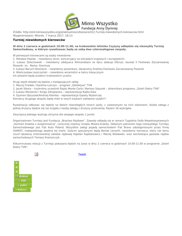 Źródło: http://old.mimowszystko.org/pl/aktualnosci/biezace/412,Turniej-niewidomych-kierowcow.html Wygenerowano: Wtorek, 7 marca 2017, 18:13 Turniej niewidomych kierowców W dniu 2 czerwca w godzinach 10.00-11.00, na krakowskim lotnisku Czyżyny odbędzie się niezwykły Turniej Samochodowy, w którym rywalizowac będą ze sobą dwa czterozałogowe zespoły. W pierwszym kierowcami są osoby niewidome: 1. Wiesław Pawlak – niewidomy tenor, koncerujący na estradach krajowych i europejskich. 2. Łukasz Żelechowski – niewidomy zdobywca Kilimandżaro (w lipcu atakuje Elbrus), laureat II Festiwalu Zaczarowanej Piosenki im. Marka Grechuty 3. Łukasz Baruch-Skoniecki – niewidomy piosenkarz, dwukrotny finalista Festiwalu Zaczarowanej Piosenki 4. Wieńczysław Leszczyński – niewidomy wicemistrz w tańcu klasycznym Ich pilotami będą studenci krakowskich uczelni. Drugi zepół składał się będzie z następujących załóg: 1. Maciej Friedek / Karolina Lutczyn – program „Detektywi” TVN 2. Jacek Sikora – trzykrotny uczestnik Rajdu Monte Carlo / Bartosz Szpurek – dziennikarz programu „Dzień Dobry TVN” 3. Łukasz Mordarski / Kinga Zdrojewska – reprezentacja Radia Eska 4. Szymon Opryszek/Andrzej Klemba – reprezentacja Gazety Wyborczej Kierowcy drugiego zespołu będą mieli w swych kaskach zaklejone szybki!!! Rywalizacja odbywac się będzie na dwóch równoległych torach jazdy, z ustawionymi na nich slalomami. Każda załoga z jednej drużyny będzie się raz ścigała z każdą załogą z drużyny przeciwnej. Razem 16 wyścigów. Zwycięzca jednego wyścigu otrzyma dla swojego zespołu 1 punkt. Organizatorem Turnieju jest Fundacja „Bractwo Rajdowe”. Zawody odbędą się w ramach Tygodnia Osób Niepełnosprawnych „Kocham Kraków z wzajemnością”, corocznej imprezy Urzędu Miasta Kraków. Głównym patronem tego niezwykłego Turnieju Samochodowego jest Fiat Auto Poland. Wszystkie załogi pojadą samochodami Fiat Bravo udostępnionymi przez firmę VIAMOT, małopolskiego dealera tej marki. Goścmi specjalnymi będą Bartek Lenarth, niewidomy kierowca, który rok temu rzucił rękawicę mistrzowskiej załodze rajdowej Kajetan Kajetanowicz / Maciej Wisławski, oraz wschodząca gwiazda rajdów samochodowych Tomasz Kramarczyk. Kilkuminutowa relacja z Turnieju pokazana będzie na żywo w dniu 2 czerwca w godzinach 10.00-11.00 w programie „Dzień Dobry TVN”. Tweet