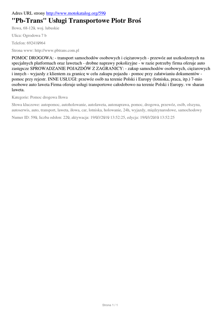 Adres URL strony http://www.motokatalog.org/590 "Pb-Trans" Usługi Transportowe Piotr Broś Iłowa, 68-120, woj. lubuskie Ulica: Ogrodowa 7 b Telefon: 692410964 Strona www: http://www.pbtrans.com.pl POMOC DROGOWA: - transport samochodów osobowych i ciężarowych - przewóz aut uszkodzonych na specjalnych platformach oraz lawetach - drobne naprawy pokolizyjne - w razie potrzeby firma oferuje auto zastępcze SPROWADZANIE POJAZDÓW Z ZAGRANICY: - zakup samochodów osobowych, ciężarowych i innych - wyjazdy z klientem za granicę w celu zakupu pojazdu - pomoc przy załatwianiu dokumentów pomoc przy rejestr. INNE USŁUGI: przewóz osób na terenie Polski i Europy (lotniska, praca, itp.) 7-mio osobowe auto laweta Firma oferuje usługi transportowe całodobowo na terenie Polski i Europy. vw sharan laweta. Kategorie: Pomoc drogowa Iłowa Słowa kluczowe: autopomoc, autoholowanie, autolaweta, autonaprawa, pomoc, drogowa, przewóz, osób, olszyna, autoserwis, auto, transport, laweta, iłowa, car, lotniska, holowanie, 24h, wyjazdy, międzynarodowe, samochodowy Numer ID: 590, liczba odsłon: 220, aktywacja: 19/03/2010 13:52:25, edycja: 19/03/2010 13:52:25 Strona 1 / 1