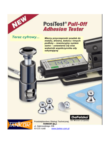Teraz cyfrowy... Mierzy przyczepność powłok do metalu, drewna, betonu i innych podłoży – rewolucyjny system samo – ustawiania się oraz wskaźnik współczynnika siły odrywającej Przedsiębiorstwo Obsługi Technicznej TANKOR Sp.j. ul. Dąbrowskiego 238 93-231 Łódź www.tankor.com.pl TANKOR Odrywowy miernik przyczepności Mierzy siłę potrzebną do oderwania od podłoża obszaru testowego powłoki o określonej średnicy. Siła odrywająca wytwarzana jest przy pomocy siłownika hydraulicznego. Wartość ciśnienia wyświetlana jest w psi lub MPa na precyzyjnym cyfrowym wyświetlaczu. Odporna na warunki klimatyczne, wykonana z jednego kawałka metalowa obudowa Przemysłowa pompa hydrauliczna skonstruowana w celu wytwarzania łagodnego i ciągłego wzrostu ciśnienia w trakcie suwu Możliwość dotarcia do miejsc trudno dostępnych dzięki długiemu (1.5 m) elastycznemu wężowi Port USB do transferu danych do komputera Szybkozłącze samonastawne do mocowania stempli do siłownika Frez do odcięcia obszaru testowego Jednorazowe samonastawne stemple zapewniają poprawne testy Prosty Dokładny ■ Przenośny, ręczny instrument nie wymagający zewnętrznego zasilania – idealny do pracy w laboratorium i w terenie ■ Duży, czytelny ekran LCD ■ Wskaźnik Siły Odrywającej - ułatwia operatorowi monitorowania i dostosowywania siły ciągnącej do międzynarodowych metod badawczych ■ Łatwy – jednym klawiszem - dobór rozmiaru stempli, zmiany jednostki pomiarowej i przechowywania odczytów ■ Nie ma potrzeby stosowania tablic przeliczeniowych – miernik automatycznie przelicza ciśnienie w oparciu o rozmiar stempla ■ Niedrogie, jednorazowe stemple eliminują ich czyszczenie do ponownego użycia ■ Każdy zestaw dostarczany jest ze wszystkim co potrzebne do pomiarów ■ Każdy system ciśnieniowy mierników PosiTest Adhesion Tester jest kalibrowany i certyfikowany z dokładnością ±1% przy pomocy zgodnej z NIST celi ciśnieniowej ■ Samodzielnie ustawiające się stemple umożliwiają dokładne pomiary na miękkich lub nierównych powierzchniach ■ Wysokiej jakości, przemysłowy czujnik ciśnienia zapewnia ciągłą dokładność ■ Zgodny z normami ASTM D4541, ISO 4624 i innymi Trwały ■ Wodoszczelny, pyłoszczelny i odporny na wstrząsy ■ Wysokiej jakości pompa hydrauliczna może pracować w każdej pozycji ■ Kuferek ze sztywnego plastiku ■ Roczna gwarancja WP 2008 Uniwersalny ■ W pamięci wewnętrznej zapisywane jest maksymalne ciśnienie odrywające, wskaźnik ciągnięcia, czas trwania testu i rozmiar stempla do 200 testów ■ W opcji dostępne oprogramowanie PosiSoft® do transferu danych do komputera ■ Stemple o średnicy 10, 14, 20 lub 50 mm maksymalizują obszar zastosowania i dokładność w szerokim zakresie przyczepności ■ Na ekranie LCD wartość ciśnienia wyświetlana jest w psi lub MPa TANKOR Stemple Testowe: w miernik PosiTest Adhesion Tester stosowane są niedrogie aluminiowe stemple jednorazowego użytku odpowiadające międzynarodowym normom i praktyce badawczej. Dostępne w następujących wymiarach; 10, 14, 20 i 50 mm średnicy powierzchni testowej dla różnych kształtów i siły przyczepności Mienik PosiTest Adhesion Teste kompensuje nierówności Wyjatkowa sferyczna przegubowa głowica stempla łączy się z pierścieniem małyego łożyska kulkowego, zapewniając prawidłowe ułożenie. Tę cechę posiada wyłącznie PosiTest Adhesion Tester Stała siła odrywania Funkcja samoczynnego nastawiania Nierówna siła ciągnięcia w trakcie testu spowodowana nierównymi liniami wiązania kleju i powierzchni powłoki może spowodować przypadkowe niewytłumaczalne odczyty. W celu uzyskania bardziej powtarzalnych i wartościowych pomiarów przyczepności istotne jest by siła odrywająca przyłożona do stempla testowego była równomiernie rozłożona na całej powierzchni testowej. Samoczynnie nastawiające się stemple umożliwiają równomierne rozłożenie siły odrywającej na całej powierzchni testowej zapobiegając oderwaniu się stempla z jednej strony. Stabilność Szybkie przyłączenie Przyczepność (nierówna siłą wiązania kleju) Powłoka Podłoże Nowy cyfrowy LCD (w naturalnej wielkości) Duży, czytelny ekran LCD wyświetla ciśnienie podczas pomiaru i zachowuje wartość maksymalną Wskaźnik Przyrostu Siły Odrywającej ułatwia nadzór i dostosowanie przyrostu siły odrywającej (psi/s lub MPa/s) Symbol słabej baterii Ikona trybu pamięci pokazuje, że w pamięci są dane On/Start przygotowuje tester do następnego pomiaru PosiSoft® Software for Windows® (w opcji) ■ ■ ■ ■ ■ Klawisz wprowadzania do pamięci i przeglądania danych Wybór rozmiaru stempla Zmiana jednostki pomiarowej Wyświetla ciśnienie, współczynnik, czas trwania testu i rozmiar stempla dla nawet 200 testów Idealne rozwiązanie w razie konieczności dokumentowana danych w formie wydruków lub w pamięci PC-ta Umożliwia wprowadzanie uwag i notatek Wielojęzyczne menu (angielski, niemiecki, włoski, hiszpański i francuski) Eksport danych do dokumentów i arkuszy kalkulacyjnych W komplecie kabel USB do podłączenia PC-ta Wylicza maks, min, średnią i odchylenie stand. Drukuje i wyświetla wykresy i histogramy Wizualizacja w czasie rzeczywistym poszczególnych testów w celu szczegółowej analizy WP 2008 TANKOR Charakterystyka Rozmiar stempla 20 mm Rozdzielczość ± 0,01 MPa (± ±1 psi) Dokładność ± 1 % skali Przyczepność 0 – 20 MPa (0 – 3000 psi) Każdy zestaw zawiera: Waga zestawu (z kuferkiem): 5.5 kg Rozmiary kuferka: D – 43 cm × S – 33 cm × W – 15 cm ■ ■ ■ ■ ■ ■ ■ ■ ■ ■ ■ ■ Tester przyczepności z ekranem cyfrowym 20 mm aluminiowe stemple testowe (20 sztuk) Włókninę ścierną Frez Klej z mieszadełkami i paletkami Waciki bawełniane AAA baterie (2) Broszura instrukcji (także w języku polskim) Certyfikat Kalibracji zgodny z NIST Instruktażowy film video 12-to miesi