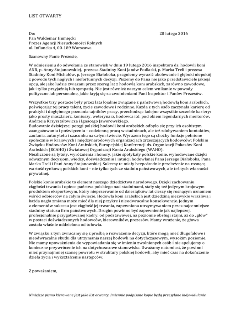 LIST OTWARTY Do: Pan Waldemar Humięcki Prezes Agencji Nieruchomości Rolnych ul. Inflancka 4, 00-‐189 Warszawa 20 lutego 2016 Szanowny Panie Prezesie, W odniesieniu do odwołania ze stanowisk w dniu 19 lutego 2016 inspektora ds. hodowli koni ANR, p. Anny Stojanowskiej, prezesa Stadniny Koni Janów Podlaski, p. Marka Treli i prezesa Stadniny Koni Michałów, p. Jerzego Białoboka, pragniemy wyrazić ubolewanie i głęboki niepokój z powodu tych nagłych i niefortunnych decyzji. Piszemy do Pana nie jako przedstawiciele jakiejś opcji, ale jako ludzie związani przez szereg lat z hodowlą koni arabskich, zarówno zawodowo, jak i tylko przyjaźnią lub sympatią. Nie jest również naszym celem wnikanie w powody polityczne lub personalne, jakie kryją się za zwolnieniami Pani Inspektor i Panów Prezesów. Wszystkie trzy postacie były przez lata lojalnie związane z państwową hodowlą koni arabskich, poświęcając tej pracy talent, życie zawodowe i rodzinne. Każda z tych osób zaczynała karierę od praktyki i dogłębnego poznania tajników pracy, przechodząc kolejno wszystkie szczeble kariery: jako prosty masztalerz, koniuszy, weterynarz, hodowca itd. pod okiem legendarnych mentorów, Andrzeja Krzyształowicza i Ignacego Jaworowskiego. Budowanie dzisiejszej potęgi polskiej hodowli koni arabskich odbyło się przy ich osobistym zaangażowaniu i poświęceniu – codzienną pracą w stadninach, ale też zdobywaniem kontaktów, zaufania, autorytetu i szacunku na całym świecie. Wyrazem tego są choćby funkcje pełnione społecznie w krajowych i międzynarodowych organizacjach zrzeszających hodowców: Polskim Związku Hodowców Koni Arabskich, Europejskiej Konferencji ds. Organizacji Pokazów Koni Arabskich (ECAHO) i Światowej Organizacji Konia Arabskiego (WAHO). Niezliczone są tytuły, wyróżnienia i honory, jakie spotykały polskie konie, wyhodowane dzięki odważnym decyzjom, wiedzy, doświadczeniu i intuicji hodowlanej Pana Jerzego Białoboka, Pana Marka Treli i Pani Anny Stojanowskiej. Sukcesy te miały bezpośrednie przełożenie na rosnącą wartość rynkową polskich koni – nie tylko tych ze stadnin państwowych, ale też tych własności prywatnej. Polskie konie arabskie to element naszego dziedzictwa narodowego. Dzięki zachowaniu ciągłości trwania i opiece państwa polskiego nad stadninami, stały się też jedynym krajowym produktem eksportowym, który nieprzerwanie od dziesiątków lat cieszy się rosnącym uznaniem wśród odbiorców na całym świecie. Hodowla koni arabskich jest dziedziną niezwykle wrażliwą i każda nagła zmiana może mieć dla niej przykre i nieodwracalne konsekwencje. Jednym z elementów sukcesu jest ciągłość jej trwania, zapewniona utrzymywaniem przez najcenniejsze stadniny statusu firm państwowych. Drugim powinno być zapewnienie jak najlepszej, profesjonalnie przygotowanej kadry: od podstawowej, na poziomie obsługi stajni, aż do „głów“ w postaci doświadczonych hodowców, kierowników, prezesów. Mamy wrażenie, że głowa została właśnie oddzielona od tułowia. W związku z tym zwracamy się z prośbą o rozważenie decyzji, które mogą mieć długofalowe i nieodwracalne skutki dla utrzymania naszej hodowli na dotychczasowym, wysokim poziomie. Nie mamy upoważnienia do wypowiadania się w imieniu zwolnionych osób i nie apelujemy o konieczne przywrócenie ich na dotychczasowe stanowiska. Uważamy natomiast, że powinni mieć przynajmniej szansę powrotu w struktury polskiej hodowli, aby mieć czas na dokończenie dzieła życia i wykształcenie następców. Z poważaniem, Niniejsze pismo kierowane jest jako list otwarty. Imiennie podpisane kopie będą przesyłane indywidulanie.
