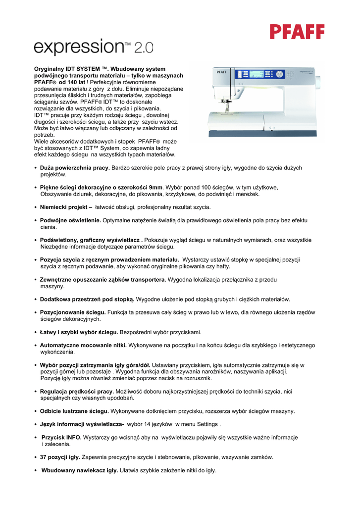 Oryginalny IDT SYSTEM ™. Wbudowany system podwójnego transportu materiału – tylko w maszynach PFAFF® od 140 lat ! Perfekcyjnie równomierne podawanie materiału z góry z dołu. Eliminuje niepożądane przesunięcia śliskich i trudnych materiałów, zapobiega ściąganiu szwów. PFAFF® IDT™ to doskonałe rozwiązanie dla wszystkich, do szycia i pikowania. IDT™ pracuje przy każdym rodzaju ściegu , dowolnej długości i szerokości ściegu, a także przy szyciu wstecz. Może być łatwo włączany lub odłączany w zależności od potrzeb. Wiele akcesoriów dodatkowych i stopek PFAFF® może być stosowanych z IDT™ System, co zapewnia ładny efekt każdego ściegu na wszystkich typach materiałów. Duża powierzchnia pracy. Bardzo szerokie pole pracy z prawej strony igły, wygodne do szycia dużych projektów. Piękne ściegi dekoracyjne o szerokości 9mm. Wybór ponad 100 ściegów, w tym użytkowe, Obszywanie dziurek, dekoracyjne, do pikowania, krzyżykowe, do podwinięć i mereżek. Niemiecki projekt – łatwość obsługi, profesjonalny rezultat szycia. Podwójne oświetlenie. Optymalne natężenie światłą dla prawidłowego oświetlenia pola pracy bez efektu cienia. Podświetlony, graficzny wyświetlacz . Pokazuje wygląd ściegu w naturalnych wymiarach, oraz wszystkie Niezbędne informacje dotyczące parametrów ściegu. Pozycja szycia z ręcznym prowadzeniem materiału. Wystarczy ustawić stopkę w specjalnej pozycji szycia z ręcznym podawanie, aby wykonać oryginalne pikowania czy hafty. Zewnętrzne opuszczanie ząbków transportera. Wygodna lokalizacja przełącznika z przodu maszyny. Dodatkowa przestrzeń pod stopką. Wygodne ułożenie pod stopką grubych i ciężkich materiałów. Pozycjonowanie ściegu. Funkcja ta przesuwa cały ścieg w prawo lub w lewo, dla równego ułożenia rzędów ściegów dekoracyjnych. Łatwy i szybki wybór ściegu. Bezpośredni wybór przyciskami. Automatyczne mocowanie nitki. Wykonywane na początku i na końcu ściegu dla szybkiego i estetycznego wykończenia. Wybór pozycji zatrzymania igły góra/dół. Ustawiany przyciskiem, igła automatycznie zatrzymuje się w pozycji górnej lub pozostaje . Wygodna funkcja dla obszywania narożników, naszywania aplikacji. Pozycję igły można również zmieniać poprzez nacisk na rozrusznik. Regulacja prędkości pracy. Możliwość doboru najkorzystniejszej prędkości do techniki szycia, nici specjalnych czy własnych upodobań. Odbicie lustrzane ściegu. Wykonywane dotknięciem przycisku, rozszerza wybór ściegów maszyny. Język informacji wyświetlacza- wybór 14 języków w menu Settings . Przycisk INFO. Wystarczy go wcisnąć aby na wyświetlaczu pojawiły się wszystkie ważne informacje i zalecenia. 37 pozycji igły. Zapewnia precyzyjne szycie i stebnowanie, pikowanie, wszywanie zamków. Wbudowany nawlekacz igły. Ułatwia szybkie założenie nitki do igły. Duża płytka igłowa. Linie prowadzące z prawej i lewej strony igły ułatwiają prowadzenie materiału. Stopki mocowane na zatrzask. Prosta wymiana, bez używania śrubokręta lub innych narzędzi. Wygodne zakładanie dolnej szpulki „ od góry”. Napełnianie dolnej szpulki przez igłę. Eliminuje wielokrotne zakładanie nitki do igły. Napełnianie zostaje automatycznie przerwane gdy szpulka jest pełna. Ciągłe szycie wstecz. Ręce pozostają wolne do prowadzenia materiału. Stopka Sensormatic do obszywania dziurek. Profesjonalny wygląd dziurki na każdym rodzaju materiału, powtarzalność identycznych dziurek. Electroniczna regulacja siły wkłucia igły. Pełna siła wkłucia niezależnie od prędkości pracy. Przymiar do pomiaru guzików. Pomaga szybko określić wielkość dziurki . Dwa wbudowane trzpienie na szpulki nici. Dla igieł podwójnych lub technik specjalnych. Akcesoria standardowe – 0A – stopka standardowa z IDT™, 1A – stopka do ściegów ozdobnych z IDT™, 2A- stopka do ściegów ozdobnych, 3-stopka do ściegu krytego z IDT™, 4 – stopka do zamków z IDT™, 5A – stopka Sensormatic do dziurek