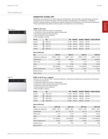 Katalog TD 2015 68 | 69 Konwektory Konwektory są przystosowane do całorocznego lub przejściowego, równomiernego i bezzapachowego ogrzewania pomieszczeń przez naturalną konwekcję. Posiadają obudowę przeciwbryzgową. Pod wykwintną, zaokrągloną, metalową obudową znajduje się wbudowany regulator bezpieczeństwa temperatury, chroniący przed przegrzaniem. Trwały, wysokojakościowy, płytowy element grzejny został wykonany ze stali szlachetnej. CON..S euro CON® 10-30 S euro ››kratka wylotu powietrza w kolorze antracytowym ››umieszczony z boku, bezstopniowy regulator temperatury ››wbudowany bezpiecznik temperaturowy ››element grzejny ze stali szlachetnej ››kabel zasilający z wtyczką Nr kat. Typ 071815 CON 10 S 1,0 kW Moc Wysokość 460 mm Szerokość Głębokość Cena kat. netto PLN 430 mm 123 mm 071816 CON 15 S 1,5 kW 460 mm 585 mm 123 mm 071817 CON 20 S 2,0 kW 460 mm 740 mm 123 mm 071818 CON 30 S 3,0 kW 460 mm 1050 mm 123 mm Dane techniczne Typ Podłączenie elektryczne CON 10 S CON 15 S CON 20 S CON 30 S 1/N/PE ~ 230 V 1/N/PE ~ 230 V 1/N/PE ~ 230 V 1/N/PE ~ 230 V 50/60 Hz 50/60 Hz 50/60 Hz 50/60 Hz Częstotliwość Pobór mocy 4,3 A 6,5 A 8,7 A 13,0 A Ciężar 4,8 kg 6,5 kg 8,3 kg 11,3 kg biel alpejska biel alpejska biel alpejska biel alpejska 0–30 °C 0–30 °C 0–30 °C 0–30 °C IP24 IP24 IP24 IP24 I I I I Kolor Zakres nastaw temp. Rodzaj ochrony Klasa ochrony CON..ZS CON® 10-30 ZS euro z zegarem wykonanie jak w przypadku CON-S, jednakże dodatkowo z dwudziestoczterogodzinnym programatorem kwarcowym. ››24-godzinny programator ››kratka wylotu powietrza w kolorze antracytowym ››umieszczony z boku, bezstopniowy regulator temperatury ››wbudowany bezpiecznik temperaturowy ››element grzejny ze stali szlachetnej ››kabel zasilający z wtyczką Nr kat. Typ 071819 CON 10 ZS 1,0 kW Moc Wysokość 460 mm Szerokość Głębokość Cena kat. netto PLN 430 mm 123 mm 071820 CON 15 ZS 1,5 kW 460 mm 585 mm 123 mm 071821 CON 20 ZS 2,0 kW 460 mm 740 mm 123 mm 071822 CON 30 ZS 3,0 kW 460 mm 1050 mm 123 mm Dane techniczne Typ Podłączenie elektryczne Częstotliwość CON 10 ZS CON 15 ZS CON 20 ZS CON 30 ZS 1/N/PE ~ 230 V 1/N/PE ~ 230 V 1/N/PE ~ 230 V 1/N/PE ~ 230 V 50/– Hz 50/– Hz 50/– Hz 50/– Hz Pobór mocy 4,3 A 6,5 A 8,7 A 13,0 A Ciężar 4,8 kg 6,5 kg 8,3 kg 11,3 kg biel alpejska biel alpejska biel alpejska biel alpejska 0–30 °C 0–30 °C 0–30 °C 0–30 °C IP24 IP24 IP24 IP24 I I I I Kolor Zakres nastaw temp. Rodzaj ochrony Klasa ochrony Błędy oraz zmiany techniczne zastrzeżone. Obowiązują ogólne warunki sprzedaży STIEBEL ELTRON Polska Sp. z o.o. www.stiebel-eltron.pl Ogrzewacze pomieszczeń KONWEKTORY ŚCIENNE CON®