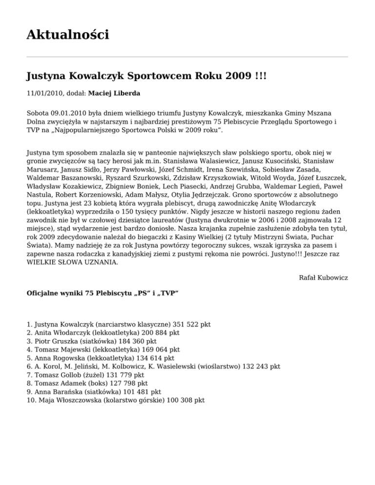 Aktualności Justyna Kowalczyk Sportowcem Roku 2009 !!! 11/01/2010, dodał: Maciej Liberda Sobota 09.01.2010 była dniem wielkiego triumfu Justyny Kowalczyk, mieszkanka Gminy Mszana Dolna zwyciężyła w najstarszym i najbardziej prestiżowym 75 Plebiscycie Przeglądu Sportowego i TVP na „Najpopularniejszego Sportowca Polski w 2009 roku”. Justyna tym sposobem znalazła się w panteonie największych sław polskiego sportu, obok niej w gronie zwycięzców są tacy herosi jak m.in. Stanisława Walasiewicz, Janusz Kusociński, Stanisław Marusarz, Janusz Sidło, Jerzy Pawłowski, Józef Schmidt, Irena Szewińska, Sobiesław Zasada, Waldemar Baszanowski, Ryszard Szurkowski, Zdzisław Krzyszkowiak, Witold Woyda, Józef Łuszczek, Władysław Kozakiewicz, Zbigniew Boniek, Lech Piasecki, Andrzej Grubba, Waldemar Legień, Paweł Nastula, Robert Korzeniowski, Adam Małysz, Otylia Jędrzejczak. Grono sportowców z absolutnego topu. Justyna jest 23 kobietą która wygrała plebiscyt, drugą zawodniczkę Anitę Włodarczyk (lekkoatletyka) wyprzedziła o 150 tysięcy punktów. Nigdy jeszcze w historii naszego regionu żaden zawodnik nie był w czołowej dziesiątce laureatów (Justyna dwukrotnie w 2006 i 2008 zajmowała 12 miejsce), stąd wydarzenie jest bardzo doniosłe. Nasza krajanka zupełnie zasłużenie zdobyła ten tytuł, rok 2009 zdecydowanie należał do biegaczki z Kasiny Wielkiej (2 tytuły Mistrzyni Świata, Puchar Świata). Mamy nadzieję że za rok Justyna powtórzy tegoroczny sukces, wszak igrzyska za pasem i zapewne nasza rodaczka z kanadyjskiej ziemi z pustymi rękoma nie powróci. Justyno!!! Jeszcze raz WIELKIE SŁOWA UZNANIA. Rafał Kubowicz Oficjalne wyniki 75 Plebiscytu „PS” i „TVP” 1. Justyna Kowalczyk (narciarstwo klasyczne) 351 522 pkt 2. Anita Włodarczyk (lekkoatletyka) 200 884 pkt 3. Piotr Gruszka (siatkówka) 184 360 pkt 4. Tomasz Majewski (lekkoatletyka) 169 064 pkt 5. Anna Rogowska (lekkoatletyka) 134 614 pkt 6. A. Korol, M. Jeliński, M. Kolbowicz, K. Wasielewski (wioślarstwo) 132 243 pkt 7. Tomasz Gollob (żużel) 131 779 pkt 8. Tomasz Adamek (boks) 127 798 pkt 9. Anna Barańska (siatkówka) 101 481 pkt 10. Maja Włoszczowska (kolarstwo górskie) 100 308 pkt Justyna ze złotym Championem Zdjęcie udostępnione przez redakcję "Przeglądu Sportowego"