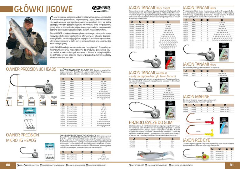 główki Jigowe Jaxon Tanami Silver większym przekroju. Kolor czarny błyszczący – Black Nickel. Niezawodny system utrzymania gumy na haku oparty na kombinacji pojedynczego pierścienia i małego zadzioru. W ofercie szeroka gama główek na hakach w rozmiarach od 6 do 9/0. brze sprawdzony, skuteczny system utrzymania gumy na haku oparty na kombinacji pojedynczego pierścienia i małego zadzioru. W ofercie szeroka gama główek na hakach w rozmiarach od 6 do 6/0. Wzmocniona wersja serii Tanami zbudowana na kutych hakach o trochę C oraz liczniejsze jest grono wędkarzy oddanych pasjonującej metodzie łowienia drapieżników na miękkie gumy z opadu. Metoda ta stawia niezwykle wysokie wymagania używanemu sprzętowi. Liczy się każdy szczegół, od wędki począwszy, przez kołowrotek, żyłkę lub plecionkę, gumę, aż po to, co często decyduje o skutecznym zacięciu – odpowiednio dobraną główkę jigową zbudowaną na ostrym, niezawodnym haku. Firma Owner to niekwestionowany lider światowego rynku producentów haczyków i kotwiczek wędkarskich. Oferujemy perfekcyjnie dopracowane główki z kombinacją pojedynczego pierścienia i małego zadzioru, utrzymującymi gumę w stałej pozycji bez uciążliwego przesuwania i bez kaleczenia przynęty. Haki Owner cechuje niesamowita moc i sprężystość. Przy relatywnie małym przekroju materiał użyty do produkcji gwarantuje skuteczny hol w najtrudniejszych warunkach. Ostrze w najwyższej klasie ostrości, szybkie zacięcie nawet w przypadku dużych sandaczy z bardzo twardym pyskiem. Owner Precision Jig Heads Jaxon Tanami Black Nickel Profesjonalne główki jigowe zbudowane na srebrnych haczykach. Do- HO-GT06 Srebrny 6 10 HO-GB06 Ciemny nikiel - NSB 6 10 1g, 2g, 3g, 4g HO-GT04 Srebrny 4 10 1g, 2g, 3g, 4g 2g, 3g, 4g HO-GB04 Ciemny nikiel - NSB 4 10 2g, 3g, 4g HO-GT02 Srebrny 2 10 2g, 3g, 4g, 6g HO-GB02 Ciemny nikiel - NSB 2 10 2g, 3g, 4g, 6g HO-GT01 Srebrny 1 10 2g, 3g, 4g, 5g, 6g HO-GB01 Ciemny nikiel - NSB 1 10 2g, 3g, 4g, 5g, 6g HO-GT1/0 Srebrny 1/0 10 3g, 4g, 5g, 6g, 8g, 10g HO-GB1/0 Ciemny nikiel - NSB 1/0 10 3g, 4g, 5g, 6g, 8g, 10g HO-GT2/0 Srebrny 2/0 10 3g, 4g, 5g, 6g, 8g, 10g, 12g HO-GB2/0 Ciemny nikiel - NSB 2/0 10 3g, 4g, 5g, 6g, 8g, 10g, 12g HO-GT3/0 Srebrny 3/0 10 4g, 5g, 6g, 8g, 10g, 12g, 14g, 16g, 20g HO-GB3/0 Ciemny nikiel - NSB 3/0 10 4g, 5g, 6g, 8g, 10g, 12g, 15g, 20g HO-GT4/0 Srebrny 4/0 10 4g, 5g, 6g, 8g, 10g, 12g, 14g, 16g, 20g, 25g HO-GB4/0 Ciemny nikiel - NSB 4/0 10 4g, 5g, 6g, 8g, 10g, 12g, 15g, 20g, 25g HO-GT5/0 Srebrny 5/0 10/5 4g, 5g, 6g, 8g, 10g, 12g, 14g, 16g, 20g, 25g, 28g HO-GB5/0 Ciemny nikiel - NSB 5/0 10/5 4g, 5g, 6g, 8g, 10g, 12g, 15g, 20g, 25g, HO-GT6/0 Srebrny 6/0 10/5 8g, 10g, 12g, 14g, 16g, 20g, 25g, 28g, 40g, 60g HO-GB6/0 Ciemny nikiel - NSB 6/0 10/5 6g, 8g, 10g, 12g, 15g, 20g, 25g, 30g, 40g, 60g HO-GB7/0 Ciemny nikiel - NSB 7/0 10/5 8g, 10g, 15g, 20g, 25g, 30g, 40g, 60g HO-GB8/0 Ciemny nikiel - NSB 8/0 10/5 8g, 10g, 15g, 20g, 30g, 40g, 50g, 60g, 80g HO-GB9/0 Ciemny nikiel - NSB 9/0 10/5 10g, 15g, 20g, 30g, 40g, 60g, 80g Jaxon Tanami Micro Bardzo małe główki jigowe do łowienia na paprochy. Główki Owner Precision JH Oferujemy w dwóch kolorach: srebrnym i Black Nickel – czarnym z połyskiem. W opakowaniu od trzech do pięciu główek w zależności od rozmiaru haka. Jaxon Tanami Weedless – antyzaczepowe haczyki Jaxon Tanami HO-GM04 Srebrny 4 10 2g, 3g, 4g, 5g, 6g HO-GM06 Srebrny 6 10 1g, 1,5g, 2g, 3g, 4g, 5g Główki jigowe z zabezpieczeniem antyzaczepowym. Polecamy do łowie- Szeroki łuk kolankowy Ostrze w najwyższej klasie ostrości Stal KC podkuwana Pojedynczy pierścień utrzymujący gumę Mały zadzior utrzymujący gumę GJ-OW06 Srebrny 6 5 1g, 2g, 3g, 4g GJ-OW04 Srebrny 4 5 2g, 3g, 4g GJ-OW02 Srebrny 2 5 2g, 3g, 4g, 6g GJ-OW01 Srebrny 1 5 2g, 3g, 4g, 6g GJ-OW1/0 Srebrny 1/0 4 3g, 4g, 6g, 8g GJ-OW2/0 Srebrny 2/0 4 4g, 6g, 8g, 10g, 12g GJ-OW3/0 Srebrny 3/0 3 4g, 6g, 8g, 10g, 12g, 14g, 16g GJ-OW4/0 Srebrny 4/0 3 6g, 8g, 10g, 12g, 14g, 16g, 20g GJ-OW5/0 Srebrny 5/0 3 6g, 8g, 10g, 12g, 14g, 16g, 20g, 25g, 28g nia w zarośniętych miejscach oraz do łowienia sandaczy w zbiornikach obfitujących w zaczepy. HO-GX01 Srebrny 1 5 3g, 4g, 6g HO-GX1/0 Srebrny 1/0 5 4g, 6g, 8g HO-GX2/0 Srebrny 2/0 5 4g, 6g, 8g, 10g, 12g HO-GX3/0 Srebrny 3/0 5 6g, 8g, 10g, 12g, 14g, 16g HO-GX4/0 Srebrny 4/0 5 8g, 10g, 12g, 14g, 16g, 20g HO-GX5/0 Srebrny 5/0 5 10g, 12g, 14g, 16g, 20g, 28g Jaxon Marine Główki do zbrojenia przywieszek dorszowych. Czerwony kolor haka, dwa kolory główek. Owner Precision Micro Jig Heads 80 kod kolor haczyka GJ-OB08 BC-czarny błyszczący 8 5 1g, 2g, 3g GJ-OB06 BC-czarny błyszczący 6 5 1g, 2g, 3g, 4g GJ-OB04 BC-czarny błyszczący 4 5 2g, 3g, 4g GJ-OB02 BC-czarny błyszczący 2 5 2g, 3g, 4g, 6g GJ-OB01 BC-czarny błyszczący 1 5 2g, 3g, 4g, 6g GJ-OB1/0 BC-czarny błyszczący 1/0 4 3g, 4g, 6g, 8g GJ-OB2/0 BC-czarny błyszczący 2/0 4 4g, 6g, 8g, 10g, 12g GJ-OB3/0 BC-czarny błyszczący 3/0 3 4g, 6g, 8g, 10g, 12g, 14g, 16g GJ-OB4/0 BC-czarny błyszczący 4/0 3 6g, 8g, 10g, 12g, 14g, 16g, 20g GJ-OB5/0 BC-czarny błyszczący 5/0 3 6g, 8g, 10g, 12g, 14g, 16g, 20g, 25g, 28g Owner Precision Micro Jig Heads Wielkie ryby na małe przynęty – tej zasadzie hołdują spinningiści łowiący na maleńkie mikrogumy – paprochy. Ta niezwykle skuteczna metoda, najczęściej związana z użyciem bocznego troka, wymaga specjalnych, maleńkich główek jigowych do uzbrojenia 2-3 cm paproszków. Polecamy główki zbudowane na rewelacyjnych hakach Owner Micro Precision – bardzo cienki, niewiarygodnie mocny drut stalowy HC, ostrze w najwyższej klasie ostrości. GJ-VM3/0 Czerwony 3/0 3 3g Czerwony – R, żółty – Y GJ-VM4/0 Czerwony 4/0 3 3g Czerwony – R, żółty – Y GJ-VM5/0 Czerwony 5/0 3 3g Czerwony – R, żółty – Y WERSJA R Przedłużacze do gum Często się zdarza, że standardowe uzbrojenie gumy w pojedynczy haczyk nie wystarcza. Delikatne brania w okolicach ogona przynęt