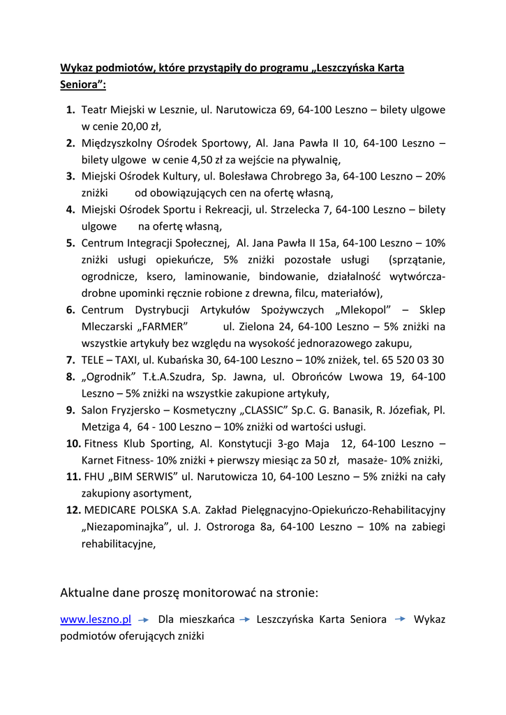 Wykaz podmiotów, które przystąpiły do programu „Leszczyńska Karta Seniora”: 1. Teatr Miejski w Lesznie, ul. Narutowicza 69, 64-100 Leszno – bilety ulgowe w cenie 20,00 zł, 2. Międzyszkolny Ośrodek Sportowy, Al. Jana Pawła II 10, 64-100 Leszno – bilety ulgowe w cenie 4,50 zł za wejście na pływalnię, 3. Miejski Ośrodek Kultury, ul. Bolesława Chrobrego 3a, 64-100 Leszno – 20% zniżki od obowiązujących cen na ofertę własną, 4. Miejski Ośrodek Sportu i Rekreacji, ul. Strzelecka 7, 64-100 Leszno – bilety ulgowe na ofertę własną, 5. Centrum Integracji Społecznej, Al. Jana Pawła II 15a, 64-100 Leszno – 10% zniżki usługi opiekuńcze, 5% zniżki pozostałe usługi (sprzątanie, ogrodnicze, ksero, laminowanie, bindowanie, działalność wytwórczadrobne upominki ręcznie robione z drewna, filcu, materiałów), 6. Centrum Dystrybucji Artykułów Spożywczych „Mlekopol” – Sklep Mleczarski „FARMER” ul. Zielona 24, 64-100 Leszno – 5% zniżki na wszystkie artykuły bez względu na wysokość jednorazowego zakupu, 7. TELE – TAXI, ul. Kubańska 30, 64-100 Leszno – 10% zniżek, tel. 65 520 03 30 8. „Ogrodnik” T.Ł.A.Szudra, Sp. Jawna, ul. Obrońców Lwowa 19, 64-100 Leszno – 5% zniżki na wszystkie zakupione artykuły, 9. Salon Fryzjersko – Kosmetyczny „CLASSIC” Sp.C. G. Banasik, R. Józefiak, Pl. Metziga 4, 64 - 100 Leszno – 10% zniżki od wartości usługi. 10. Fitness Klub Sporting, Al. Konstytucji 3-go Maja 12, 64-100 Leszno – Karnet Fitness- 10% zniżki + pierwszy miesiąc za 50 zł, masaże- 10% zniżki, 11. FHU „BIM SERWIS” ul. Narutowicza 10, 64-100 Leszno – 5% zniżki na cały zakupiony asortyment, 12. MEDICARE POLSKA S.A. Zakład Pielęgnacyjno-Opiekuńczo-Rehabilitacyjny „Niezapominajka”, ul. J. Ostroroga 8a, 64-100 Leszno – 10% na zabiegi rehabilitacyjne, Aktualne dane proszę monitorować na stronie: www.leszno.pl Dla mieszkańca podmiotów oferujących zniżki Leszczyńska Karta Seniora Wykaz