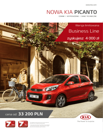 www.kia.com NOWA KIA PICANTO CENNIK | WYPOSAŻENIE | DANE TECHNICZNE Wersja limitowana Business Line zyskujesz 4 000 zł cena od 33 200 PLN Szczegółowe okresy gwarancji oraz jej warunki określone są w książce gwarancyjnej. 7-letni plan aktualizacji map fabrycznej nawigacji umożliwia korzystanie z najnowszych ich wersji bez ponoszenia dodatkowych kosztów. Rok produkcji 2016 NOWA KIA PICANTO Cennik promocyjny ważny od 09.06.2016 r. M L XL 69 KM 5 MT 33 200 zł - - 67 KM 5 MT 37 700 zł - - 69 KM 5 MT 34 700 zł 40 500 zł 45 000 zł 67 KM 5 MT 39 200 zł 45 000 zł - 85 KM 5 MT - 42 500 zł 47 000 zł wersje 3-drzwiowe B 1.0 MPI B+LPG 1.0 LPGi wersje 5-drzwiowe B 1.0 MPI B+LPG 1.0 LPGi B 1.2 MPI Wyposażenie standardowe wersji M 6 poduszek powietrznych, ESC Centralny zamek ze składanym kluczykiem System zabezpieczenia pojazdu przed kradzieżą obejmujący alarm obwodowy oraz immobilizer Elektrycznie sterowane szyby drzwi przednich Pakiet Elektrycznie, progresywne wspomaganie układu kierowniczego Komputer pokładowy dla wersji Przygotowanie do montażu radia z 2 głośnikami Koła z oponami 165/60 R14” z zapasowym kołem dojazdowym Wersja 5-miejscowa Smart M zyskujesz 1 500 zł Wyposażenie standardowe wersji L Elektrycznie sterowane szyby wszystkich drzwi Klimatyzacja manualna Elektrycznie regulowane i podgrzewane lusterka Klamki lakierowane w kolorze nadwozia Radio CD MP3 z RDS, złącza USB i AUX, 4 głośniki Wyposażenie standardowe wersji XL Światła do jazdy dziennej LED, tylne lampy LED Przednie światła typu projekcyjnego Przednie lampy przeciwmgłowe typu projekcyjnego Elektrycznie składane lusterka z kierunkowskazami LED Bluetooth z zestawem głośnomówiącym Skórzana kierownica z funkcją sterowania radiem Podgrzewana kierownica i fotele przednie Dodatkowe głośniki wysokotonowe Chromowane klamki Szczegółowe okresy gwarancji oraz jej warunki określone są w książce gwarancyjnej. 7-letni plan aktualizacji map fabrycznej nawigacji umożliwia korzystanie z najnowszych ich wersji bez ponoszenia dodatkowych kosztów. Wersja Business Line zyskujesz 4 000 zł Pakiet wyposażenia dodatkowego dla wersji L w promocyjnej cenie Wersja limitowana Business Line Wersja 5-drzwiowa zyskujesz 4 000 zł Business Line Business Line Plus B 1.0 MPI 66 KM 5 MT 42 500 zł 45 000 zł B 1.2 MPI 85 KM 5 MT 44 500 zł 47 000 zł B+LPG 1.0 LPGi 67 KM 5 MT 47 000 zł - Wyposażenie dodatkowe wersji Business Line: • • • • • • • • Klimatyzacja automatyczna Bluetooth z zestawem głośnomówiącym do telefonu 15” aluminiowe obręcze kół z oponami 175 / 50 R15 Podgrzewana kierownica i fotele przednie Skórzana kierownica z funkcją sterowania radiem Przyciemniane szyby Chromowane wykończenie klamek Kia Eco Dynamics - system automatycznego wyłączania oraz włączania silnika na postoju pozwalający zaoszczędzić paliwo Dodatkowo dla wersji Business Line Plus: • Kia Navi System z kamerą cofania, zintegrowana z usługami TomTom • Tempomat z ogranicznikiem prędkości NOWA KIA PICANTO M Bezpieczeństwo L XL KOD Poduszki powietrzne czołowe dla kierowcy i pasażera ● ● System dezaktywacji poduszki powietrznej pasażera ● ● ● Poduszki powietrzne boczne oraz pełnowymiarowe kurtyny powietrzne dla pasażerów przednich i tylnych siedzeń ● ● ● Napinacze pasów bezpieczeństwa dla foteli przednich ● ● ● Pasy bezpieczeństwa z czujnikiem obecności pasażera z przodu i z tyłu ● ● ● System bezpiecznego mocowania fotelików dziecięcych ISOFIX ● ● ● Funkcja automatycznego ryglowania zamków ● ● ● Pakiet Bezpieczeństwa: ● ABS - System zapobiegający blokowaniu się kół podczas hamowania, ● BAS - System wspomagania hamowania, ● ESC - System stabilizacji toru jazdy, ● TCS - System kontroli trakcji, ● ESS Automatycznie włączane światła awaryjne podczas gwałtownego hamowania, ● H.A.C - System wspomagający ruszanie na wzniesieniu, ● Czujniki ciśnienia w ogumieniu ● ● ● Światła do jazdy dziennej (niedostępne dla wersji LPGi) ● ● Przednie lampy przeciwmgielne typu projekcyjnego Światła do jazdy dziennej wykonane w technologii LED, przednie lampy typu projekcyjnego z funkcją oświetlania drogi do domu, tylne lampy wykonane w technologii LED, automatycznie włączane światła mijania z czujnikiem zmierzchu Czujniki parkowania tył ● ● ● ● ● 1 000 zł 1 000 zł 1 000 zł Elektryczne, progresywne wspomaganie układu kierowniczego ● ● ● Zdalne sterowanie centralnym zamkiem, alarm obwodowy, immobilizer, składany kluczyk ● ● ● Przygotowanie do montażu radia z 2 głośnikami i anteną dachową, obrotomierz ● ● ● Komputer pokładowy ● ● ● Elektrycznie sterowane szyby drzwi przednich ● Elektrycznie sterowane szyby drzwi przednich i tylnych (niedostępne dla wersji 3 - drzwiowej) ● ● Elektrycznie regulowane oraz podgrzewane lusterka w kolorze nadwozia ● ● Radioodtwarzacz CD, MP3 z RDS typu 2 DIN wyposażony w port USB oraz złącze typu AUX ● ● BWS Komfort i styl Klimatyzacja manualna ACN 3 000 zł Pakiet Smart : klimatyzacja manualna, radioodtwarzacz CD, MP3 z RDS typu 2 DIN wyposażony w port USB oraz złącze typu AUX, sterowanie funkcjami radia z kolumny kierownicy, lusterka i klamki lakierowane w kolorze nadwozia, bluetooth z zestawem głośnomówiącym do telefonu i funkcją rozpoznawania komend głosowych, skórzane wykończenie koła kierownicy i drążka zmiany biegów SMT 5500 zł 4 000 zł ● Klimatyzacja automatyczna ● Pakiet Miejski : Bluetooth z zestawem głośnomówiącym do telefonu i funkcją rozpoznawania komend głosowych, skórzane wykończenie koła kierownicy i drążka zmiany biegów, podgrzewana kierownica i fotele przednie, sterowanie funkcjami radia z kolumny kierownicy, dodatkowe głośniki wysokotonowe, automatyczne światła z funkcją oświetlania drogi do domu, chromowane wykończenie klamek zewnętrznych i wewnętrznych CTY 1 5