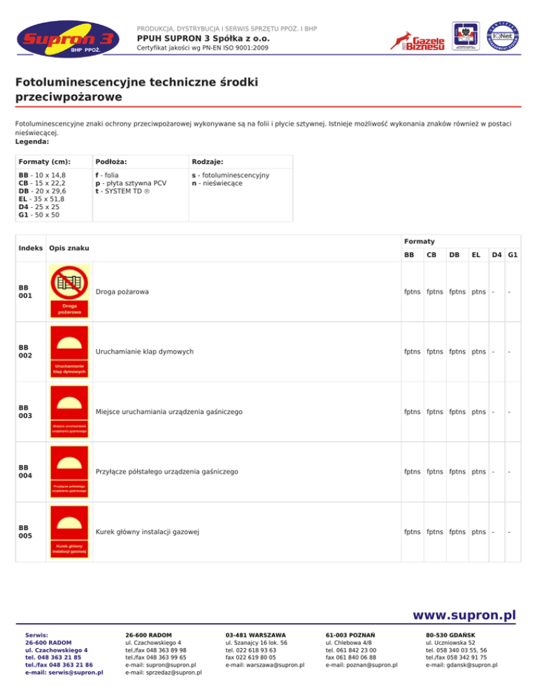 PRODUKCJA, DYSTRYBUCJA I SERWIS SPRZĘTU PPOŻ. I BHP PPUH SUPRON 3 Spółka z o.o. Certyfikat jakości wg PN-EN ISO 9001:2009 Fotoluminescencyjne techniczne środki przeciwpożarowe Fotoluminescencyjne znaki ochrony przeciwpożarowej wykonywane są na folii i płycie sztywnej. Istnieje możliwość wykonania znaków również w postaci nieświecącej. Legenda: Formaty (cm): Podłoża: Rodzaje: BB - 10 x 14,8 CB - 15 x 22,2 DB - 20 x 29,6 EL - 35 x 51,8 D4 - 25 x 25 G1 - 50 x 50 f - folia p - płyta sztywna PCV t - SYSTEM TD s - fotoluminescencyjny n - nieświecące Formaty Indeks Opis znaku BB CB DB EL D4 G1 BB 001 Droga pożarowa fptns fptns fptns ptns - - BB 002 Uruchamianie klap dymowych fptns fptns fptns ptns - - BB 003 Miejsce uruchamiania urządzenia gaśniczego fptns fptns fptns ptns - - BB 004 Przyłącze półstałego urządzenia gaśniczego fptns fptns fptns ptns - - BB 005 Kurek główny instalacji gazowej fptns fptns fptns ptns - - www.supron.pl Serwis: 26-600 RADOM ul. Czachowskiego 4 tel. 048 363 21 85 tel./fax 048 363 21 86 e-mail: [email protected] 26-600 RADOM ul. Czachowskiego 4 tel./fax 048 363 89 98 tel./fax 048 363 99 65 e-mail: [email protected] e-mail: [email protected] 03-481 WARSZAWA ul. Szanajcy 16 lok. 56 tel. 022 618 93 63 fax 022 619 80 05 e-mail: [email protected] 61-003 POZNAŃ ul. Chlebowa 4/8 tel. 061 842 23 00 fax 061 840 06 88 e-mail: [email protected] 80-530 GDAŃSK ul. Uczniowska 52 tel. 058 340 03 55, 56 tel./fax 058 342 91 75 e-mail: [email protected] PRODUKCJA, DYSTRYBUCJA I SERWIS SPRZĘTU PPOŻ. I BHP PPUH SUPRON 3 Spółka z o.o. Certyfikat jakości wg PN-EN ISO 9001:2009 BB 006 Suchy pion fptns fptns fptns ptns - - BB 007 Przeciwpożarowy zbiornik wody fptns fptns fptns ptns - - BB 008 Przeciwpożarowe stanowisko czerpania wody fptns fptns fptns ptns - - BB 009 Dźwig przeciwpożarowy fptns fptns fptns ptns - - BB 010 Otwieranie klap przeciwpożarowych fptns fptns fptns ptns - - BB 011 Drzwi przeciwpożarowe. Zamykać! Kierunek drogi ewakuacyjnej w lewo fptns fptns fptns ptns - - BB 012 Przeciwpożarowy wyłącznik prądu fptns fptns fptns ptns - - BB 013 Hydrant zewnętrzny - pn - - - pn www.supron.pl Serwis: 26-600 RADOM ul. Czachowskiego 4 tel. 048 363 21 85 tel./fax 048 363 21 86 e-mail: [email protected] 26-600 RADOM ul. Czachowskiego 4 tel./fax 048 363 89 98 tel./fax 048 363 99 65 e-mail: [email protected] e-mail: [email protected] 03-481 WARSZAWA ul. Szanajcy 16 lok. 56 tel. 022 618 93 63 fax 022 619 80 05 e-mail: [email protected] 61-003 POZNAŃ ul. Chlebowa 4/8 tel. 061 842 23 00 fax 061 840 06 88 e-mail: [email protected] 80-530 GDAŃSK ul. Uczniowska 52 tel. 058 340 03 55, 56 tel./fax 058 342 91 75 e-mail: [email protected] PRODUKCJA, DYSTRYBUCJA I SERWIS SPRZĘTU PPOŻ. I BHP PPUH SUPRON 3 Spółka z o.o. Certyfikat jakości wg PN-EN ISO 9001:2009 BB 014 Drzwi przeciwpożarowe. Zamykać! Kierunek drogi ewakuacyjnej w prawo fptns fptns fptns ptns - - www.supron.pl Serwis: 26-600 RADOM ul. Czachowskiego 4 tel. 048 363 21 85 tel./fax 048 363 21 86 e-mail: [email protected] 26-600 RADOM ul. Czachowskiego 4 tel./fax 048 363 89 98 tel./fax 048 363 99 65 e-mail: [email protected] e-mail: [email protected] 03-481 WARSZAWA ul. Szanajcy 16 lok. 56 tel. 022 618 93 63 fax 022 619 80 05 e-mail: [email protected] 61-003 POZNAŃ ul. Chlebowa 4/8 tel. 061 842 23 00 fax 061 840 06 88 e-mail: [email protected] 80-530 GDAŃSK ul. Uczniowska 52 tel. 058 340 03 55, 56 tel./fax 058 342 91 75 e-mail: [email protected]