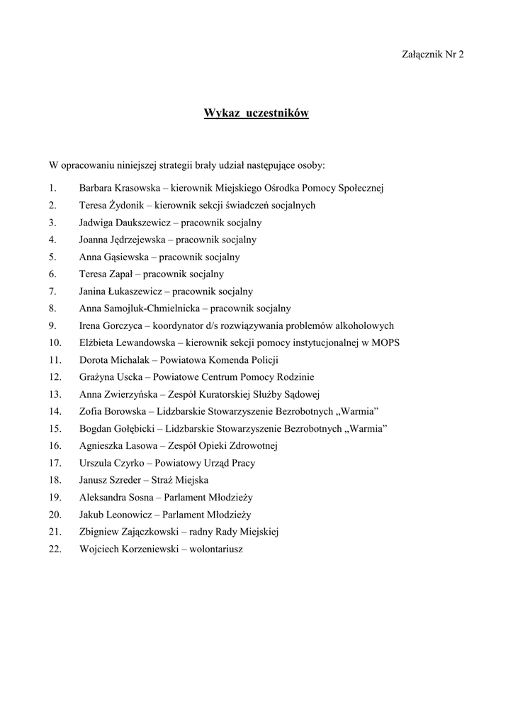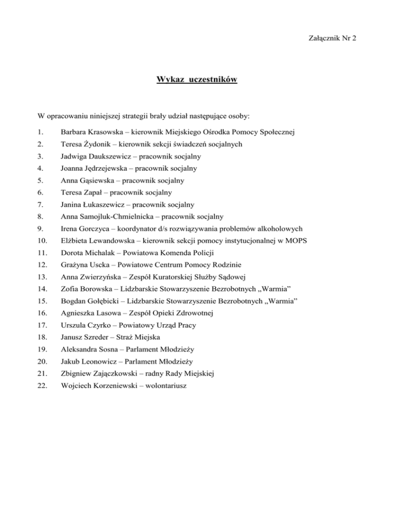 Załącznik Nr 2 Wykaz uczestników W opracowaniu niniejszej strategii brały udział następujące osoby: 1. Barbara Krasowska – kierownik Miejskiego Ośrodka Pomocy Społecznej 2. Teresa śydonik – kierownik sekcji świadczeń socjalnych 3. Jadwiga Daukszewicz – pracownik socjalny 4. Joanna Jędrzejewska – pracownik socjalny 5. Anna Gąsiewska – pracownik socjalny 6. Teresa Zapał – pracownik socjalny 7. Janina Łukaszewicz – pracownik socjalny 8. Anna Samojluk-Chmielnicka – pracownik socjalny 9. Irena Gorczyca – koordynator d/s rozwiązywania problemów alkoholowych 10. ElŜbieta Lewandowska – kierownik sekcji pomocy instytucjonalnej w MOPS 11. Dorota Michalak – Powiatowa Komenda Policji 12. GraŜyna Uscka – Powiatowe Centrum Pomocy Rodzinie 13. Anna Zwierzyńska – Zespół Kuratorskiej SłuŜby Sądowej 14. Zofia Borowska – Lidzbarskie Stowarzyszenie Bezrobotnych „Warmia” 15. Bogdan Gołębicki – Lidzbarskie Stowarzyszenie Bezrobotnych „Warmia” 16. Agnieszka Lasowa – Zespół Opieki Zdrowotnej 17. Urszula Czyrko – Powiatowy Urząd Pracy 18. Janusz Szreder – StraŜ Miejska 19. Aleksandra Sosna – Parlament MłodzieŜy 20. Jakub Leonowicz – Parlament MłodzieŜy 21. Zbigniew Zajączkowski – radny Rady Miejskiej 22. Wojciech Korzeniewski – wolontariusz