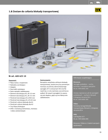 1.8 Zestaw do cofania blokady transportowej Nr art. 400 425 10 Zawartość: • Płyta nośna z trzpieniem • Nakrętka zaciskająca • Adapter • Dwa kołki ustalające • Dwie nakrętki radełkowane • Element dociskający K2, Ø 115 mm • Element dociskający K1, Ø 131 mm • Pierścień dociskający K2, Ø 85 mm • Pierścień dociskający K1, Ø 105 mm • Pierścień cofania blokady dla K1 • Pierścień cofania blokady dla K2 • Trzy klipsy blokujące • DVD z instrukcją demontażu, montażu i video szkoleniowym Informacje uzupełniające: Zastosowanie: Narzędzie umożliwia cofnięcie blokady transportowej, konieczne przy ponownym montażu wcześniej zdemontowanego sprzęgła 2CT w skrzyniach DC4 do Renault (np. w celu wymiany uszczelniacza wałka). W nowych sprzęgłach ta operacja jest zbędna, gdyż są one fabrycznie zablokowane. Broszura: Sprzęgło podwójne – suche, technika / narzędzia specjalne Nr art. 999 6006 340 Zestaw naprawczy LuK do sprzęgieł podwójnych – suchych, Renault 6-biegowa skrzynia DC4 Nr art. 999 6006 300 Video: Ponowny naciąg blokady transportowej, Renault, 6-biegowa skrzynia DC4 DVD: LuK RepSet 2CT Nr art. 999 6006 090 Broszury i Video w 2 dwóch wersjach językowych 13