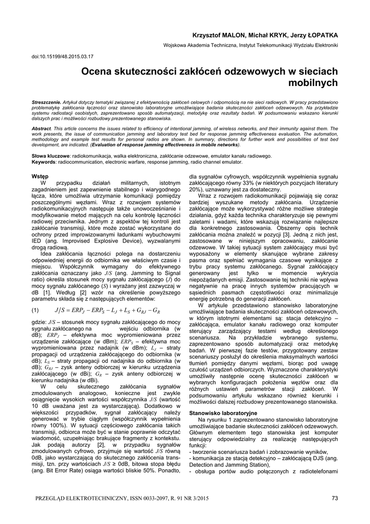 Krzysztof MALON, Michał KRYK, Jerzy ŁOPATKA Wojskowa Akademia Techniczna, Instytut Telekomunikacji Wydziału Elektroniki doi:10.15199/48.2015.03.17 Ocena skuteczności zakłóceń odzewowych w sieciach mobilnych Streszczenie. Artykuł dotyczy tematyki związanej z efektywnością zakłóceń celowych i odpornością na nie sieci radiowych. W pracy przedstawiono problematykę zakłócania łączności oraz stanowisko laboratoryjne umożliwiające badania skuteczności zakłóceń odzewowych. Na przykładzie systemu radiostacji osobistych, zaprezentowano sposób automatyzacji, metodykę oraz rezultaty badań. W podsumowaniu wskazano kierunki dalszych prac i możliwości rozbudowy prezentowanego stanowiska. Abstract. This article concerns the issues related to efficiency of intentional jamming, of wireless networks, and their immunity against them. The work presents, the issue of communication jamming and laboratory test bed for response jamming effectiveness evaluation. The automation, methodology and example test results for personal radios are shown. In summary, directions for further work and possibilities of test bed development, are indicated. (Evaluation of response jamming effectiveness in mobile networks). Słowa kluczowe: radiokomunikacja, walka elektroniczna, zakłócanie odzewowe, emulator kanału radiowego. Keywords: radiocommunication, electronic warfare, response jamming, radio channel emulator. Wstęp W przypadku działań militarnych, istotnym zagadnieniem jest zapewnienie stabilnego i wiarygodnego łącza, które umożliwia utrzymanie komunikacji pomiędzy poszczególnymi węzłami. Wraz z rozwojem systemów radiokomunikacyjnych następuje także unowocześnianie i modyfikowanie metod mających na celu kontrolę łączności radiowej przeciwnika. Jednym z aspektów tej kontroli jest zakłócanie transmisji, które może zostać wykorzystane do ochrony przed improwizowanymi ładunkami wybuchowymi IED (ang. Improvised Explosive Device), wyzwalanymi drogą radiową. Idea zakłócania łączności polega na dostarczeniu odpowiedniej energii do odbiornika we właściwym czasie i miejscu. Współczynnik wymagany do efektywnego zakłócania oznaczany jako J/S (ang. Jamming to Signal ratio) określa stosunek mocy sygnału zakłócającego (J) do mocy sygnału zakłócanego (S) i wyrażany jest zazwyczaj w dB [1]. Według [2] wzór na określenie powyższego parametru składa się z następujących elementów: (1) J S ERPJ ERPS LJ LS GRJ GR gdzie: J/S – stosunek mocy sygnału zakłócającego do mocy sygnału zakłócanego na wejściu odbiornika (w dB); ERPJ – efektywna moc wypromieniowana przez urządzenie zakłócające (w dBm); ERPS – efektywna moc wypromieniowana przez nadajnik (w dBm); LJ – straty propagacji od urządzenia zakłócającego do odbiornika (w dB); LS – straty propagacji od nadajnika do odbiornika (w dB); GRJ – zysk anteny odbiorczej w kierunku urządzenia zakłócającego (w dBi); GR – zysk anteny odbiorczej w kierunku nadajnika (w dBi). W celu skutecznego zakłócania sygnałów zmodulowanych analogowo, konieczne jest zwykle osiągnięcie wysokich wartości współczynnika J/S (wartość 10 dB uważana jest za wystarczającą). Dodatkowo w większości przypadków, sygnał zakłócający należy generować w trybie ciągłym (współczynnik wypełnienia równy 100%). W sytuacji częściowego zakłócania takich transmisji, odbiorca może być w stanie poprawnie odczytać wiadomość, uzupełniając brakujące fragmenty z kontekstu. Jak podają autorzy [2], w przypadku sygnałów zmodulowanych cyfrowo, przyjmuje się wartość J/S równą 0dB, jako wystarczającą do skutecznego zakłócenia transmisji, tzn. przy wartościach J/S ≥ 0dB, bitowa stopa błędu (ang. Bit Error Rate) osiąga wartości bliskie 50%. Ponadto, dla sygnałów cyfrowych, współczynnik wypełnienia sygnału zakłócającego równy 33% (w niektórych pozycjach literatury 20%), uznawany jest za dostateczny. Wraz z rozwojem radiokomunikacji pojawiają się coraz bardziej wyszukane metody zakłócania. Urządzenie zakłócające może wykorzystywać różne możliwe strategie działania, gdyż każda technika charakteryzuje się pewnymi zaletami i wadami, które wskazują rozwiązanie najlepsze dla konkretnego zastosowania. Obszerny opis technik zakłócania można znaleźć w pozycji [3]. Jedną z nich jest, zastosowane w niniejszym opracowaniu, zakłócanie odzewowe. W takiej sytuacji system zakłócający musi być wyposażony w elementy skanujące wybrane zakresy pasma oraz spełniać wymagania czasowe wynikające z trybu pracy systemu zakłócanego. Sygnał zakłócający generowany jest tylko w momencie wykrycia niepożądanych emisji. Zastosowanie tej techniki nie wpływa negatywnie na pracę innych systemów pracujących w sąsiednich pasmach częstotliwości oraz minimalizuje energię potrzebną do generacji zakłóceń. W artykule przedstawiono stanowisko laboratoryjne umożliwiające badania skuteczności zakłóceń odzewowych, w którym istotnymi elementami są: stacja detekcyjno – zakłócająca, emulator kanału radiowego oraz komputer sterujący zarządzający testami według określonego scenariusza. Na przykładzie wybranego systemu, zaprezentowano sposób automatyzacji oraz metodykę badań. W pierwszej fazie testów, przygotowany zestaw scenariuszy posłużył do określenia maksymalnych wartości tłumień pomiędzy danymi węzłami, biorąc pod uwagę czułość urządzeń odbiorczych. Wyznaczone charakterystyki umożliwiły następnie ocenę skuteczności zakłóceń w wybranych konfiguracjach położenia węzłów oraz dla różnych ustawień parametrów stacji zakłóceń. W podsumowaniu artykułu wskazano również kierunki i możliwości dalszej rozbudowy prezentowanego stanowiska. Stanowisko laboratoryjne Na rysunku 1 zaprezentowano stanowisko laboratoryjne umożliwiające badanie skuteczności zakłóceń odzewowych. Głównym elementem tego stan