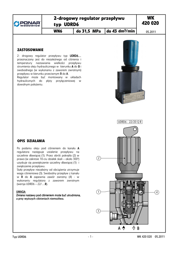 WK 420 020 2-drogowy regulator przepływu typ UDRD6 WN6 do 31,5 MPa do 43 dm3/min 05.2011 ZASTOSOWANIE 2- drogowy regulator przepływu typ UDRD6… przeznaczony jest do niezależnego od ciśnienia i temperatury nastawiania wielkości przepływu strumienia oleju hydraulicznego w kierunku A do B i swobodnego (w wykonaniu z zaworem zwrotnym) przepływu w kierunku przeciwnym B do A. Regulator może być montowany w układach hydraulicznych do płyty przyłączeniowej w dowolnym położeniu. UDRD6 - 22/20 Q R OPIS DZIAŁANIA Po podaniu oleju pod ciśnieniem do kanału A regulatora następuje ustalenie przepływu na szczelinie dławiącej (1). Przez obrót pokrętła (2) w prawo (w zakresie 10-ciu działek skali – około 300o) uzyskuje się powiększenie szczeliny dławiącej (1) i zwiększenie przepływu. Stały przepływ niezależny od obciążenia utrzymuje waga ciśnieniowa (3). Swobodny przepływ z kanału w B do A zapewnia zawór zwrotny (4) - w wykonaniu regulatora z zaworem zwrotnym (wersja UDRD6 – 22/…R R). 2 UWAGA UWAGA: GA: Zmiana Zmi ana nastaw n astawy astaw y po p od ciśnienie ciśn ieniem ienie m mo może być b yć utrud nio niona, a przy wyższych wyżs zych ciśnienia ciśni eniach enia ch niem ni emo emożliwa. żliw a. 1 4 3 A Typ UDRD6 -1- B WK 420 020 05.2011 DANE TECHNICZNE olej mineralny 16 µ m 10 µ m o 37 mm 2 /s w temperaturze 55 C 2,8 do 328 mm2 /s zalecany 40 oC do 55 oC Rodzaj cieczy hydraulicznej Wymag aga Wym agana fi f iltracj ltr acja acj a ciec c ieczy iec zy hydra hydr aulicz icznej Zaleca lecana fi f iltracj ltr acja acja ciec c ieczy iec zy hydra hydr aulicz icznej Lepkość nominalna cieczy hydraulicznej Zakres lepkości cieczy hydraulicznej Zakres temperatury cieczy (w zbiorniku) max Zakres temperatury otoczenia Max ciś ci śnien ienie pracy pr acy Tolerancja regulacji strumienia dla stałego ciśnienia i temperatury Najmn ajm niejsz iejs za ró r óżnica ica ci ciśnień ień przed pr zed i za regu reg ulatorem atorem Stabilność przepływu przy zmianach ciśnienia Masa -20 oC do +70 oC - 20 oC do +70 oC 31,5 1,5 MPa _+ 5 % 1,5 1, 5 MP a _+ 5 % 1,4 kg SCHEMATY Symbole graficzne szczegółowe i uproszczone regulatorów przepływu typ UDR UDRD6... symbol symbo l upro uproszcz zczony symbol symbo l szczeg zczegó zegółowy wersja UDRD6.../...R... A B A B wersja UDRD6.../...M... A WK 420 020 05.2011 B A -2- B Typ UDRD6 WYMIARY GABARYTOWE I PRZYŁĄCZENIOWE 4 46 38 18 O O M5 gł 10 - 4 otw 10,3 72 19* 27,8 40,5 min 64 23 r 5,95* 16,25 26,55* 31,75 32,5 B 146 A 7,6 (max) - 2otw (A,B) 0,75 min 45 2 0,01/100 mm 0,63 3 1 5,3 - 4 otw B 7 31 A 1 - Pierścień uszcz. o-ring 9,2 9,2 x 1,8 1,8 - szt. 4/komplet 2 - Konfiguracja otworów powierzchni płyty przyłączeniowej zgodna normami: • CETOP TOP RP 121H - oznaczenie CETOP TOP 4.2-4-03-320 (wielkość nominalna CE CETOP TOP 03) • IS - oznaczenie ISO 4401-03-02-0-94 I SO 4401 śruby mocujące M5 x 30 -1 -10.9 wg PN - EN ISO 4762 (PN/M-82302) - szt. 4 /komplet moment dokręcenia Md = 9 Nm. Uwaga: Uwaga: (*) - wymiary dotyczące środków pogłębień (z pierścieniami uszczelniającymi poz.1 - szt. 2) wykonanych w korpusie regulatora przepływu celem zachowania zgodności z w/w przyłączami wg CETOP RP 121H, ISO 4401 3 - Wymagany stan powierzchni płyty przyłączeniowej 4 - Przestrzeń na wyjęcie klucza z zamka nastawy 32,5 45 O 10,5 Typ UDRD6 40,5 64 -3- WK 420 020 05.2011 CHARAKTERYSTYKI dla lepkości cieczy hydraulicznej ν = 41 mm 2/s i temperatury t = 50 oC ) Chara arakterystyk terysty ki zależ leżności przep pr zepły zepływ ływu od nasta st awy Wykresy charakterystyk zależności przepływu od położenia pokrętła na skali dla regulatów o różnych zakresach przepływu 8 działka skali działka skali 8 6 4 2 0 Q 32 43 Q 10 20 Q 0,3 Q 0, 6 Q 1Q 1,5 Q 10 Q 2,5 5Q 10 Q kierunek przepływu A → B kierunek przepływu A → B 6 4 2 1 2 3 3 Q [dm /mi /min] 4 5 0 10 20 30 3 Q [dm /mi /min] 40 50 Chara arakterystyk terysty ka opor oporó orów przep pr zepły zepływ ływu Wykres charakterystyki oporów przepływu przez zawór zwrotny - wersja UDRD6-22/...R... kierunek przepływu B → A 2, 0 ∆ p [MPa ] 1,6 1, 2 8 4 0 WK 420 020 10 05.2011 20 30 3 /min] Q [dm /mi 40 50 -4- Typ UDRD6 SPOSÓB ZAMAWIANIA UDRD Wielkość nominalna (WN) WN6 6 * =6 Numer serii konstrukcyjnej (20 - 29) - niezmienne wymiary przyłacza i zabudowy = 2X seria 22 = 22 Zakres przepływu (A → B) do 0,3 dm 3/min do 0,6 dm 3/min do 1,0 dm 3/min do 1,5 dm 3/min do 2,5 dm 3/min do 5,0 dm 3/min do 10 dm 3/min do 20 dm 3 /min do 32 dm 3/min do 43 dm 3/min = 0,3 Q = 0,6 Q = 1Q = 1,5 Q = 2,5 Q = 5Q = 10 Q = 20 Q = 32 Q = 43 Q Wersja wykonania z zaworem zwrotnym bez zaworu zwrotnego =R =M Rodzaj uszczelnienia NBR (dla cieczy na bazie olejów mineralnych) FKM (dla cieczy na bazie estrów fosforanowych) = bez oznaczenia =V Ewentualne dodatkowe wymagania określone w sposób opisowy (uzgodnione z producentem) UWA UWAGI: Regulator przepływu należy zamawiać wg kodu, ustalonego z symboli wg powyższego diagramu. Symbo Symb ole zaznacz aczone dru dr ukiem pogr p ogrub ogr ubi ubionym oznacz aczają ają prefero prefer owane wersje wyk wykonania dostęp dostępne stęp ne w krótk rótkim termi term inie do d osta stawy. Przykład kodu regulatora przepływu w zamówieniu: UDRD6 - 22/20 Q M Typ UDRD6 -5- WK 420 020 05.2011 PŁYTY PRZYŁĄCZENIOWE I ŚRUBY MOCUJĄCE Płyty przyłączeniowe należy zamawiać wg karty katalogowej WK WK 496 480. Symbole płyt: G 341/01 - przyłącza gwintowe G 1/4 G 342/01 - przyłącza gwintowe G 3/8 G 502/01 - przyłącza gwintowe G 1/2 G 341/02 - przyłącza gwintowe M14 x 1,5 G 342/02 - przyłącza gwintowe M16 x 1,5 Płyta przyłączeniowa i śruby do montażu regulatora M5 x 30 - 10,9 0, 9 wg PN -E - EN ISO 4762 (PN/M-82302) szt. 4/komplet dostarczane są na oddzielne zamówienie. Moment dokręcenia śrub Md = 9 Nm . AGA: UWA UW Symbo Symb ol płyty p łyty zaznacz aczony dru dr ukiem pogr p ogru