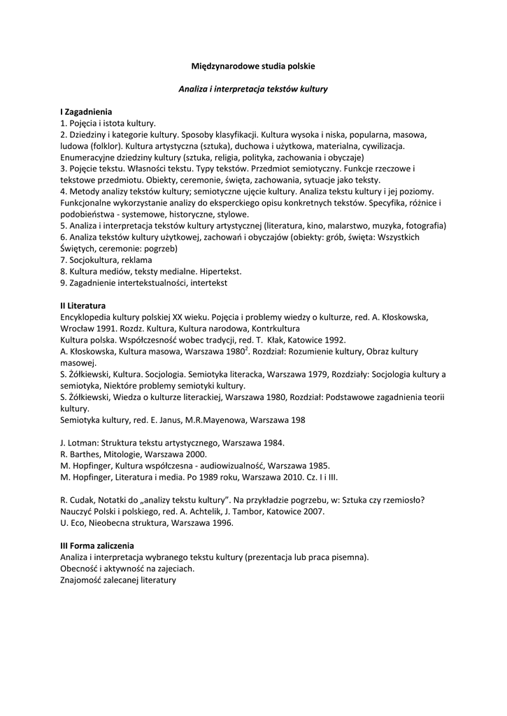 Międzynarodowe studia polskie Analiza i interpretacja tekstów kultury I Zagadnienia 1. Pojęcia i istota kultury. 2. Dziedziny i kategorie kultury. Sposoby klasyfikacji. Kultura wysoka i niska, popularna, masowa, ludowa (folklor). Kultura artystyczna (sztuka), duchowa i użytkowa, materialna, cywilizacja. Enumeracyjne dziedziny kultury (sztuka, religia, polityka, zachowania i obyczaje) 3. Pojęcie tekstu. Własności tekstu. Typy tekstów. Przedmiot semiotyczny. Funkcje rzeczowe i tekstowe przedmiotu. Obiekty, ceremonie, święta, zachowania, sytuacje jako teksty. 4. Metody analizy tekstów kultury; semiotyczne ujęcie kultury. Analiza tekstu kultury i jej poziomy. Funkcjonalne wykorzystanie analizy do eksperckiego opisu konkretnych tekstów. Specyfika, różnice i podobieństwa - systemowe, historyczne, stylowe. 5. Analiza i interpretacja tekstów kultury artystycznej (literatura, kino, malarstwo, muzyka, fotografia) 6. Analiza tekstów kultury użytkowej, zachowań i obyczajów (obiekty: grób, święta: Wszystkich Świętych, ceremonie: pogrzeb) 7. Socjokultura, reklama 8. Kultura mediów, teksty medialne. Hipertekst. 9. Zagadnienie intertekstualności, intertekst II Literatura Encyklopedia kultury polskiej XX wieku. Pojęcia i problemy wiedzy o kulturze, red. A. Kłoskowska, Wrocław 1991. Rozdz. Kultura, Kultura narodowa, Kontrkultura Kultura polska. Współczesność wobec tradycji, red. T. Kłak, Katowice 1992. A. Kłoskowska, Kultura masowa, Warszawa 19802. Rozdział: Rozumienie kultury, Obraz kultury masowej. S. Żółkiewski, Kultura. Socjologia. Semiotyka literacka, Warszawa 1979, Rozdziały: Socjologia kultury a semiotyka, Niektóre problemy semiotyki kultury. S. Żółkiewski, Wiedza o kulturze literackiej, Warszawa 1980, Rozdział: Podstawowe zagadnienia teorii kultury. Semiotyka kultury, red. E. Janus, M.R.Mayenowa, Warszawa 198 J. Lotman: Struktura tekstu artystycznego, Warszawa 1984. R. Barthes, Mitologie, Warszawa 2000. M. Hopfinger, Kultura współczesna - audiowizualność, Warszawa 1985. M. Hopfinger, Literatura i media. Po 1989 roku, Warszawa 2010. Cz. I i III. R. Cudak, Notatki do „analizy tekstu kultury”. Na przykładzie pogrzebu, w: Sztuka czy rzemiosło? Nauczyć Polski i polskiego, red. A. Achtelik, J. Tambor, Katowice 2007. U. Eco, Nieobecna struktura, Warszawa 1996. III Forma zaliczenia Analiza i interpretacja wybranego tekstu kultury (prezentacja lub praca pisemna). Obecność i aktywność na zajeciach. Znajomość zalecanej literatury