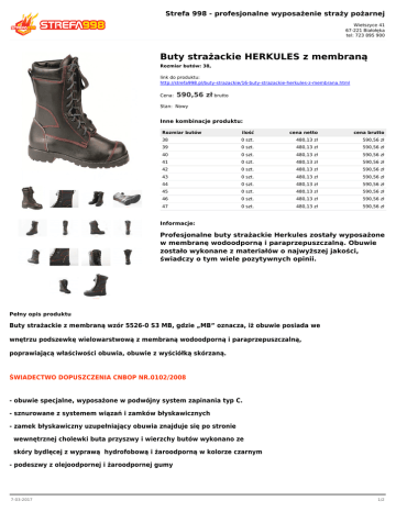 Strefa 998 - profesjonalne wyposażenie straży pożarnej Wietszyce 41 67-221 Białołęka tel: 723 895 900 Buty strażackie HERKULES z membraną Rozmiar butów: 38, link do produktu: http://strefa998.pl/buty-strazackie/16-buty-strazackie-herkules-z-membrana.html Cena: 590,56 zł brutto Stan: Nowy Inne kombinacje produktu: Rozmiar butów ilość cena netto cena brutto 38 0 szt. 480,13 zł 590,56 zł 39 0 szt. 480,13 zł 590,56 zł 40 0 szt. 480,13 zł 590,56 zł 41 0 szt. 480,13 zł 590,56 zł 42 0 szt. 480,13 zł 590,56 zł 43 0 szt. 480,13 zł 590,56 zł 44 0 szt. 480,13 zł 590,56 zł 45 0 szt. 480,13 zł 590,56 zł 46 0 szt. 480,13 zł 590,56 zł 47 0 szt. 480,13 zł 590,56 zł Informacje: Profesjonalne buty strażackie Herkules zostały wyposażone w membranę wodoodporną i paraprzepuszczalną. Obuwie zostało wykonane z materiałów o najwyższej jakości, świadczy o tym wiele pozytywnych opinii. Pełny opis produktu Buty strażackie z membraną wzór 5526-0 S3 MB, gdzie „MB” oznacza, iż obuwie posiada we wnętrzu podszewkę wielowarstwową z membraną wodoodporną i paraprzepuszczalną, poprawiającą właściwości obuwia, obuwie z wyściółką skórzaną. ŚWIADECTWO DOPUSZCZENIA CNBOP NR.0102/2008 - obuwie specjalne, wyposażone w podwójny system zapinania typ C. - sznurowane z systemem wiązań i zamków błyskawicznych - zamek błyskawiczny uzupełniający obuwia znajduje się po stronie wewnętrznej cholewki buta przyszwy i wierzchy butów wykonano ze skóry bydlęcej z wyprawą hydrofobową i żaroodporną w kolorze czarnym - podeszwy z olejoodpornej i żaroodpornej gumy 7-03-2017 1/2 - podeszwy są antypoślizgowe, odporne na działanie rozpuszczalników, olejów i kwasów - obuwie posiada stalowe podnoski zabezpieczają palce przed urazami - obuwie posiada stalową wkładkę w podeszwie /zabezpieczającą stopę przed przebiciem - obuwie posiada we wnętrzu podszewkę wielowarstwową z membraną wodoodporną i para przepuszczalną, poprawiającą właściwości obuwia tj. zwiększającą wodoszczelność, zapewniającą para przepuszczalność, zwiększającą odporność chemiczną. WindTex® - szwy zewnętrzne wykonano nićmi w kolorze czerwonym - obuwie nie posiada oznakowania taśmami ostrzegawczymi - na zewnętrznej powierzchni wierchów wykonano odciskane w skórze oznaczenie obuwia strażackiego specjalnego - wewnątrz zamieszczono wszywkę identyfikacyjną /informacje na temat: Producenta, nr jednostki notyfikowanej, oznaczenie modelu obuwia, rozmiary, partię, datę produkcji, numer normy/ -metalowe elementy składowe są nierdzewne (oczka, zamki, haki, nity, itp.). 7-03-2017 2/2