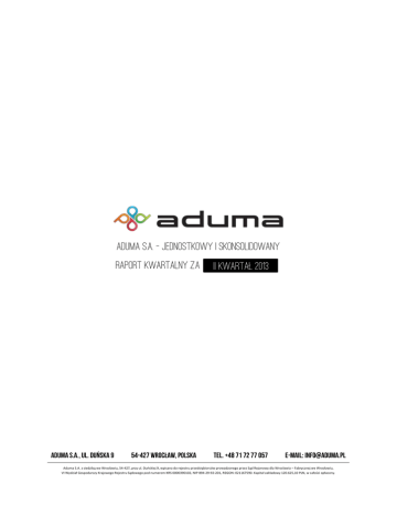 ADUMA S.A. - JEDNOSTKOWY I SKONSOLIDOWANY RAPORT KWARTALNY ZA ADUMA S.A., Ul. Duńska 9 54-427 Wrocław, Polska II KWARTAŁ 2013 tel. +48 71 72 77 057 E-maiL: [email protected] Aduma S.A. z siedzibą we Wrocławiu, 54-427, przy ul. Duńskiej 9, wpisana do rejestru przedsiębiorców prowadzonego przez Sąd Rejonowy dla Wrocławia – Fabrycznej we Wrocławiu, VI Wydział Gospodarczy Krajowego Rejestru Sądowego pod numerem KRS 0000390102, NIP 894-29-92-201, REGON: 021167590. Kapitał zakładowy 120.625,10 PLN, w całości opłacony. 1. PODSTAWOWE INFORMACJE O SPÓŁCE Aduma S.A. jest innowacyjną firmą technologiczną specjalizującą się w systemach Human-Computer Interaction. Spółka jest ekspertem w przygotowaniu systemów reagujących na ruch, kinetycznych, dotykowych, mobilnych i augmented reality. Autorskie rozwiązania, projektowane w oparciu o naturalny interfejs użytkownika (NUI), znajdują zastosowanie we wszystkich obszarach, gdzie ma znaczenie sprawna, funkcjonalna i angażująca komunikacja człowieka z komputerem – w marketingu, edukacji, informacji i wielu innych. Do grona klientów Aduma S.A. należą najbardziej wymagające globalne marki – od technologicznych i komunikacyjnych po branżę retail oraz sektor publiczny. Aduma oferuje klientom szeroki wybór najwyższej jakości systemów dotykowych, interaktywnych i autorskich rozwiązań pozwalających na zdalne zarządzanie sieciami innowacyjnych nośników multimedialnych, wykorzystujących najnowsze technologie. Dzięki innowacyjnym rozwiązaniom software’owym tworzonym przez Aduma S.A. powstają efektywne systemy edukacyjne, zaskakujące kampanie, eventy, reklamy i instalacje multimedialne obok których nikt nie przejdzie obojętnie! Oferowane Usługi: Sprzedaż systemów interaktywnych i dotykowych: wszędzie tam gdzie zaskoczenie, interakcja, zaangażowanie i zabawa służą skutecznej komunikacji (muzea, placówki edukacyjne, bary i puby, punkty sprzedaży itd.); Planowanie i sprzedaż angażujących kampanii interaktywnych w ramach sieci Aduma Interactive Network i innych lokalizacji ambientowych; Wynajem systemów interaktywnych i dotykowych: uatrakcyjnianie eventów, konferencji, targów, itd.; Produkcja i sprzedaż aplikacji interaktywnych i dotykowych; Sprzedaż multimediów. Władze Spółki: W skład Zarządu Aduma S.A. wchodzą: Marcin Ćmiech – Prezes Zarządu Maciej Mielcarek – Wiceprezes Zarządu Zbigniew Wantuła – Wiceprezes Zarządu W skład Rady Nadzorczej Aduma S.A. wchodzą: adw. Rafał Syska – Przewodniczący Rady Nadzorczej Magdalena Ogibowska Adam Michalewicz dr Grzegorz Mielcarek dr Zbigniew Wójtowicz 2 2. Wskazanie jednostek wchodzących w skład grupy kapitałowej emitenta na ostatni dzień okresu objętego raportem kwartalnym W skład grupy kapitałowej na dzień 30.06.2013 wchodziły następujące jednostki: Aduma S.A. z siedzibą we Wrocławiu, ul. Duńska 9 Aduma Mobile Sp. z o.o. z siedzibą we Wrocławiu, ul. Duńska 9 Na ostatni dzień okresu objętego raportem kwartalnym Aduma S.A. posiadała 285 z 500 udziałów (57%) o wartości nominalnej 50,00 zł na każdy udział w Aduma Mobile Sp. z o.o. Stan ten nie uległ zmianie na dzień publikacji raportu kwartalnego. 3 3. WYBRANE DANE FINANSOWE Z JEDNOSTKOWEGO SPRAWOZDANIA FINANSOWEGO ADUMA S.A. Tabela: Wybrane Dane Finansowe z JEDNOSTKOWEGO Rachunku Zysków i Strat ADUMA S.A. w zł Wyszczególnienie Amortyzacja Przychody netto ze sprzedaży Zysk (strata) ze sprzedaży Zysk (strata)z działalności operacyjnej (EBIT) Zysk (strata) brutto Zysk (strata) netto EBITDA II Kwartał 2012 88 672,74 zł 2 305 056,96 zł 440 921,87 zł II Kwartał 2013 70 349,19 zł 596 264,46 zł -875 150,18 zł II kwartał 2012 narastająco 163 055,76 zł 3 135 831,10 zł 518 825,97 zł II kwartał 2013 narastająco 139 015,57 zł 1 688 269,14 zł -1 240 739,95 zł 446 112,60 zł 461 023,45 zł 312 299,45 zł 534 785,34 zł -873 759,66 zł -869 242,55 zł -869 242,55 zł -803 410,47 zł 523 407,76 zł 548 488,63 zł 383 146,63 zł 686 463,52 zł -1 237 961,47 zł -1 236 006,23 zł -1 236 006,23 zł -1 098 945,90 zł Tabela: Wybrane Dane Finansowe z JEDNOSTKOWEGO Bilansu ADUMA S.A. w zł Należności Długoterminowe Należności Krótkoterminowe Środki Pieniężne i Inne Aktywa Pieniężne Kapitał (fundusz) własny Zobowiązania Długoterminowe Zobowiązania Krótkoterminowe Stan na 30.06.2012 0,00 zł 2 413 791,90 zł 924 920,22 zł 3 484 632,92 zł 262 150,06 zł 912 049,55 zł Stan na 30.06.2013 0,00 zł 732 868,06 zł 102 696,29 zł 2 369 149,45 zł 187 068,96 zł 974 916,47 zł 4 4. WYBRANE DANE FINANSOWE Ze SKONSOLIDOWANEGO SPRAWOZDANIA GRUPY ADUMA S.A. Tabela: Wybrane Dane Finansowe ze SKONSOLIDOWANEGO Rachunku Zysków i Strat GRUPY ADUMA S.A. w zł Wyszczególnienie Amortyzacja Przychody netto ze sprzedaży Zysk (strata) ze sprzedaży Zysk (strata)z działalności operacyjnej (EBIT) Zysk (strata) brutto Zysk (strata) netto EBITDA II Kwartał 2012 n.d. II Kwartał 2013 68 269,91 zł 616 507,51 zł -912 025,49 zł -910 634,97 zł -906 117,86 zł -906 117,86 zł -842 365,06 zł II kwartał 2012 narastająco n.d. II kwartał 2013 narastająco 136 936,29 zł 1 718 560,45 zł -1 311 488,38 zł -1 308 709,90 zł -1 306 755,77 zł -1 316 230,77 zł -1 171 773,61 zł Tabela: Wybrane Dane Finansowe ze SKONSOLIDOWANEGO Bilansu GRUPY ADUMA S.A. w zł Stan na 30.06.2012 Należności Długoterminowe Należności Krótkoterminowe Środki Pieniężne i Inne Aktywa Pieniężne Kapitał (fundusz) własny Zobowiązania Długoterminowe Zobowiązania Krótkoterminowe n.d. Stan na 30.06.2013 0,00 zł 771 679,97 zł 120 642,50 zł 2 232 840,98 zł 187 068,96 zł 1 067 564,34 zł Brak danych porównawczych z wcześniejszych okresów wynika z faktu, iż Grupa Aduma S.A. nie konsolidowała wcześniej wyników na podstawie art. 58 ustawy o rachunkowości (dane jednostki są nieistotne dla realizacji obowiązku określonego w art. 4 ust. 1 ustawy o rachunkowości