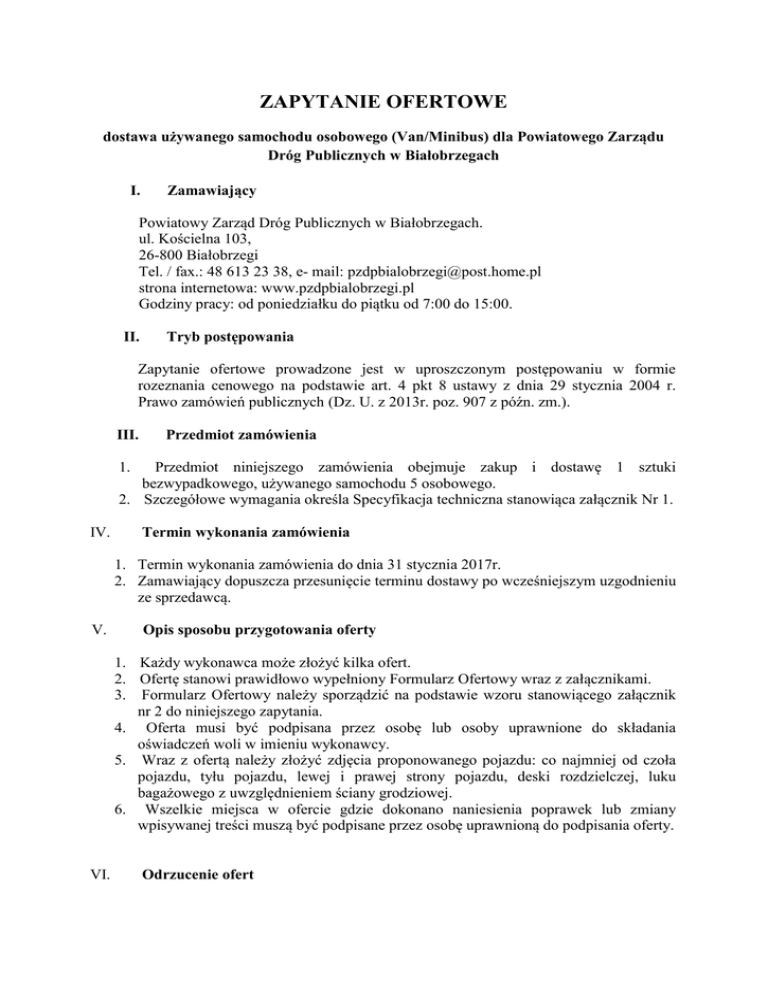 ZAPYTANIE OFERTOWE dostawa używanego samochodu osobowego (Van/Minibus) dla Powiatowego Zarządu Dróg Publicznych w Białobrzegach I. Zamawiający Powiatowy Zarząd Dróg Publicznych w Białobrzegach. ul. Kościelna 103, 26-800 Białobrzegi Tel. / fax.: 48 613 23 38, e- mail: [email protected] strona internetowa: www.pzdpbialobrzegi.pl Godziny pracy: od poniedziałku do piątku od 7:00 do 15:00. II. Tryb postępowania Zapytanie ofertowe prowadzone jest w uproszczonym postępowaniu w formie rozeznania cenowego na podstawie art. 4 pkt 8 ustawy z dnia 29 stycznia 2004 r. Prawo zamówień publicznych (Dz. U. z 2013r. poz. 907 z późn. zm.). III. Przedmiot zamówienia Przedmiot niniejszego zamówienia obejmuje zakup i dostawę 1 sztuki bezwypadkowego, używanego samochodu 5 osobowego. 2. Szczegółowe wymagania określa Specyfikacja techniczna stanowiąca załącznik Nr 1. 1. IV. Termin wykonania zamówienia 1. Termin wykonania zamówienia do dnia 31 stycznia 2017r. 2. Zamawiający dopuszcza przesunięcie terminu dostawy po wcześniejszym uzgodnieniu ze sprzedawcą. V. Opis sposobu przygotowania oferty 1. Każdy wykonawca może złożyć kilka ofert. 2. Ofertę stanowi prawidłowo wypełniony Formularz Ofertowy wraz z załącznikami. 3. Formularz Ofertowy należy sporządzić na podstawie wzoru stanowiącego załącznik nr 2 do niniejszego zapytania. 4. Oferta musi być podpisana przez osobę lub osoby uprawnione do składania oświadczeń woli w imieniu wykonawcy. 5. Wraz z ofertą należy złożyć zdjęcia proponowanego pojazdu: co najmniej od czoła pojazdu, tyłu pojazdu, lewej i prawej strony pojazdu, deski rozdzielczej, luku bagażowego z uwzględnieniem ściany grodziowej. 6. Wszelkie miejsca w ofercie gdzie dokonano naniesienia poprawek lub zmiany wpisywanej treści muszą być podpisane przez osobę uprawnioną do podpisania oferty. VI. Odrzucenie ofert Zamawiający odrzuci oferty niezgodne z zapytaniem ofertowym, szczególnie w zakresie: przedmiotu zamówienia, terminu wykonania zamówienia oraz wymaganego sposobu złożenia oferty. VII. Miejsce oraz termin składania ofert Ofertę należy złożyć w terminie do 16 stycznia 2017r. do godz. 1500 w siedzibie Zamawiającego w kopercie zaklejonej z dopiskiem „Dostawa używanego samochodu osobowego” lub pocztą elektroniczną na adres mailowy Zamawiającego. 2. Oferty złożone po terminie nie będą rozpatrywane, liczy się data i godzina wpływu do siedziby Zamawiającego. 1. VIII. Kryterium oceny ofert IX Zamawiający dokona oceny ważnych ofert na podstawie następujących kryteriów: 1. Cena oferty - 70% 2. Rok produkcji - 30% Informacje dotyczące wyboru najkorzystniejszej oferty Informacja o wyborze najkorzystniejszej oferty zostanie umieszczona przez Zamawiającego na stronie Powiatowego Zarządu Dróg Publicznych w Białobrzegach oraz na tablicy ogłoszeń w siedzibie Zamawiajacego. Ponadto Wykonawca, którego oferta zostanie wybrana, będzie poinformowany o tym fakcie na piśmie oraz pocztą e-mail. Załączniki do zapytania ofertowego: 1. Specyfikacja techniczna 2. Formularz ofertowy 3. Wzór umowy Zamawiający zastrzega sobie prawo unieważnienia postępowania bez podania przyczyn. Załącznik nr 1 Specyfikacja techniczna Dostawa samochodu osobowego typu Van/Minibus z wyposażeniem wg poniższej specyfikacji technicznej: Lp. Minimalne wymagania 1. rok produkcji nie starszy niż 2013 2. liczba miejsc siedzących 5 3. liczba drzwi 4/5 4. silnik – wysokoprężny o mocy minimum 90 KM, o pojemności nie mniejszej niż 1,6 5. skrzynia biegów manualna 6. Systemy bezpieczeństwa ABS, AIRBAG ( czołowe i boczne) 6. przebieg max. 100 000 km ( przebieg udokumentowany) 8. bezwypadkowy 9. klimatyzacja 10. Lakier metalizowany 11. centralny zamek 12. wspomaganie układu kierowniczego 13. pojazd sprawny, nieskorodowany 13. karta pojazdu 14. 15. 16. 17. ogumienie bez uszkodzeń i ubytków z bieżnikiem zużycie kompletu opon – max. 30 % Kompletny pojazd musi być sprawny technicznie oraz gotowy do podjęcia natychmiastowej pracy. Dla pojazdu zarejestrowanego w Polsce: powinien posiadać aktualne badania techniczne potwierdzone wpisem do dowodu rejestracyjnego i aktualne obowiązkowe ubezpieczenie OC. W przypadku gdy pojazd jest zarejestrowany poza granicami kraju: powinien mieć komplet dokumentów wraz z tłumaczeniami przewidzianymi przepisami prawa uprawniającymi do zakupu i zarejestrowania na terenie Polski. 18. 19. 20. 21. Sprzedający winien być właścicielem pojazdu lub mieć pisemne prawo do dysponowania nim. Pojazd winien stanowić prawo własności sprzedającego lub sprzedający winien być uprawniony do sprzedaży tego pojazdu na rachunek właściciela. Pojazd nie może stanowić przedmiotu zabezpieczenia, w tym w szczególności zabezpieczenia bankowego, ani być obciążony prawami na rzecz osób trzecich. Dostawa pojazdu do siedziby Zamawiającego. Uwaga! 1. Dostarczony samochód musi posiadać parametry techniczne nie gorsze niż podane wyżej.. 2. Wraz z ofertą należy złożyć zdjęcia proponowanego pojazdu od czoła pojazdu, tyłu pojazdu, lewej i prawej strony pojazdu, deski rozdzielczej, luku bagażowego. 3. Cena oferty musi zawierać koszty dostarczenia przedmiotu zamówienia do siedziby Zamawiającego. Załącznik nr 2 FORMULARZ OFERTOWY DO ZAPYTANIA OFERTOWEGO O WARTOŚCI SZACUNKOWEJ PONIŻEJ 30 000 EURO Dane dotyczące Wykonawcy Nazwa firmy / Nazwisko i Imię .................................................................................................... …………………………………………………………………. Adres ........................................................................................................................................... Nr telefonu/faks ............................................ ...................................................... e mail …………………………. Nr NIP .......................................................... Nr RE