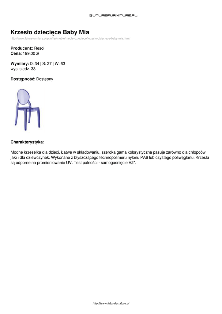 Krzesło dziecięce Baby Mia http://www.futurefurniture.pl/pl/offer/meble/meble-dzieciece/krzeslo-dzieciece-baby-mia.html/ Producent:: Resol Cena: 199.00 zł Wymiary: D: 34 | S: 27 | W: 63 wys. siedz. 33 Dostępność: Dostępny Charakterystyka: Modne krzesełka dla dzieci. Łatwe w składowaniu, szeroka gama kolorystyczna pasuje zarówno dla chłopców jaki i dla dziewczynek. Wykonane z błyszczącego technopolimeru nylonu PA6 lub czystego poliwęglanu. Krzesła są odporne na promieniowanie UV. Test palności - samogaśnięcie V2*. http://www.futurefurniture.pl Dostępne wersje produktu: nazwa produktu Krzesło dziecięce Baby Mia warianty kolor fioletowy transparentny cena 199.00zł dostępne Na zamówienie Krzesło dziecięce Baby Mia kolor biały 199.00zł Dostępny Krzesło dziecięce Baby Mia kolor niebieski transparentny 199.00zł 4-6 tygodni Krzesło dziecięce Baby Mia kolor różowy transparentny 199.00zł 4-6 tygodni Krzesło dziecięce Baby Mia kolor transparentny 199.00zł Dostępny http://www.futurefurniture.pl Zdjęcia produktu: http://www.futurefurniture.pl Powered by TCPDF (www.tcpdf.org)