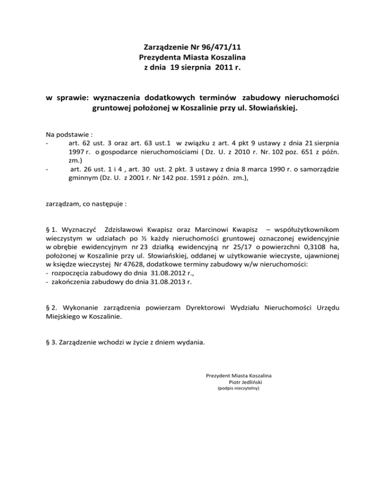 Zarządzenie Nr 96/471/11 Prezydenta Miasta Koszalina z dnia 19 sierpnia 2011 r. w sprawie: wyznaczenia dodatkowych terminów zabudowy nieruchomości gruntowej położonej w Koszalinie przy ul. Słowiańskiej. Na podstawie : art. 62 ust. 3 oraz art. 63 ust.1 w związku z art. 4 pkt 9 ustawy z dnia 21 sierpnia 1997 r. o gospodarce nieruchomościami ( Dz. U. z 2010 r. Nr. 102 poz. 651 z późn. zm.) art. 26 ust. 1 i 4 , art. 30 ust. 2 pkt. 3 ustawy z dnia 8 marca 1990 r. o samorządzie gminnym (Dz. U. z 2001 r. Nr 142 poz. 1591 z późn. zm.), zarządzam, co następuje : § 1. Wyznaczyć Zdzisławowi Kwapisz oraz Marcinowi Kwapisz – współużytkownikom wieczystym w udziałach po ½ każdy nieruchomości gruntowej oznaczonej ewidencyjnie w obrębie ewidencyjnym nr 23 działką ewidencyjną nr 25/17 o powierzchni 0,3108 ha, położonej w Koszalinie przy ul. Słowiańskiej, oddanej w użytkowanie wieczyste, ujawnionej w księdze wieczystej Nr 47628, dodatkowe terminy zabudowy w/w nieruchomości: - rozpoczęcia zabudowy do dnia 31.08.2012 r., - zakończenia zabudowy do dnia 31.08.2013 r. § 2. Wykonanie zarządzenia powierzam Dyrektorowi Wydziału Nieruchomości Urzędu Miejskiego w Koszalinie. § 3. Zarządzenie wchodzi w życie z dniem wydania. Prezydent Miasta Koszalina Piotr Jedliński (podpis nieczytelny) Uzasadnienie do zarządzenia Nr 96/471/11 Prezydenta Miasta Koszalina z dnia 19 sierpnia 2011 r. Nieruchomość gruntowa oznaczona ewidencyjnie w obrębie ewidencyjnym nr 23 działką ewidencyjną nr 25/17 o pow. 0,3108 ha, położona w Koszalinie przy ul. Słowiańskiej, stanowi własność Gminy Miasto Koszalin, we współużytkowaniu wieczystym Panów Zdzisława Kwapisz i Marcina Kwapisz w udziałach po 1/2 każdy. Prawo użytkowania wieczystego ustanowione zostało na czas do dnia 01.12.2096 r. na podstawie umowy oddania gruntu w użytkowanie wieczyste Rep."A"Nr 8182/1997 z dnia 01.12.1997 r. Umową zmiany warunków sposobu zagospodarowania zawartą w formie aktu notarialnego Rep."A"Nr 3031/2009 z dnia 20.03.2009 r. zmieniono warunki umowy z 1997 r. w części dotyczącej sposobu i terminów zagospodarowania przedmiotowej nieruchomości. Wyznaczono wówczas: - termin rozpoczęcia zabudowy do dnia 20.03.2010 r., - termin zakończenia zabudowy do dnia 20.03.2012 r. Na wniosek Stron, Prezydent Miasta Koszalina zarządzeniem Nr 563/2078/10 z dnia 20.04.2010 r. wyznaczył współużytkownikom wieczystym dodatkowy termin rozpoczęcia zabudowy do dnia 30.11.2010 r. W związku z niedotrzymaniem w/w dodatkowego terminu rozpoczęcia zabudowy, w dniu 12.07.2011 r. wszczęte zostało z urzędu postępowanie w sprawie wyjaśnienia przyczyn i ustalenia konsekwencji prawnych niedotrzymania terminu rozpoczęcia zabudowy przedmiotowej nieruchomości. Przeprowadzona wizja w terenie w dniu 26.07.2011 r. przy udziale Pana Zdzisława Kwapisz wykazała, że na nieruchomości brak jest prac wskazujących na toczący się proces inwestycyjny. W piśmie wyjaśniającym Strony powołują się na problem zdrowotny Pana Zdzisława Kwapisz na przełomie roku 2010/2011. Był to czas zmagań z wieloma dolegliwościami zdrowotnymi. Na nadciśnienie tętnicze Pan Zdzisław Kwapisz choruje już od wielu lat, ale lata 2010 i 2011 to ciągłe wizyty u kardiochirurga spowodowane migotaniem i kołataniem przedsionków, to walka z cukrzycą i następstwami nadciśnienia tętniczego. W marcu 2011 roku miał miejsce poważny wypadek samochodowy (dachowanie). Kilka tygodni Strona spędziła na oddziale chirurgii w Koszalinie - tyle czasu wymagało leczenie obrażeń, zwłaszcza lewej ręki, która w wypadku ucierpiała najbardziej (połamane palce, zerwane ścięgna, martwica, przeszczep skóry), a następnie długi okres rehabilitacji powypadkowej. Obecnie stan zdrowia Pana Zdzisława Kwapisz jest zadawalający. Strona deklaruje rozpoczęcie zabudowy nieruchomości gruntowej w terminie do dnia 31.12.2012 r. Zgodnie z art. 63 ust. 1 ustawy z dnia 21 sierpnia 1997 r. o gospodarce nieruchomościami (Dz. U. z 2010 r. Nr 102 poz. 651 z późn. zm.) właściwy organ może wyznaczyć dodatkowy termin zabudowy nieruchomości w razie niedotrzymania wcześniej ustalonych terminów zagospodarowania, o ile wystąpiły okoliczności uniemożliwiające prowadzenie zamierzonej inwestycji w określonym terminie, bez względu na to czy są one niezależne czy też zależne od użytkownika wieczystego.