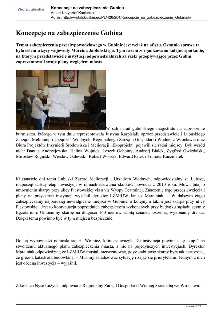 Koncepcje na zabezpieczenie Gubina Autor: Krzysztof Kaciunka Adres: http://wrotalubuskie.eu/PL/426/204/Koncepcje_na_zabezpieczenie_Gubina/k/ Koncepcje na zabezpieczenie Gubina Temat zabezpieczenia przeciwpowodziowego w Gubinie jest wciąż na afiszu. Ostatnio sprawa ta była celem wizyty wojewody Marcina Jabłońskiego. Tym razem zorganizowano kolejne spotkanie, na którym przedstawiciele instytucji odpowiedzialnych za rzeki przepływające przez Gubin zaprezentowali swoje plany względem miasta. W sali narad gubińskiego magistratu na zaproszenie burmistrza, którego w tym dniu reprezentowała Justyna Karpisiak, oprócz przedstawicieli Lubuskiego Zarządu Melioracji i Urządzeń Wodnych, Regionalnego Zarządu Gospodarki Wodnej z Wrocławia oraz Biura Projektów Inżynierii Środowiska i Melioracji „Ekoprojekt” pojawili się radni miejscy. Byli wśród nich: Danuta Andrzejewska, Halina Wojnicz, Leszek Ochotny, Andrzej Białek, Zygfryd Gwizdalski, Mirosław Rogiński, Wiesław Galewski, Robert Woszak, Edward Patek i Tomasz Kaczmarek Kilkanaście dni temu Lubuski Zarząd Melioracji i Urządzeń Wodnych, odpowiedzialny za Lubszę, rozpoczął dalszy etap inwestycji w ramach usuwania skutków powodzi z 2010 roku. Mowa tutaj o umocnieniu skarpy przy ulicy Piastowskiej vis a vis Wyspy Teatralnej. Znaczenie tego przedsięwzięcia i plany na przyszłość instytucji wyjaśnił dyrektor LZMiUW Janusz Marciniak. – W dalszym ciągu zabezpieczamy najbardziej newralgiczne miejsca w Gubinie, a kolejnym takim jest skarpa przy ulicy Piastowskiej. Jest to kontynuacja poprzednich zabezpieczeń wykonanych przy budynku sąsiadującym z Egzotarium. Umocnimy skarpę na długości 160 metrów zabitą ścianką szczelną, wykonamy drenaż. Dzięki temu powinno być w tym miejscu bezpiecznie. Do tej wypowiedzi odniosła się H. Wojnicz, która zauważyła, że instytucja powinna się skupić na stworzeniu aktualnego planu zabezpieczenia miasta, a nie na pojedynczych inwestycjach. Dyrektor Marciniak odpowiedział, że LZMiUW musiał interweniować, gdyż stabilność skarpy była tak naruszona, że groziła katastrofą budowlaną. – Musimy zanalizować sytuację i zająć się priorytetami. Jednym z nich jest obecna inwestycja – wyjaśnił. Z kolei za Nysę Łużycką odpowiada Regionalny Zarząd Gospodarki Wodnej z siedzibą we Wrocławiu. – strona 1 / 2 Koncepcje na zabezpieczenie Gubina Autor: Krzysztof Kaciunka Adres: http://wrotalubuskie.eu/PL/426/204/Koncepcje_na_zabezpieczenie_Gubina/k/ Ogłosiliśmy przetarg na wykonanie projektu udrożnienia koryta i wzmocnienia brzegów rzeki. W lutym 2013 roku projekt ma być gotowy. Jest więc nadzieja, że w przyszłym roku uda się zrealizować zadania, które sobie wyznaczyliśmy – oznajmiła Bogusława Jesionek. – Działania te będą wykonane na odcinku od mostu granicznego aż do północnych granic Gubina. Ponadto zamierzamy naprawić mur oporowy, oczyścić kanał między Nysą a Lubszą i usunąć wszystkie odsypiska. Po przedstawieniu planów na przyszłość, wszyscy zebrani skupili się na zaprezentowanej przez firmę projektową z Zielonej Góry koncepcji zabezpieczenia Gubina przed powodzią. Została ona stworzona w 2003 roku, ale ówczesna Rada Miejska ją odrzuciła. Przedstawione zostały dwa warianty, które zapewniają kompleksową ochronę miasta, jednak kosztem wyburzeń niektórych budynków. – Największym zagrożeniem dla miasta jest cofka z Nysy Łużyckiej ¬– tłumaczyła Teresa Gruszecka, autorka koncepcji. – Projekt zakłada wyburzenie niektórych budynków przy ulicy Piastowskiej i Dąbrowskiego. Jednak wszystko można zaktualizować. Po 9 latach znamy więcej metod ochrony przeciwpowodziowej, więc tak naprawdę wszystko jest możliwe. Jak zauważyła J. Karpisiak trzeba zastanowić się nad każdym wariantem i jego konsekwencjami, a także wprowadzić ewentualne zmiany. – Musimy wybrać najbardziej optymalną wersję zabezpieczenia Gubina - skomentowała zastępca burmistrza. – W tej materii konieczna jest dobra współpraca Rady Miejskiej, wszystkich instytucji i specjalnego zespołu powołanego przez burmistrza. Z pewnością było to jedno z wielu spotkań dotyczących koncepcji zabezpieczenia przeciwpowodziowego naszego miasta. Co do jednego nie było na nim wątpliwości - trzeba zrobić wszystko, żeby wysoka woda więcej nie stanowiła zagrożenia dla mieszkańców Gubina. strona 2 / 2 Powered by TCPDF (www.tcpdf.org)
