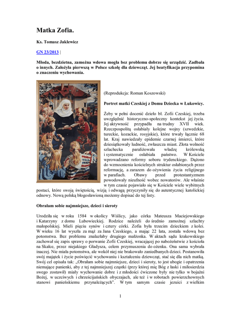 Matka Zofia. Ks. Tomasz Jaklewicz GN 23/2013 | Młoda, bezdzietna, zamożna wdowa mogła bez problemu dobrze się urządzić. Zadbała o innych. Założyła pierwszą w Polsce szkołę dla dziewcząt. Jej beatyfikacja przypomina o znaczeniu wychowania. (Reprodukcja: Roman Koszowski) Portret matki Czeskiej z Domu Dziecka w Łukowicy. Żeby w pełni docenić dzieło bł. Zofii Czeskiej, trzeba uwzględnić historyczno-społeczny kontekst jej życia. Jej aktywność przypadła na trudny XVII wiek. Rzeczpospolitą osłabiały kolejne wojny (szwedzkie, tureckie, kozackie, rosyjskie), które trwały łącznie 68 lat. Kraj nawiedzały epidemie czarnej śmierci, które dziesiątkowały ludność, zwłaszcza miast. Złota wolność szlachecka paraliżowała władzę królewską i systematycznie osłabiała państwo. W Kościele wprowadzano reformy soboru trydenckiego. Dążono do wzmocnienia kościelnych struktur osłabionych przez reformację, a zarazem do ożywienia życia religijnego w parafiach. Obawy przed protestantyzmem powodowały nieufność wobec nowatorów. Ale właśnie w tym czasie pojawiało się w Kościele wiele wybitnych postaci, które swoją świętością, wizją i odwagą przyczyniły się do autentycznej katolickiej odnowy. Nową polską błogosławioną możemy dopisać do tej listy. Obrałam sobie najmniejsze, dzieci i sieroty Urodziła się w roku 1584 w okolicy Wiślicy, jako córka Mateusza Maciejowskiego i Katarzyny z domu Lubowieckiej. Rodzice należeli do średnio zamożnej szlachty małopolskiej. Mieli pięciu synów i cztery córki. Zofia była trzecim dzieckiem z kolei. W wieku 16 lat wyszła za mąż za Jana Czeskiego, a mając 22 lata, została wdową bez potomstwa. Bez problemu znalazłaby drugiego małżonka. W aktach sądu krakowskiego zachował się zapis sprawy o porwanie Zofii Czeskiej, wracającej po nabożeństwie z kościoła na Skałce, przez niejakiego Gładysza, celem przymuszenia do ożenku. Ona sama wybrała inaczej. Nie miała potomstwa, ale wokół niej nie brakowało zaniedbanych dzieci. Postanowiła swój majątek i życie poświęcić wychowaniu i kształceniu dziewcząt, stać się dla nich matką. Swój cel opisała tak: „Obrałam sobie najmniejsze, dzieci i sieroty, to jest ubogie i opatrzenia niemające panienki, aby z tej najmniejszej cząstki (przy której mię Bóg z łaski i miłosierdzia swego zostawił) miały wychowanie dobre i z młodości ćwiczone były nie tylko w bojaźni Bożej, w uczciwych i chrześcijańskich obyczajach, ale też i w robotach powierzchownych stanowi panieńskiemu przynależących”. W tym samym czasie jezuici z wielkim 1 powodzeniem zakładali w całej Europie kolegia kształcące i wychowujące męską młodzież. W Polsce pierwsze powstało w Braniewie w 1564 r., a do kasaty zakonu w 1773 r. założono ich na naszych ziemiach 66. W tamtych czasach wykształcenie było przywilejem mężczyzn. Wychowaniem dziewcząt zajmowały się ich matki. Panny z bogatszych rodzin mogły mieć prywatnego nauczyciela albo oddawano je na dwory. Jedyną instytucją, która dawała kobietom szansę edukacji, były klasztory, które przyjmowały do siebie na wychowanie. Wszystkie żeńskie zakony miały bardzo ścisłą klauzurę. Zofia Czeska postanowiła stworzyć bardziej otwartą, nowatorską instytucję edukacyjno-wychowawczą, wzorując się na modelu jezuickiego kolegium. Mówi się o niej jako o założycielce sióstr prezentek. Słusznie, ale pierwszym jej dziełem była szkoła, którą nazwała Dom Panieński Ofiarowania Najświętszej Maryi Panny. Zgromadzenie zakonne powstało później. Matka Czeska pragnęła reguły zakonnej bez ścisłej klauzury, akcent miał być położony na działalność wychowawczą. Warto wiedzieć, że idea apostolskiej czy charytatywnej działalności żeńskich klasztorów napotykała w tamtej epoce niezrozumiały z dzisiejszej perspektywy opór władz kościelnych. Po soborze trydenckim dążono do uporządkowania dyscypliny zakonnej. W przypadku żeńskich zakonów akcentowano konieczność ścisłej klauzury. Matka Czeska szła więc w jakimś sensie pod prąd trendów swojej epoki. Z grona matek założycielek wyróżnia ją to, że jej Dom Panieński nie był szkołą przyklasztorną, ale odwrotnie, to jej zgromadzenie było „przy-domowe”, czyli zostało powołane dla zapewnienia trwałości dzieła. Żywot na wychowaniu strawić Dom Panieński, zwany także Domem Sierocym, miał siedzibę w Krakowie przy ulicy Szpitalnej 18. Zofia Czeska organizowała go nie bez trudności w latach 1621–1627 z własnych funduszy. Była to pierwsza w Polsce formalnie zorganizowana szkoła żeńska. Obok niej działał internat. Biskup krakowski Marcin Szyszkowski zatwierdził ją 31 maja 1627 r. Decyzję potwierdzili 6 lat później nuncjusz Honorat Visconti oraz król Władysław IV. Protektorem szkoły miał być każdorazowy biskup krakowski, a opiekę duchową sprawowali jezuici z kościoła św. Barbary. Zachował się do dziś bezcenny rękopis pt. „Ustawy albo sposób życia Domu Panieńskiego”. Tekst ten wyszedł spod pióra błogosławionej lub jej sekretarki. Możemy się z niego dowiedzieć, jakie ideały przyświecały domowi Matki Czeskiej. Przyjmowano uczennice w wieku od 7 do 14 lat według trzech kluczy: sieroty i dzieci tak ubogie, że rodzice nie byli w stanie ich utrzymać. Te otrzymywały wszystko bezpłatnie. Drugą grupę stanowiły konwiktorki, czyli córki zamożniejszych rodziców, którzy wnosili pewną opłatę. Najmniej liczna grupa to dziewczyny dochodzące na zajęcia. Uczennice mogły pozostać w domu najdłużej do 16. roku życia. Akcent padał na formację religijną i wychowanie rozumiane jako praktyczne przygotowanie do dorosłego życia w małżeństwie lub w stanie zakonnym. Edukacja obejmowała naukę katechizmu, czytania, pisania i liczenia oraz śpiewu. Uczono także prac „stanowi panieńskiemu przynależących”, czyli szycia, gotowania