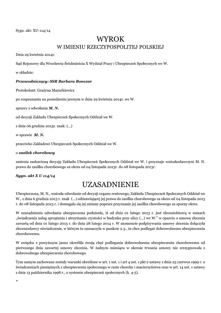 Sygn. akt: XU-114/14 WYROK W IMIENIU RZECZYPOSPOLITEJ POLSKIEJ Dnia 29 kwietnia 2014r. Sąd Rejonowy dla Wrocławia-Śródmieścia X Wydział Pracy i Ubezpieczeń Społecznych we W. w składzie: Przewodniczący: SSR Barbara Bonczar Protokolant: Grażyna Mazurkiewicz po rozpoznaniu na posiedzeniu jawnym w dniu 29 kwietnia 2014r. we W. sprawy z odwołania M. N. od decyzji Zakładu Ubezpieczeń Społecznych Oddział we W. z dnia 06 grudnia 2013r. znak: (...) w sprawie M. N. przeciwko Zakładowi Ubezpieczeń Społecznych Oddział we W. o zasiłek chorobowy zmienia zaskarżoną decyzję Zakładu Ubezpieczeń Społecznych Oddział we W. i przyznaje wnioskodawczyni M. N. prawo do zasiłku chorobowego za okres od 04 listopada 2013r. do 08 listopada 2013r. Sygn. akt X U 114/14 UZASADNIENIE Ubezpieczona, M. N., wniosła odwołanie od decyzji organu rentowego, Zakładu Ubezpieczeń Społecznych Oddział we W., z dnia 6 grudnia 2013 r. znak (...) odmawiającej jej prawa do zasiłku chorobowego za okres od 04 listopada 2013 r. do 08 listopada 2013 r. i domagała się jej zmiany poprzez przyznanie jej zasiłku chorobowego za sporny okres. W uzasadnieniu odwołania ubezpieczona podniosła, iż od dnia 01 lutego 2013 r. jest zleceniobiorcą w ramach „świadczenia usług sprzątania i utrzymania czystości w budynku przy ulicy (...) we W." w oparciu o umowę zlecenia zawartą od dnia 01 lutego 2013 r. do dnia 28 lutego 2014 r. W momencie podpisywania umowy zlecenia dołączyła zleceniodawcy oświadczenie, w którym to zaznaczyła w punkcie 2.3., że chce podlegać dobrowolnemu ubezpieczeniu chorobowemu. W związku z powyższym jasno określiła swoją chęć podlegania dobrowolnemu ubezpieczeniu chorobowemu od pierwszego dnia zawartej umowy zlecenia. W żadnym miesiącu w okresie trwania umowy nie zrezygnowała z dobrowolnego ubezpieczenia chorobowego. Tym samym zachowane zostały warunki określone w art. 1 ust. 1 i art 4 ust. 1 pkt 2 ustawy z dnia 25 czerwca 1999 r. o świadczeniach pieniężnych z ubezpieczenia społecznego w razie choroby i macierzyństwa oraz w art. 14 ust. 1 ustawy z dnia 13 października 1998 r., o systemie ubezpieczeń społecznych (k. 4-5). * Organ rentowy – Zakład Ubezpieczeń Społecznych Oddział we W., w odpowiedzi na odwołanie ubezpieczonej, wniósł o jego oddalenie, z uwagi na brak podstaw prawnych do jego uwzględnienia. W uzasadnieniu swojego stanowiska organ rentowy zarzucił, iż ubezpieczona przedłożyła zwolnienie lekarskie na okres od 04 listopada 2013 r. do 08 listopada 2013 r. Jak wynika z potwierdzenia o dobrowolnym ubezpieczeniu chorobowym z dnia 25 listopada 2013 r. ubezpieczona podlega dobrowolnemu ubezpieczeniu chorobowemu od dnia 21 października 2013 r. (kod (...)) z tytułu zatrudnienia na podstawie umowy zlecenia w firmie (...) Sp. z o. o. z siedzibą we W.. Z uwagi na fakt, iż nie upłynęło 90 dni nieprzerwanego okresu ubezpieczenia chorobowego, organ rentowy uwzględniając brzmienie art. 14 ust. 1 pkt 2 ustawy, decyzją z dnia 6 grudnia 2013 r. postanowił odmówił ubezpieczonej prawa do zasiłku chorobowego za sporny okres (k. 8-v. 8). Sąd Rejonowy ustalił następujący stan faktyczny: W dniu 01 lutego 2013 r. ubezpieczona, M. N., zawarła z firmą (...) sp. z o.o. z siedzibą we W. umowę zlecenie nr (...), w ramach której zobowiązała się do wykonania usług sprzątania i utrzymania czystości w budynku przy ulicy (...) we W.. Umowa została zawarta na okres od 01 lutego 2013 r. do 28 lutego 2014 r. Przy podpisywaniu umowy zlecenia nr (...) ubezpieczona oświadczyła, iż chce podlegać obowiązkowemu ubezpieczeniu emerytalnemu i rentowemu oraz dobrowolnemu chorobowemu. Dodatkowo w dniu 1 lutym 2013 r. strony zawarły umowę zlecenia, w ramach której ubezpieczona zobowiązała się do wykonania dodatkowych czynności sprzątania w związku z organizacją imprezy otwarcia nowej siedziby firmy. Umowa została zawarta na okres od 1 lutego 2013 r. do 28 lutego 2013 r. Dodatkowo w dniu 1 lipca 2013 r. strony zawarły umowę zlecenia, w ramach której ubezpieczona zobowiązała się do wykonania dodatkowych czynności sprzątania w związku z organizacją imprezy wprowadzenia R. na rynek polski. Umowa została zawarta na okres od 01 lipca 2013 r. do 31 lipca 2013 r. Dowody: • przesłuchanie ubezpieczonej M. N. – karta 16 (płyta CD), • oryginał umowy zlecenia nr (...) k. 6 (koperta), • oryginał oświadczenia zleceniobiorcy – karta 6 (koperta), • umowy zlecenia z 01.02.2013 r. i 01.07.2013 r. – w aktach ZUS. Obsługą księgową firmy (...) sp. z o.o. z siedzibą we W. zajmowała się firma zewnętrzna (...) doradztwa prawa podatkowego. (...) rachunkowości. W. S. we W.. Pomimo złożenia deklaracji o przystąpieniu do dobrowolnego ubezpieczenia chorobowego, ubezpieczona bez swojej wiedzy i woli z końcem lutego 2013 r. została wyrejestrowana z ubezpieczenia po czym ponownie zarejestrowana w kwietniu 2013 r., a następnie ponownie wyrejestrowana w maju 2013 r. i znów zarejestrowana w czerwca 2013 r., po czym kolejny raz wyrejestrowana w lipcu 2013 r. i ponownie zarejestrowana w sierpniu 2013 r. Wynagrodzenie za luty 2013 r. (z dwóch umów zlecenia) otrzymała w marcu 2013 r., w kwietniu 2013 r. otrzymała wynagrodzenie za marzec i kwiecień 2013 r., w czerwcu 2013 r. otrzymała wynagrodzenie za maj i czerwiec 2013 r., w sierpniu 2013 r. otrzymała wynagrodzenie za lipiec (z dwóch umów zlecenia) i sierpień 2013 r. Zleceniodawca opłacał za ubezpieczoną składki z tytułu dobrowolnego ubezpieczenia chorobowego, począwszy do lutego 2013 r. W dniu 21 października 2013 r. zostały złożone do organu rentowego dokumenty korygujące anulujące wyrejestrowanie ubezpieczonej z dobrowolnego ubezpieczenia chorobowego. Ubezpieczona przebywała na zwolnieniu lekarskim w okresie od 4-8 listopada 2013 r. W dniu 19 listopada 2013 r. zleceniodawca ubezpieczonej złożył zaświadczenie ZUS Z-3a podając, iż ubezpieczona podle