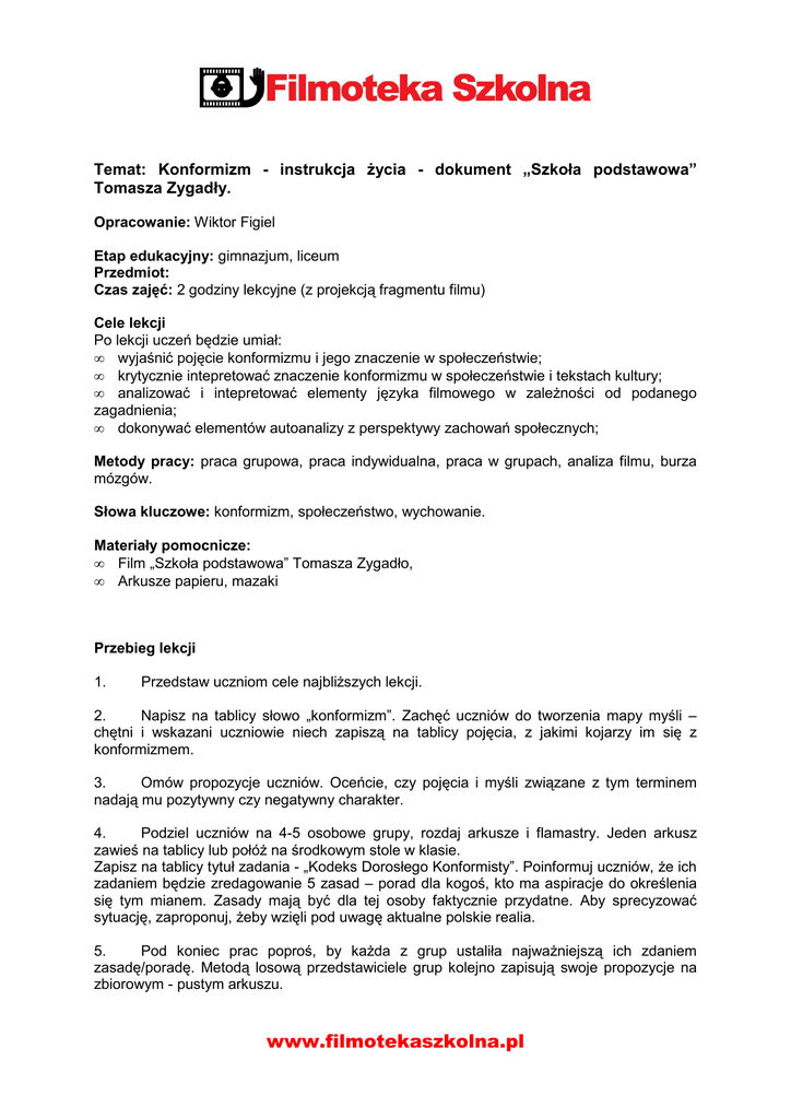 Temat: Konformizm - instrukcja życia - dokument „Szkoła podstawowa” Tomasza Zygadły. Opracowanie: Wiktor Figiel Etap edukacyjny: gimnazjum, liceum Przedmiot: Czas zajęć: 2 godziny lekcyjne (z projekcją fragmentu filmu) Cele lekcji Po lekcji uczeń będzie umiał: • wyjaśnić pojęcie konformizmu i jego znaczenie w społeczeństwie; • krytycznie intepretować znaczenie konformizmu w społeczeństwie i tekstach kultury; • analizować i intepretować elementy języka filmowego w zależności od podanego zagadnienia; • dokonywać elementów autoanalizy z perspektywy zachowań społecznych; Metody pracy: praca grupowa, praca indywidualna, praca w grupach, analiza filmu, burza mózgów. Słowa kluczowe: konformizm, społeczeństwo, wychowanie. Materiały pomocnicze: • Film „Szkoła podstawowa” Tomasza Zygadło, • Arkusze papieru, mazaki Przebieg lekcji 1. Przedstaw uczniom cele najbliższych lekcji. 2. Napisz na tablicy słowo „konformizm”. Zachęć uczniów do tworzenia mapy myśli – chętni i wskazani uczniowie niech zapiszą na tablicy pojęcia, z jakimi kojarzy im się z konformizmem. 3. Omów propozycje uczniów. Oceńcie, czy pojęcia i myśli związane z tym terminem nadają mu pozytywny czy negatywny charakter. 4. Podziel uczniów na 4-5 osobowe grupy, rozdaj arkusze i flamastry. Jeden arkusz zawieś na tablicy lub połóż na środkowym stole w klasie. Zapisz na tablicy tytuł zadania - „Kodeks Dorosłego Konformisty”. Poinformuj uczniów, że ich zadaniem będzie zredagowanie 5 zasad – porad dla kogoś, kto ma aspiracje do określenia się tym mianem. Zasady mają być dla tej osoby faktycznie przydatne. Aby sprecyzować sytuację, zaproponuj, żeby wzięli pod uwagę aktualne polskie realia. 5. Pod koniec prac poproś, by każda z grup ustaliła najważniejszą ich zdaniem zasadę/poradę. Metodą losową przedstawiciele grup kolejno zapisują swoje propozycje na zbiorowym - pustym arkuszu. www.filmotekaszkolna.pl 6. Podsumuj Kodeks, zadając pytania: • • • Jak przebiegało ustalenie znaczenia terminu „dorosły”? Skąd czerpali inspirację do tworzenia zasad? Z doświadczenia, z obserwacji? Czy jest ich zdaniem przydatny? Dlaczego? Zaproponuj uczniom wystawę kodeksu (lub kodeksów wszystkich grup) na terenie szkoły. Zapytaj, jakie reakcje, emocje mogą się pojawić po osobach/uczniach zapoznających się z takim kodeksem. 7. Przeprowadź z uczniami dyskusję. Zadaj pytanie, dlaczego ludzie zachowują się konformistycznie? Wprowadź krótką definicję pojęcia „konformizm”. Spytaj, czy jest ona dla nich zrozumiała. Zapytaj, czy w definicji zawarta jest ocena konformizmu. „Konformizm jest to postawa i zachowanie jednostki polegające na rzeczywistym lub powierzchownym przystosowaniu i podporządkowaniu się wartościom i normom obowiązującym w danej grupie społecznej”. Za: L. Sobkowiak, hasło „Konformizm” w: A. Antoszewski, R. Herbut (red.), Leksykon politologii, s. 227-228. Zapytaj uczniów: Czy konformizm to konieczność? Do rozmowy możesz wprowadzić cytat Milana Kundery: „Jaki to sędzia postanowił, że konformizm jest złem, a nonkonformizm dobrem? Czy przystosować się nie znaczy zbliżyć się do innych ludzi? Czy konformizm nie jest wielkim miejscem spotkania, do którego spływają zewsząd wszyscy, w którym życie jest bardziej gęste, żarliwsze?” - Milan Kundera, Tożsamość. 8. Poproś uczniów o powrót na miejsca i chwilę skupienia. Podyktuj im pytania, na które mają odpowiedzieć pisemnie. Przeznacz na to ćwiczenie nie więcej niż 5 minut. Pytania te zawarte są w materiale pomocniczym nr 1. *Pytania te mogą być potraktowane także jako zadanie domowe przed kolejną lekcją (punktami 7-11). 9. Przedstaw uczniom postać i dokument Tomasza Zygadły. Skorzystaj z materiałów zamieszczonych na stronie www.filmotekaszkolna.pl. 10. Obejrzyj z uczniami fragment dokumentu – jego pierwszą część, do sceny lekcji oceny z wychowania (ok. 7 minut). Uczniowie w parach opracowują pytania z materiału pomocniczego nr 2. Pokaż uczniom ponownie scenę lekcji wychowawczej. 11. Omów propozycje odpowiedzi. 12. Wróć do zadanych uczniom pytań. Zapytaj uczniów o ich odbiór. Czy wszystkim udało się odpowiedzieć w sposób satysfakcjonujący ich samych? Dlaczego autor dokumentu zadał takie pytania? 13. Poproś uczniów o propozycje podobnych pytań, które mogłyby być zadane przez reżysera lub na które chcieliby odpowiedzieć. Zachęć do obejrzenia całego dokumentu Tomasza Zygadły. www.filmotekaszkolna.pl Praca domowa. 1. Odpowiedz pisemnie na jedno z zaproponowanych przez uczniów pytań. 2. Jak rozumiesz i interpretujesz określenie „drapieżny konformizm”? Odpowiedz na pytanie w formie pisemnej. Materiał pomocniczy nr 1 Odpowiedz na poniższe pytania. • Czy myślałeś kiedyś skąd się wzięło to wszystko, co ciebie otacza? Domy, lasy, ludzie...? Podaj swoje wyjaśnienie. • O czym myślisz, kiedy jesteś zupełnie sam? • Czego najbardziej nie rozumiesz? Materiał pomocniczy nr 2 Pytania do analizy fragmentu filmu. • Jakie normy i wartości dostrzegłeś w tym fragmencie? Podaj swoje propozycje. • Jakie źródła zachowań konformistycznych zauważasz w tym dokumencie? • Jak oceniasz postawę autora dokumentu względem wydarzeń na lekcji? Wyciągnij wnioski, analizując: • Punkt widzenia kamery – gdzie jest umieszczona kamera? • Sposób pokazywania bohaterów – jak są pokazywani? W jaki sposób scena jest zmontowana? www.filmotekaszkolna.pl
