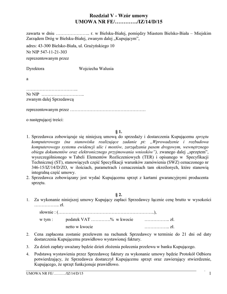 Rozdział V - Wzór umowy UMOWA NR FE/…………./IZ/14/D/15 zawarta w dniu ………………….. r. w Bielsku-Białej, pomiędzy Miastem Bielsko-Biała – Miejskim Zarządem Dróg w Bielsku-Białej, zwanym dalej „Kupującym”, adres: 43-300 Bielsko-Biała, ul. Grażyńskiego 10 Nr NIP 547-11-21-303 reprezentowanym przez Dyrektora Wojciecha Walusia a …………………………….. Nr NIP ……………………….. zwanym dalej Sprzedawcą reprezentowanym przez …………………………………………… o następującej treści: § 1. 1. Sprzedawca zobowiązuje się niniejszą umową do sprzedaży i dostarczenia Kupującemu sprzętu komputerowego (na stanowiska realizujące zadanie pt: ,,Wprowadzenie i rozbudowa komputerowego systemu ewidencji ulic i mostów, zarządzania pasem drogowym, wewnętrznego obiegu dokumentów oraz elektronicznego przyjmowania wniosków”), zwanego dalej ,,sprzętem”, wyszczególnionego w Tabeli Elementów Rozliczeniowych (TER) i opisanego w Specyfikacji Technicznej (ST), stanowiących część Specyfikacji warunków zamówienia (SWZ) oznaczonego nr 346-15/IZ/14/D/ZO, w ilościach, parametrach i oznaczeniach tam określonych, które stanowią integralną część umowy. 2. Sprzedawca zobowiązany jest wydać Kupującemu sprzęt z kartami gwarancyjnymi producenta sprzętu. 1. § 2. Za wykonanie niniejszej umowy Kupujący zapłaci Sprzedawcy łącznie cenę brutto w wysokości …………….. zł. słownie : (………………………………………………………..), w tym : podatek VAT ………….% w kwocie …………….. zł. netto w kwocie …………….. zł. 2. Cena zapłacona zostanie przelewem na rachunek Sprzedawcy w terminie do 21 dni od daty dostarczenia Kupującemu prawidłowo wystawionej faktury. 3. Za dzień zapłaty uważany będzie dzień złożenia polecenia przelewu w banku Kupującego. 4. Podstawą wystawienia przez Sprzedawcę faktury za wykonanie umowy będzie Protokół Odbioru potwierdzający, że Sprzedawca dostarczył Kupującemu sprzęt oraz zawierający stwierdzenie, Kupującego, że sprzęt funkcjonuje prawidłowo. UMOWA NR FE/………./IZ/14/D/15 1 5. 1. 2. 1. Sprzedawca nie może bez pisemnej – pod rygorem nieważności – i uprzedniej zgody Kupującego przenieść na osobę trzecią żadnej wierzytelności wynikającej z niniejszej umowy. § 3. Sprzedawca zobowiązany jest wykonać niniejszą umowę w terminie do 22.12.2015 r. Sprzedawca zobowiązuje się względem Kupującego do dostarczenia zamówionego sprzętu na jego adres, tj. Miejski Zarząd Dróg w Bielsku-Białej, 43-300 Bielsko-Biała, ul. Grażyńskiego 10. Wymienione miejsce jest miejscem wykonania umowy. § 4. W terminie do 5 dni od dnia wykonania umowy zostanie sporządzony Protokół Odbioru Końcowego, podpisany przez Sprzedawcę i Kupującego. 2. Protokół Odbioru, o którym mowa w ust. 1, powinien zawierać w szczególności: 1) datę i miejsce sporządzenia protokołu, 2) datę dostarczenia sprzętu, 3) oświadczenie Kupującego o braku albo o istnieniu wad w realizacji umowy. 3. Zastrzeżenia, o których mowa w ust. 2 pkt 3, Kupujący zgłosi w protokole, jeżeli stwierdzi, że zamówienie nie odpowiada warunkom wskazanym w SWZ i/lub Ofercie Sprzedawcy. 4. W razie zgłoszenia zastrzeżeń w protokole, Kupujący pisemnie wyznaczy Sprzedawcy odpowiedni termin, nie dłuższy jednak niż 2 dni, w celu usunięcia stwierdzonych protokołem wad. Sprzedawca zobowiązuje się usunąć wady w wyznaczonym przez Kupującego terminie, bez osobnego wynagrodzenia z tego tytułu. 5. Po bezskutecznym upływie terminu wyznaczonego na podstawie ust. 4, Kupujący może od umowy odstąpić i żądać od Sprzedawcy zapłaty kary umownej określonej w § 6 ust. 1 pkt c). 1. § 5. Sprzedawca udziela Kupującemu 36 miesięcznej gwarancji na sprzęt licząc od dnia podpisania Protokołu Odbioru przez obie Strony bez zastrzeżeń. Wszelkie koszty napraw gwarancyjnych, w tym koszty transportu ponosi Sprzedawca. 2. Czas reakcji serwisu gwarancyjnego nie może być dłuższy niż 4 h od momentu zgłoszenia. 3. Czas naprawy (usunięcia wady) sprzętu nie przekroczy maksymalnie 24 godziny od momentu zgłoszenia, o którym mowa w ust. 2. 4. Serwis gwarancyjny świadczony będzie w miejscu użytkowania sprzętu, z możliwością naprawy w serwisie Sprzedawcy, jeśli naprawa w siedzibie Kupującego okaże się niemożliwa. 5. Jeżeli czas naprawy przekroczy 24 h licząc od zgłoszenia, o którym mowa w ust. 2, bądź naprawa w miejscu użytkowania nie będzie możliwa, Sprzedawca na czas naprawy udostępni zastępczy sprzęt (element sprzętu) o nie gorszych parametrach i standardach jak naprawiany. 6. Po wykonaniu 3 napraw gwarancyjnych danego sprzętu (elementu sprzętu), Sprzedawca na żądanie Kupującego zobowiązany jest do wymiany wadliwego sprzętu (elementu sprzętu) na nowy, wolny od wad, w terminie 14 dni od dnia zgłoszenia takiego żądania. 7. W przypadku wymiany sprzętu (elementu sprzętu) na nowy, wolny od wad, okres gwarancji wymienionego sprzętu (elementu sprzętu) biegnie na nowo od daty jego dostarczenia. Strony ustalają, że odpowiedzialność Sprzedawcy z tytułu rękojmi za wady zostaje rozszerzona poprzez udzielenie rękojmi na okres 36 miesięcy. UMOWA NR FE/………./IZ/14/D/15 2 8. 9. 1. Do gwarancji określonej w ust. 1 mają odpowiednie zastosowanie przepisy art. 577 do 581 kodeksu cywilnego. § 6. Strony postanawiają, że Sprzedawca zapłaci Kupującemu kary umowne: a) za zwłokę w wykonaniu umowy - w wysokości 100,00 zł. za każdy dzień zwłoki; b) za zwłokę w usunięciu wad sprzętu, stwierdzonych w okresie rękojmi i/bądź gwarancji – w wysokości 100,00 zł., za każdy dzień zwłoki; c) w przypadku odstąpienia od umowy przez Sprzedawcę lub Kupującego wskutek okoliczności, za które odpowiada Sprzedawca, w wysokości 5000,00 zł. 2. Kupujący może żądać odszkodowania przenoszącego wysokość z