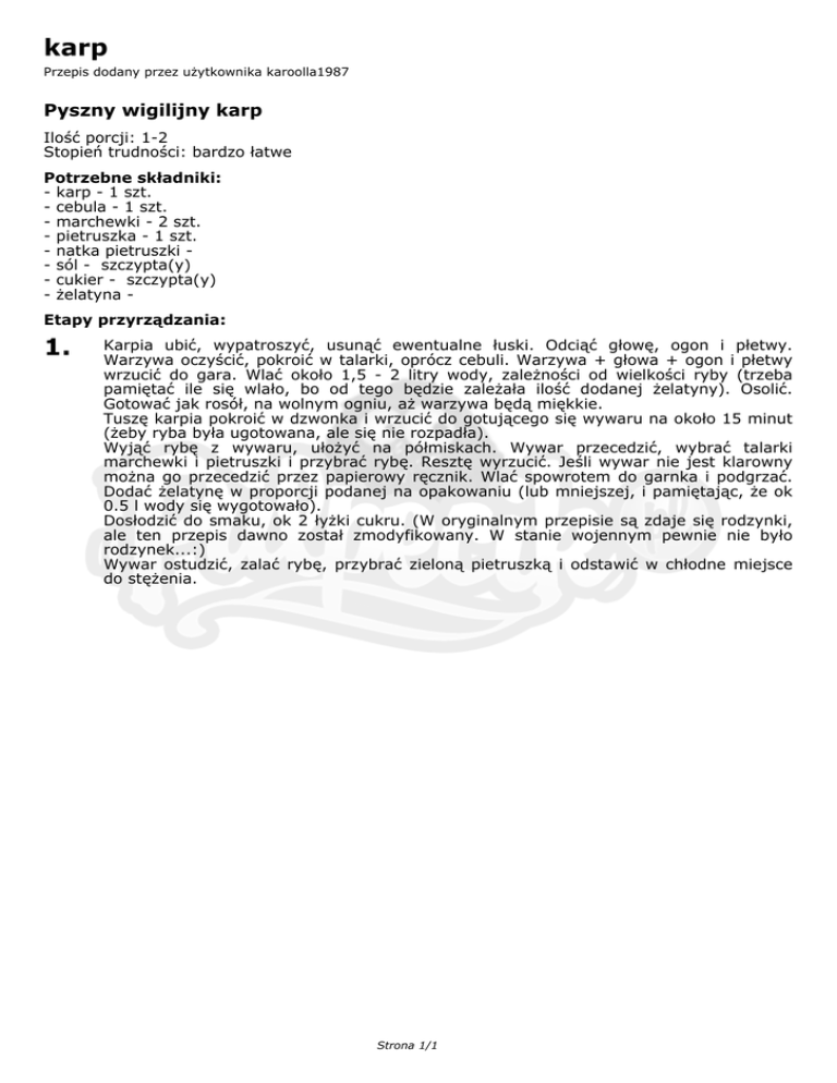 karp Przepis dodany przez użytkownika karoolla1987 Pyszny wigilijny karp Ilość porcji: 1-2 Stopień trudności: bardzo łatwe Potrzebne składniki: - karp - 1 szt. - cebula - 1 szt. - marchewki - 2 szt. - pietruszka - 1 szt. - natka pietruszki - sól - szczypta(y) - cukier - szczypta(y) - żelatyna Etapy przyrządzania: 1. Karpia ubić, wypatroszyć, usunąć ewentualne łuski. Odciąć głowę, ogon i płetwy. Warzywa oczyścić, pokroić w talarki, oprócz cebuli. Warzywa + głowa + ogon i płetwy wrzucić do gara. Wlać około 1,5 - 2 litry wody, zależności od wielkości ryby (trzeba pamiętać ile się wlało, bo od tego będzie zależała ilość dodanej żelatyny). Osolić. Gotować jak rosół, na wolnym ogniu, aż warzywa będą miękkie. Tuszę karpia pokroić w dzwonka i wrzucić do gotującego się wywaru na około 15 minut (żeby ryba była ugotowana, ale się nie rozpadła). Wyjąć rybę z wywaru, ułożyć na półmiskach. Wywar przecedzić, wybrać talarki marchewki i pietruszki i przybrać rybę. Resztę wyrzucić. Jeśli wywar nie jest klarowny można go przecedzić przez papierowy ręcznik. Wlać spowrotem do garnka i podgrzać. Dodać żelatynę w proporcji podanej na opakowaniu (lub mniejszej, i pamiętając, że ok 0.5 l wody się wygotowało). Dosłodzić do smaku, ok 2 łyżki cukru. (W oryginalnym przepisie są zdaje się rodzynki, ale ten przepis dawno został zmodyfikowany. W stanie wojennym pewnie nie było rodzynek...:) Wywar ostudzić, zalać rybę, przybrać zieloną pietruszką i odstawić w chłodne miejsce do stężenia. Strona 1/1