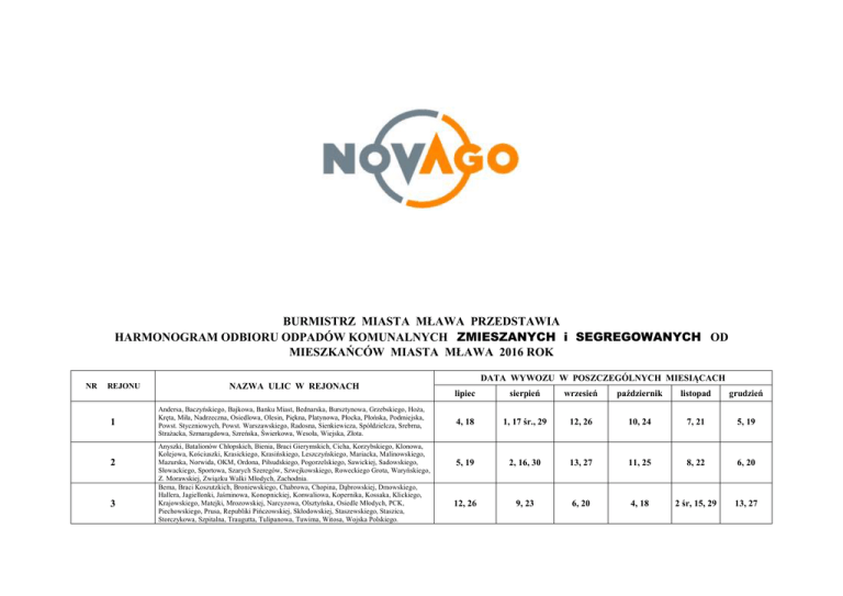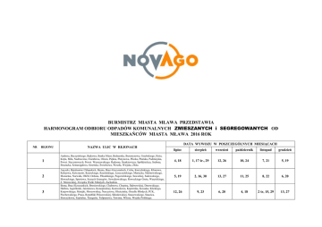 BURMISTRZ MIASTA MŁAWA PRZEDSTAWIA HARMONOGRAM ODBIORU ODPADÓW KOMUNALNYCH ZMIESZANYCH i SEGREGOWANYCH OD MIESZKAŃCÓW MIASTA MŁAWA 2016 ROK NR REJONU 1 2 3 NAZWA ULIC W REJONACH Andersa, Baczyńskiego, Bajkowa, Banku Miast, Bednarska, Bursztynowa, Grzebskiego, Hoża, Kręta, Miła, Nadrzeczna, Osiedlowa, Olesin, Piękna, Platynowa, Płocka, Płońska, Podmiejska, Powst. Styczniowych, Powst. Warszawskiego, Radosna, Sienkiewicza, Spółdzielcza, Srebrna, Strażacka, Szmaragdowa, Szreńska, Świerkowa, Wesoła, Wiejska, Złota. Anyszki, Batalionów Chłopskich, Bienia, Braci Gierymskich, Cicha, Korzybskiego, Klonowa, Kolejowa, Kościuszki, Krasickiego, Krasińskiego, Leszczyńskiego, Mariacka, Malinowskiego, Mazurska, Norwida, OKM, Ordona, Piłsudskiego, Pogorzelskiego, Sawickiej, Sadowskiego, Słowackiego, Sportowa, Szarych Szeregów, Szwejkowskiego, Roweckiego Grota, Waryńskiego, Z. Morawskiej, Związku Walki Młodych, Zachodnia. Bema, Braci Koszutzkich, Broniewskiego, Chabrowa, Chopina, Dąbrowskiej, Dmowskiego, Hallera, Jagiellonki, Jaśminowa, Konopnickiej, Konwaliowa, Kopernika, Kossaka, Klickiego, Krajowskiego, Matejki, Mrozowskiej, Narcyzowa, Olsztyńska, Osiedle Młodych, PCK, Piechowskiego, Prusa, Republiki Pińczowskiej, Skłodowskiej, Staszewskiego, Staszica, Storczykowa, Szpitalna, Traugutta, Tulipanowa, Tuwima, Witosa, Wojska Polskiego. DATA WYWOZU W POSZCZEGÓLNYCH MIESIĄCACH lipiec sierpień wrzesień październik listopad grudzień 4, 18 1, 17 śr., 29 12, 26 10, 24 7, 21 5, 19 5, 19 2, 16, 30 13, 27 11, 25 8, 22 6, 20 12, 26 9, 23 6, 20 4, 18 2 śr, 15, 29 13, 27 4 Armii Krajowej, Dudzińskiego, Kleniewskiego, Kowalczyka, Korczaka, Księcia Maciusia, Kwiatowa, Lawicz - Liszki, Leśna, Lipowa, Łąkowa, Misia Puchatka, Narodowych Sił Zbrojnych, Nowoleśna, Piotra Skargi, Padlewskiego, Parkowa, Powst. Wielkopolskich, Promyk, Spokojna, Szkolna, Torfa Załęskiego, Willowa, Wojtostwo, Wyszyńskiego, Wymyślin, Żołnierzy 80 P.P, 14, 28 11, 25 8, 22 6, 20 3, 17 1, 15, 29 5 Bagińskiego, Bukowa, Cegielnia, Daleka, Dobra, Dzierzgowska, Fedorczyka, Gliniana, Hubala, Handlowa, Jesionowa, Jana i Włodzimierza Lech, Karcza, Krucza, Maczka, Mandyća, Malinowa, Nowowiejska, Ogrodowa, Olszynowa, Paderewskiego, Piaskowa, Polna, Poświętna, Poziomkowa, Reja, Rybacka, Rzęgnowska, Sadowa, Sikorskiego, Słoneczna, Smolarnia, Sucharskiego, Targowa, Wałowa, Warszawska, Wiśniowa, Wasiłowskiego, Zabrody, Żabieniec. 7, 21 4, 18 1, 15, 29 13, 27 10, 24 8, 22 11, 25 8, 22 5, 19 3, 17, 31 14, 28 12, 28 śr 8, 22 5, 19 2, 16, 30 14, 28 12 sob, 25 9, 23 1, 15, 29 12, 26 9, 23 7, 21 4, 18 2, 16, 30 6 7 8 30 - Lecia LWP, Akacjowa, Altera, Błękitna, Brzozowa, Ciechanowska, Cmentarna, Dobrskiej, Grudkowskiego, Górna, Jasna, Jasińskiego, Krajewo, Kryszkiewicza, Kryształowa, Lazurowa, Łojewskiego, Makowa, Napoleońska, Nowa, Nowowiejskiego, Okrężna, Ostaszewskiego, Piekiełko, Podborna, Podgórna, Pużaka, Różana, Rzymowskiego, Skrobińskiego, Sosnowa, Studzieniec, Wetmańskiego, Wysoka, Witwickiego, Zimnocha. 20 Dywizji Piechoty Wojska Polskiego, Batorego, Bracka, Brukowa, Ceglana, Ciasna, Czechowskiej, Dworcowa, Fortepianowa, Gitarowa, Gdyńska, Graniczna, Grzybowa, Hanny Rudzkiej - Cybisowej, Kapliczna, Kościelna, Krajewskiego, Krótka, Ligi Obrony Kraju, Łączna, Majowa, Mała, Mickiewicza, Moniuszki, Niecała, Niska, Obrońców Mławy, Przyrynek, Rynkowa, Smyczkowa, Sokalskiego, Szymanowskiego, Sygietyńskiego,Tęczowa, Turystyczna, Tekli Bądarzewskiej, Żuromińska, Żwirowa. Bagno, Browarna, Chrobrego, Długa, Grabowskiego, Jaroszyka, Kolbe, Kochanowskiego, Krzywa, Lelewela, Misjonarska, Narutowicza, 3 Maja, 18 Stycznia, Okólna, Pl. 1 Maja, Pl. 3 Maja, Reymonta, Sądowa, Spichrzowa, Stary Rynek, Wąska, Wyspiańskiego, Wigury, Zduńska, Zacisze, Żeromskiego, Żwirki. Uprzejmie prosimy o wystawianie odpadów przeznaczonych do odbioru przed posesję do godziny 6:00 rano zgodnie z powyższym harmonogramem. Zastrzegamy, iż firma nie ponosi odpowiedzialności za ewentualne uszkodzenia lub sytuacje problemowe wynikające z wtargnięcia naszych pracowników na działki prywatne mieszkańców. W związku z powyższym prosimy o wystawianie odpadów przeznaczonych do odbioru przed posesje. Za ewentualne utrudnienia przepraszamy.