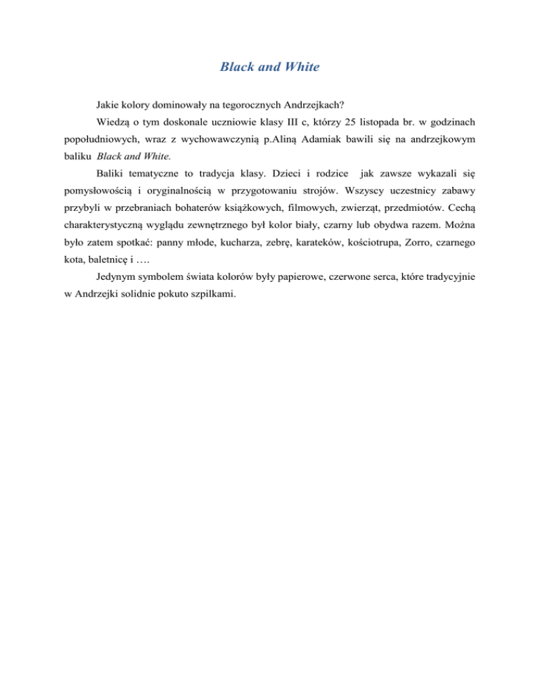 Black and White Jakie kolory dominowały na tegorocznych Andrzejkach? Wiedzą o tym doskonale uczniowie klasy III c, którzy 25 listopada br. w godzinach popołudniowych, wraz z wychowawczynią p.Aliną Adamiak bawili się na andrzejkowym baliku Black and White. Baliki tematyczne to tradycja klasy. Dzieci i rodzice jak zawsze wykazali się pomysłowością i oryginalnością w przygotowaniu strojów. Wszyscy uczestnicy zabawy przybyli w przebraniach bohaterów książkowych, filmowych, zwierząt, przedmiotów. Cechą charakterystyczną wyglądu zewnętrznego był kolor biały, czarny lub obydwa razem. Można było zatem spotkać: panny młode, kucharza, zebrę, karateków, kościotrupa, Zorro, czarnego kota, baletnicę i …. Jedynym symbolem świata kolorów były papierowe, czerwone serca, które tradycyjnie w Andrzejki solidnie pokuto szpilkami.