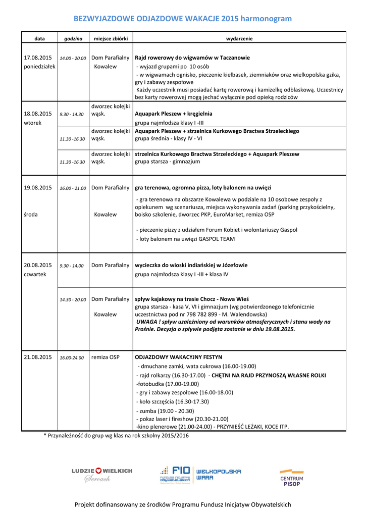 BEZWYJAZDOWE ODJAZDOWE WAKACJE 2015 harmonogram data godzina miejsce zbiórki wydarzenie 17.08.2015 14.00 - 20.00 Dom Parafialny Rajd rowerowy do wigwamów w Taczanowie poniedziałek Kowalew - wyjazd grupami po 10 osób - w wigwamach ognisko, pieczenie kiełbasek, ziemniaków oraz wielkopolska gzika, gry i zabawy zespołowe Każdy uczestnik musi posiadać kartę rowerową i kamizelkę odblaskową. Uczestnicy bez karty rowerowej mogą jechać wyłącznie pod opieką rodziców dworzec kolejki 18.08.2015 9.30 - 14.30 wąsk. Aquapark Pleszew + kręgielnia wtorek 19.08.2015 11.30 -16.30 grupa najmłodsza klasy I -III dworzec kolejki Aquapark Pleszew + strzelnica Kurkowego Bractwa Strzeleckiego wąsk. grupa średnia - klasy IV - VI 11.30 -16.30 dworzec kolejki strzelnica Kurkowego Bractwa Strzeleckiego + Aquapark Pleszew wąsk. grupa starsza - gimnazjum 16.00 - 21.00 Dom Parafialny gra terenowa, ogromna pizza, loty balonem na uwięzi środa Kowalew - gra terenowa na obszarze Kowalewa w podziale na 10 osobowe zespoły z opiekunem wg scenariusza, miejsca wykonywania zadań (parking przykościelny, boisko szkolenie, dworzec PKP, EuroMarket, remiza OSP - pieczenie pizzy z udziałem Forum Kobiet i wolontariuszy Gaspol - loty balonem na uwięzi GASPOL TEAM 20.08.2015 9.30 - 14.00 Dom Parafialny wycieczka do wioski indiańskiej w Józefowie czwartek 21.08.2015 grupa najmłodsza klasy I -III + klasa IV 14.30 - 20.00 Dom Parafialny spływ kajakowy na trasie Chocz - Nowa Wieś grupa starsza - kasa V, VI i gimnazjum (wg potwierdzonego telefonicznie Kowalew uczestnictwa pod nr 798 782 899 - M. Walendowska) UWAGA ! spływ uzależniony od warunków atmosferycznych i stanu wody na Prośnie. Decyzja o spływie podjęta zostanie w dniu 19.08.2015. 16.00-24.00 remiza OSP ODJAZDOWY WAKACYJNY FESTYN - dmuchane zamki, wata cukrowa (16.00-19.00) - rajd rolkarzy (16.30-17.00) - CHĘTNI NA RAJD PRZYNOSZĄ WŁASNE ROLKI -fotobudka (17.00-19.00) - gry i zabawy zespołowe (16.00-18.00) - koło szczęścia (16.30-17.30) - zumba (19.00 - 20.30) - pokaz laser i fireshow (20.30-21.00) -kino plenerowe (21.00-24.00) - PRZYNIEŚĆ LEŻAKI, KOCE ITP. * Przynależność do grup wg klas na rok szkolny 2015/2016 Projekt dofinansowany ze środków Programu Fundusz Inicjatyw Obywatelskich