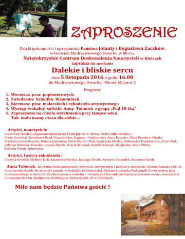 ZAPROSZENIE Dzięki gościnności i uprzejmości Państwa Jolanty i Bogusława Żaczków, właścicieli Modrzewiowego Dworku w Mircu, Świętokrzyskie Centrum Doskonalenia Nauczycieli w Kielcach zaprasza na spotkanie Dalekie i bliskie sercu dnia 5 listopada 2016 o godz. 16.00 do Modrzewiowego Dworku, Mirzec Majorat 2 1. 2. 3. 4. 5. Program: Wernisaż prac poplenerowych Zwiedzanie Saloniku Wspomnień Kiermasz prac malarskich i rękodzieła artystycznego Występ wokalny solistki Anny Toborek z grupy „Pod 10-tką” Zapraszamy na chwilę wytchnienia przy lampce wina Tak mało mamy czasu dla siebie… Artyści, nauczyciele uczestnicy szkoleń, organizowanych przez ŚCDN Kielce, w Mircu i Wólce Milanowskiej : Edyta Drożdżał, Stanisława Grad, Krzysztof Jas, Zygmunt Hajdorowicz, Anna Kawalec, Alina Kundera–Chutko, Krystyna Lewandowska, Natalia Łakomska, Daria Maroń–Ptak, Agnieszka Maślak, Aleksandra Potocka–Kuc, Artur Ptak, Jadwiga Rafalska–Kawalec, Lucyna Rybak, Wojciech Rybak, Kamila Sobczyk–Karpińska, Alicja Wikło, Barbara Wnuk–Spirowska Artyści, twórcy rękodzieła : Grażyna Gwóźdź, Elżbieta Jach, Kazimiera Marlica, Jadwiga Serafin, Grażyna Staszałek, Sławomir Surdy Anna Toborek - laureatka wielu konkursów i festiwali, zdobywczyni I miejsca w konkursie Talenty Końskie (2014). Absolwentka Szkoły Muzycznej I stopnia w Końskich (wiolonczela). Obecnie studentka Pedagogiki Uniwersytetu Jana Kochanowskiego w Kielcach. Zainteresowania wokalne rozwijała pod kierunkiem Krystyny Lewandowskiej, nauczyciela Gimnazjum Nr1 im. Kazimierza Wielkiego w Radoszycach, SP w Górnikach. Miło nam będzie Państwa gościć !