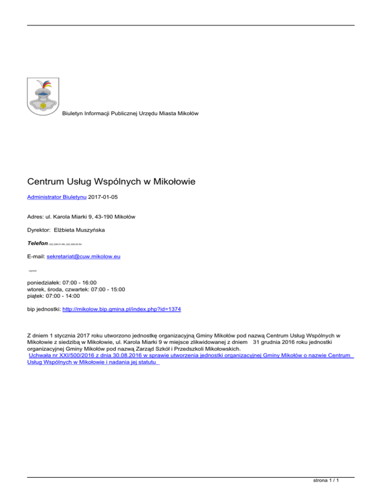 Biuletyn Informacji Publicznej Urzędu Miasta Mikołów Centrum Usług Wspólnych w Mikołowie Administrator Biuletynu 2017-01-05 Adres: ul. Karola Miarki 9, 43-190 Mikołów Dyrektor: Elżbieta Muszyńska Telefon: (32) 226-01-69, (32) 226-20-54 E-mail: [email protected] czynne: poniedziałek: 07:00 - 16:00 wtorek, środa, czwartek: 07:00 - 15:00 piątek: 07:00 - 14:00 bip jednostki: http://mikolow.bip.gmina.pl/index.php?id=1374 Z dniem 1 stycznia 2017 roku utworzono jednostkę organizacyjną Gminy Mikołów pod nazwą Centrum Usług Wspólnych w Mikołowie z siedzibą w Mikołowie, ul. Karola Miarki 9 w miejsce zlikwidowanej z dniem 31 grudnia 2016 roku jednostki organizacyjnej Gminy Mikołów pod nazwą Zarząd Szkół i Przedszkoli Mikołowskich. Uchwała nr XXI/500/2016 z dnia 30.08.2016 w sprawie utworzenia jednostki organizacyjnej Gminy Mikołów o nazwie Centrum Usług Wspólnych w Mikołowie i nadania jej statutu strona 1 / 1 Powered by TCPDF (www.tcpdf.org)