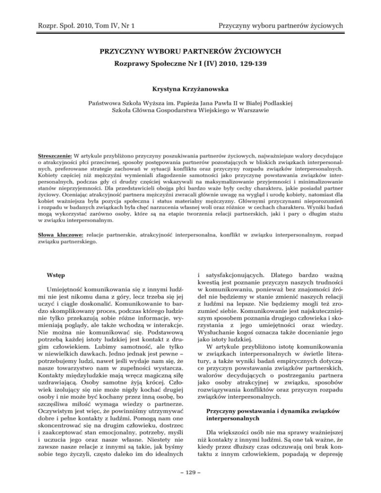 Rozpr. Społ. 2010, Tom IV, Nr 1 Przyczyny wyboru partnerów życiowych PRZYCZYNY WYBORU PARTNERÓW ŻYCIOWYCH Rozprawy Społeczne Nr I (IV) 2010, 129-139 Krystyna Krzyżanowska Państwowa Szkoła Wyższa im. Papieża Jana Pawła II w Białej Podlaskiej Szkoła Główna Gospodarstwa Wiejskiego w Warszawie Streszczenie: W artykule przybliżono przyczyny poszukiwania partnerów życiowych, najważniejsze walory decydujące o atrakcyjności płci przeciwnej, sposoby postępowania partnerów pozostających w bliskich związkach interpersonalnych, preferowane strategie zachowań w sytuacji konfliktu oraz przyczyny rozpadu związków interpersonalnych. Kobiety częściej niż mężczyźni wymieniali złagodzenie samotności jako przyczynę powstawania związków interpersonalnych, podczas gdy ci drudzy częściej wskazywali na maksymalizowanie przyjemności i minimalizowanie stanów nieprzyjemności. Dla przedstawicieli obojga płci bardzo waże były cechy charakteru, jakie posiadał partner życiowy. Oceniając atrakcyjność partnera mężczyźni zwracali głównie uwagę na wygląd i urodę kobiety, natomiast dla kobiet ważniejsza była pozycja społeczna i status materialny mężczyzny. Głównymi przyczynami nieporozumień i rozpadu w badanych związkach była chęć narzucenia własnej woli oraz różnice w cechach charakteru. Wyniki badań mogą wykorzystać zarówno osoby, które są na etapie tworzenia relacji partnerskich, jaki i pary o długim stażu w związku interpersonalnym. Słowa kluczowe: relacje partnerskie, atrakcyjność interpersonalna, konflikt w związku interpersonalnym, rozpad związku partnerskiego. Wstęp Umiejętność komunikowania się z innymi ludźmi nie jest nikomu dana z góry, lecz trzeba się jej uczyć i ciągle doskonalić. Komunikowanie to bardzo skomplikowany proces, podczas którego ludzie nie tylko przekazują sobie różne informacje, wymieniają poglądy, ale także wchodzą w interakcje. Nie można nie komunikować się. Podstawową potrzebą każdej istoty ludzkiej jest kontakt z drugim człowiekiem. Lubimy samotność, ale tylko w niewielkich dawkach. Jedno jednak jest pewne – potrzebujemy ludzi, nawet jeśli wydaje nam się, że nasze towarzystwo nam w zupełności wystarcza. Kontakty międzyludzkie mają wręcz magiczną siłę uzdrawiającą. Osoby samotne żyją krócej. Człowiek izolujący się nie może nigdy kochać drugiej osoby i nie może być kochany przez inną osobę, bo szczęśliwa miłość wymaga wiedzy o partnerze. Oczywistym jest więc, że powinniśmy utrzymywać dobre i pełne kontakty z ludźmi. Pomogą nam one skoncentrować się na drugim człowieku, dostrzec i zaakceptować stan emocjonalny, potrzeby, myśli i uczucia jego oraz nasze własne. Niestety nie zawsze nasze relacje z innymi są takie, jak byśmy sobie tego życzyli, często daleko im do idealnych i satysfakcjonujących. Dlatego bardzo ważną kwestią jest poznanie przyczyn naszych trudności w komunikowaniu, ponieważ bez znajomości źródeł nie będziemy w stanie zmienić naszych relacji z ludźmi na lepsze. Nie będziemy mogli też zrozumieć siebie. Komunikowanie jest najskuteczniejszym sposobem poznania drugiego człowieka i skorzystania z jego umiejętności oraz wiedzy. Wysłuchanie kogoś oznacza także docenianie jego jako istoty ludzkiej. W artykule przybliżono istotę komunikowania w związkach interpersonalnych w świetle literatury, a także wyniki badań empirycznych dotyczące przyczyn powstawania związków partnerskich, walorów decydujących o postrzeganiu partnera jako osoby atrakcyjnej w związku, sposobów rozwiązywania konfliktów oraz przyczyn rozpadu związków interpersonalnych. Przyczyny powstawania i dynamika związków interpersonalnych Dla większości osób nie ma sprawy ważniejszej niż kontakty z innymi ludźmi. Są one tak ważne, że kiedy przez dłuższy czas odczuwają oni brak kontaktu z innym człowiekiem, popadają w depresję – 129 – Rozpr. Społ. 2010, Tom IV, Nr 1 Przyczyny wyboru partnerów życiowych i pojawia się u nich coś w rodzaju głębokiego zwątpienia w siebie. Stany te mogą prowadzić do poważnych trudności w codziennym życiu. Jednym z najważniejszych elementów składowych szczęścia oprócz pieniędzy, ciekawej pracy i seksu, jest bliska więź z drugą osobą. Każda osoba nawiązuje kontakty z innymi kierując się niepowtarzalnymi, indywidualnymi przesłankami. Nie istnieją dwa związki, które byłyby wynikiem dokładnie tej samej przyczyny, a to oznacza, iż miliony motywów powodują nawiązywanie wzajemnych kontaktów interpersonalnych (Głodowski 2001, s. 200). Do głównych przyczyn rozwoju więzi międzyosobowych można zaliczyć: złagodzenie samotności, poszukiwanie źródeł pobudzenia, nawiązanie kontaktu w celu poznania samego siebie, maksymalizowanie przyjemności i minimalizowanie stanów nieprzyjemności (Agryle 2002). Większość związków interpersonalnych rozwija się stopniowo. Możemy powiedzieć o ogólnym opisie rozwoju związków, wyróżniając w nim poszczególne uniwersalne etapy. Jednak etapy te mogą następować w opisanym porządku, kolejnych sekwencjach lub nie – związek nie musi być stale progresywny lub progresja nie musi dotyczyć obu stron jednocześnie – może on być regresywny lub rozwijać się w różnych pożądanych dla obu stron kierunkach, zmieniać się jak każdy z uczestników. Związek dwojga osób może się ustabilizować na określonym etapie, umacniać, stawać się coraz słabszy, a nawet zupełnie rozpaść się. Związki zawsze zmieniają się i wymieniona lista etapów może stwarzać mylne wrażenie, że kiedy osiągnięty został jeden etap, związek jest ustabilizowany. Tak nie jest, bo zawsze może coś wydarzyć się w nieoczekiwanym momencie. Mimo iż strony oczekują od siebie, że będą reagowały w taki sam sposób przez cały czas, doświadczenie wskazuje, że każdy uczestnik związku zmienia się, a co z