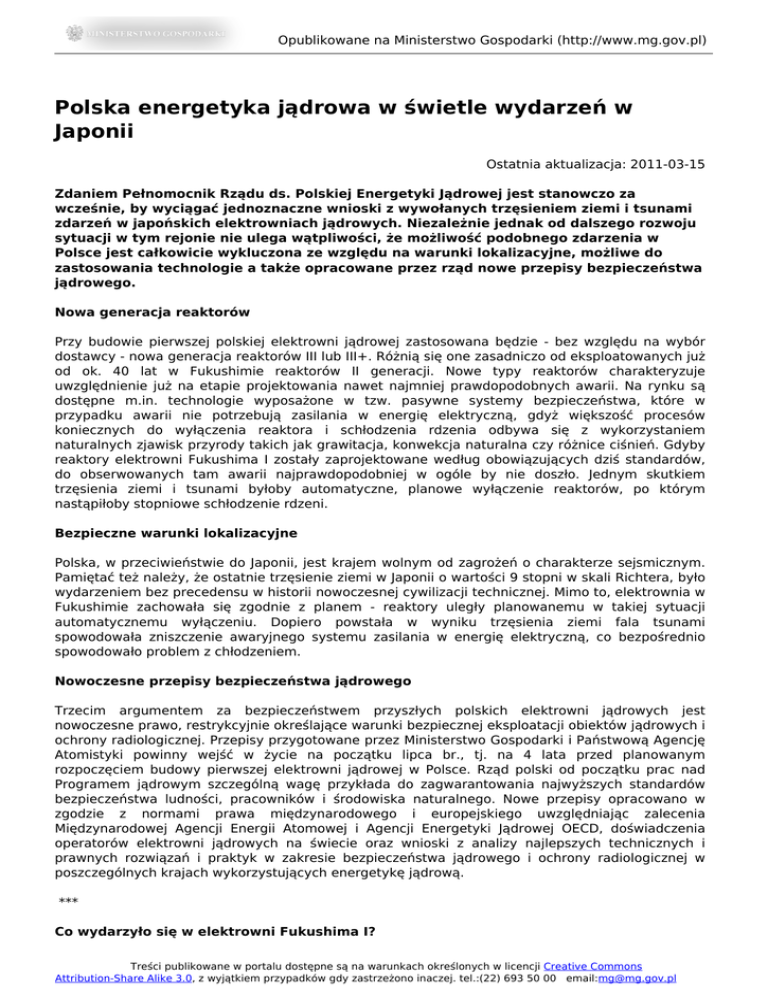 Opublikowane na Ministerstwo Gospodarki (http://www.mg.gov.pl) Polska energetyka jądrowa w świetle wydarzeń w Japonii Ostatnia aktualizacja: 2011-03-15 Zdaniem Pełnomocnik Rządu ds. Polskiej Energetyki Jądrowej jest stanowczo za wcześnie, by wyciągać jednoznaczne wnioski z wywołanych trzęsieniem ziemi i tsunami zdarzeń w japońskich elektrowniach jądrowych. Niezależnie jednak od dalszego rozwoju sytuacji w tym rejonie nie ulega wątpliwości, że możliwość podobnego zdarzenia w Polsce jest całkowicie wykluczona ze względu na warunki lokalizacyjne, możliwe do zastosowania technologie a także opracowane przez rząd nowe przepisy bezpieczeństwa jądrowego. Nowa generacja reaktorów Przy budowie pierwszej polskiej elektrowni jądrowej zastosowana będzie - bez względu na wybór dostawcy - nowa generacja reaktorów III lub III+. Różnią się one zasadniczo od eksploatowanych już od ok. 40 lat w Fukushimie reaktorów II generacji. Nowe typy reaktorów charakteryzuje uwzględnienie już na etapie projektowania nawet najmniej prawdopodobnych awarii. Na rynku są dostępne m.in. technologie wyposażone w tzw. pasywne systemy bezpieczeństwa, które w przypadku awarii nie potrzebują zasilania w energię elektryczną, gdyż większość procesów koniecznych do wyłączenia reaktora i schłodzenia rdzenia odbywa się z wykorzystaniem naturalnych zjawisk przyrody takich jak grawitacja, konwekcja naturalna czy różnice ciśnień. Gdyby reaktory elektrowni Fukushima I zostały zaprojektowane według obowiązujących dziś standardów, do obserwowanych tam awarii najprawdopodobniej w ogóle by nie doszło. Jednym skutkiem trzęsienia ziemi i tsunami byłoby automatyczne, planowe wyłączenie reaktorów, po którym nastąpiłoby stopniowe schłodzenie rdzeni. Bezpieczne warunki lokalizacyjne Polska, w przeciwieństwie do Japonii, jest krajem wolnym od zagrożeń o charakterze sejsmicznym. Pamiętać też należy, że ostatnie trzęsienie ziemi w Japonii o wartości 9 stopni w skali Richtera, było wydarzeniem bez precedensu w historii nowoczesnej cywilizacji technicznej. Mimo to, elektrownia w Fukushimie zachowała się zgodnie z planem - reaktory uległy planowanemu w takiej sytuacji automatycznemu wyłączeniu. Dopiero powstała w wyniku trzęsienia ziemi fala tsunami spowodowała zniszczenie awaryjnego systemu zasilania w energię elektryczną, co bezpośrednio spowodowało problem z chłodzeniem. Nowoczesne przepisy bezpieczeństwa jądrowego Trzecim argumentem za bezpieczeństwem przyszłych polskich elektrowni jądrowych jest nowoczesne prawo, restrykcyjnie określające warunki bezpiecznej eksploatacji obiektów jądrowych i ochrony radiologicznej. Przepisy przygotowane przez Ministerstwo Gospodarki i Państwową Agencję Atomistyki powinny wejść w życie na początku lipca br., tj. na 4 lata przed planowanym rozpoczęciem budowy pierwszej elektrowni jądrowej w Polsce. Rząd polski od początku prac nad Programem jądrowym szczególną wagę przykłada do zagwarantowania najwyższych standardów bezpieczeństwa ludności, pracowników i środowiska naturalnego. Nowe przepisy opracowano w zgodzie z normami prawa międzynarodowego i europejskiego uwzględniając zalecenia Międzynarodowej Agencji Energii Atomowej i Agencji Energetyki Jądrowej OECD, doświadczenia operatorów elektrowni jądrowych na świecie oraz wnioski z analizy najlepszych technicznych i prawnych rozwiązań i praktyk w zakresie bezpieczeństwa jądrowego i ochrony radiologicznej w poszczególnych krajach wykorzystujących energetykę jądrową. *** Co wydarzyło się w elektrowni Fukushima I? Treści publikowane w portalu dostępne są na warunkach określonych w licencji Creative Commons Attribution-Share Alike 3.0, z wyjątkiem przypadków gdy zastrzeżono inaczej. tel.:(22) 693 50 00 email:[email protected] Opublikowane na Ministerstwo Gospodarki (http://www.mg.gov.pl) Z potwierdzonych do tej pory wiadomości wynika, iż w wyniku trzęsienia ziemi, zgodnie z założeniami, trzy pracujące w elektrowni FukushimaI reaktory zostały automatycznie wyłączone. Pozostałe trzy przechodziły rutynowe przeglądy i nie były uruchomione w chwili trzęsienia ziemi. W tym momencie rozpoczął się proces odprowadzania ciepła powyłączeniowego. Takie ciepło jest generowane już po wyłączeniu reaktora i zaprzestaniu reakcji łańcuchowej. Przez kilkanaście, a nawet kilkadziesiąt godzin potrzebne jest bardzo intensywne chłodzenie, by nie doprowadzić do przegrzania elementów paliwowych. W tym czasie prawidłowo włączyły się awaryjne generatory prądu, które napędzają pompy systemu chłodzenia. Prądu nie można było dostarczyć w klasyczny sposób z sieci, gdyż ta została zniszczona w wyniku trzęsienia ziemi. Po godzinie normalnej pracy generatorów diesla fala tsunami uderzyła w elektrownię, co spowodowało zatrzymanie ich pracy. Fala, która nadeszła miała wysokość ponad 7 metrów, podczas gdy zabezpieczenia elektrowni zaprojektowane były na falę wysokości 6,5 metra. Z powodu przejściowego braku chłodzenia nastąpiło odparowanie części wody w zbiornikach reaktorów nr 1, 2 i 3, co skutkowało wzrostem ciśnienia w zbiornikach i wypchnięciem części wody przez parę do poziomu ostrzegawczego, poniżej którego rozgrzany rdzeń reaktora może bez dostępu wody ulec zniszczeniu. Wzrosło również ciśnienie w rurociągach obiegu chłodzenia. Aby nie dopuścić do rozerwania rurociągów podjęto decyzję o otwarciu zaworów upustowych, przez które uwolniono w sposób kontrolowany część skażonej pary z reaktora do wnętrza stalowej obudowy bezpieczeństwa. Spowodowało to wzrost ciśnienia w samej obudowie bezpieczeństwa co przyczyniło się do podjęcia decyzji o dalszym kontrolowanym uwolnieniu pary wodnej, tym razem z obudowy bezpieczeństwa do budynku drugiej osłony czyli tzw. budynku reaktora. Te same działania przeprowadzono dla bloku nr 3. Ze względu na ni