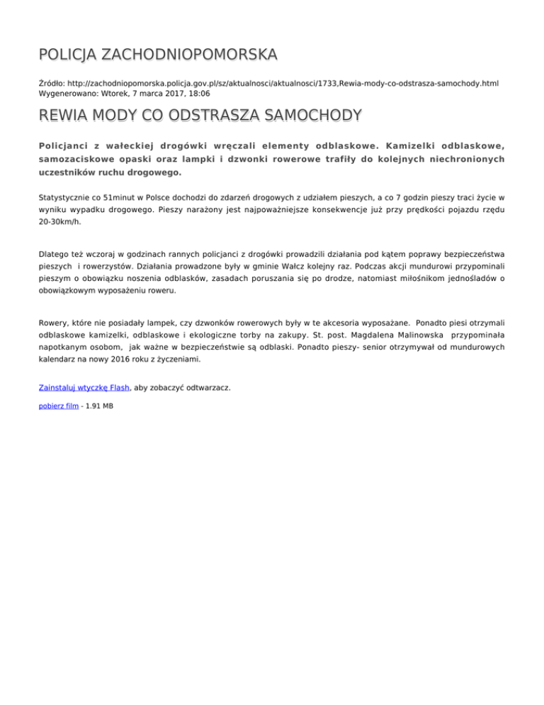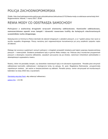 POLICJA ZACHODNIOPOMORSKA Źródło: http://zachodniopomorska.policja.gov.pl/sz/aktualnosci/aktualnosci/1733,Rewia-mody-co-odstrasza-samochody.html Wygenerowano: Wtorek, 7 marca 2017, 18:06 REWIA MODY CO ODSTRASZA SAMOCHODY Policjanci z wałeckiej drogówki wręczali elementy odblaskowe. Kamizelki odblaskowe, samozaciskowe opaski oraz lampki i dzwonki rowerowe trafiły do kolejnych niechronionych uczestników ruchu drogowego. Statystycznie co 51minut w Polsce dochodzi do zdarzeń drogowych z udziałem pieszych, a co 7 godzin pieszy traci życie w wyniku wypadku drogowego. Pieszy narażony jest najpoważniejsze konsekwencje już przy prędkości pojazdu rzędu 20-30km/h. Dlatego też wczoraj w godzinach rannych policjanci z drogówki prowadzili działania pod kątem poprawy bezpieczeństwa pieszych i rowerzystów. Działania prowadzone były w gminie Wałcz kolejny raz. Podczas akcji mundurowi przypominali pieszym o obowiązku noszenia odblasków, zasadach poruszania się po drodze, natomiast miłośnikom jednośladów o obowiązkowym wyposażeniu roweru. Rowery, które nie posiadały lampek, czy dzwonków rowerowych były w te akcesoria wyposażane. Ponadto piesi otrzymali odblaskowe kamizelki, odblaskowe i ekologiczne torby na zakupy. St. post. Magdalena Malinowska przypominała napotkanym osobom, jak ważne w bezpieczeństwie są odblaski. Ponadto pieszy- senior otrzymywał od mundurowych kalendarz na nowy 2016 roku z życzeniami. Zainstaluj wtyczkę Flash, aby zobaczyć odtwarzacz. pobierz film - 1.91 MB Zainstaluj wtyczkę Flash, aby zobaczyć odtwarzacz. pobierz film - 2.79 MB Ocena: 5/5 (1) Tweetnij