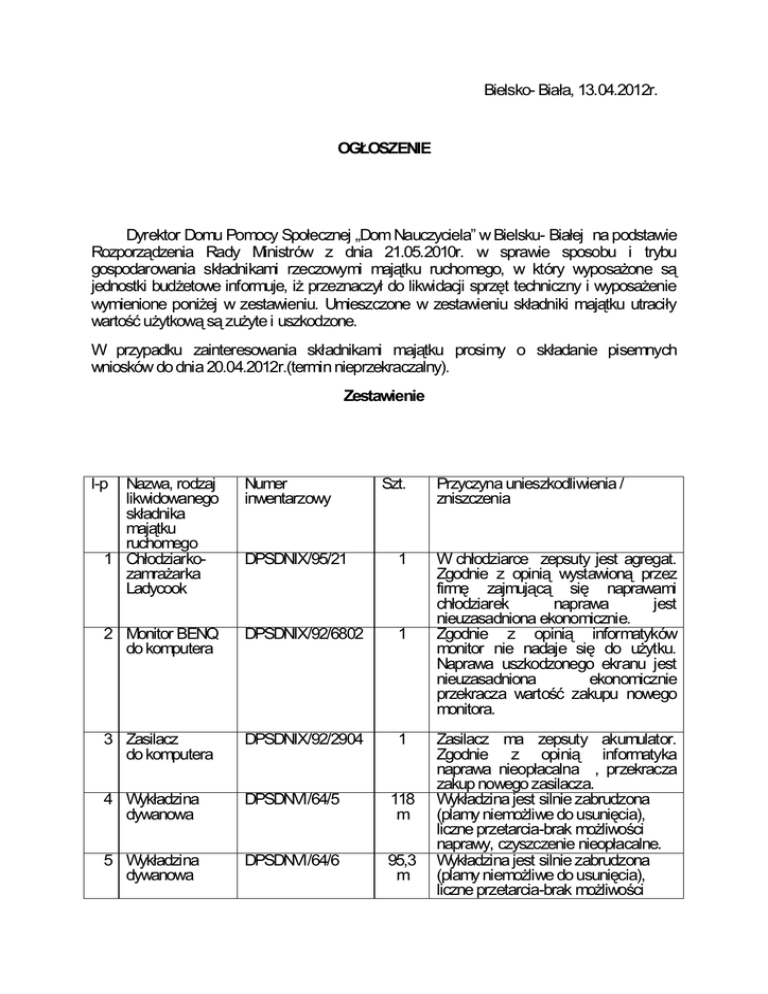 Bielsko- Biała, 13.04.2012r. OGŁOSZENIE Dyrektor Domu Pomocy Społecznej „Dom Nauczyciela” w Bielsku- Białej na podstawie Rozporządzenia Rady Ministrów z dnia 21.05.2010r. w sprawie sposobu i trybu gospodarowania składnikami rzeczowymi majątku ruchomego, w który wyposażone są jednostki budżetowe informuje, iż przeznaczył do likwidacji sprzęt techniczny i wyposażenie wymienione poniżej w zestawieniu. Umieszczone w zestawieniu składniki majątku utraciły wartość użytkową są zużyte i uszkodzone. W przypadku zainteresowania składnikami majątku prosimy o składanie pisemnych wniosków do dnia 20.04.2012r.(termin nieprzekraczalny). Zestawienie l-p Nazwa, rodzaj likwidowanego składnika majątku ruchomego 1 Chłodziarkozamrażarka Ladycook Numer inwentarzowy Szt. DPSDNIX/95/21 1 2 Monitor BENQ do komputera DPSDNIX/92/6802 1 3 Zasilacz do komputera DPSDNIX/92/2904 1 4 Wykładzina dywanowa DPSDNVI/64/5 118 m 5 Wykładzina dywanowa DPSDNVI/64/6 95,3 m Przyczyna unieszkodliwienia / zniszczenia W chłodziarce zepsuty jest agregat. Zgodnie z opinią wystawioną przez firmę zajmującą się naprawami chłodziarek naprawa jest nieuzasadniona ekonomicznie. Zgodnie z opinią informatyków monitor nie nadaje się do użytku. Naprawa uszkodzonego ekranu jest nieuzasadniona ekonomicznie przekracza wartość zakupu nowego monitora. Zasilacz ma zepsuty akumulator. Zgodnie z opinią informatyka naprawa nieopłacalna , przekracza zakup nowego zasilacza. Wykładzina jest silnie zabrudzona (plamy niemożliwe do usunięcia), liczne przetarcia-brak możliwości naprawy, czyszczenie nieopłacalne. Wykładzina jest silnie zabrudzona (plamy niemożliwe do usunięcia), liczne przetarcia-brak możliwości 6 Podnośnik rehabilitacyjny do wanny DPSDNIX/90/5 7 Talerze głębokie DPSDNIX/95 3 73 8 Talerze deserowe 10 Talerze płytkie DPSDNIX/95 15 DPSDNIX/95 13 11 Salaterki DPSDNIX/95 18 12 Półmiski DPSDNIX/95 4 13 Deski plastikowe 14 Garnki małe emaliowane DPSDNIX/95 4 DPSDNIX/95 3 15 Garnki duże aluminiowe DPSDNIX/95 3 16 Deski drewniane 17 Pokrywka do garnka 18 Miska plastikowa 19 Szklanki DPSDNIX/95 2 DPSDNIX/95 1 DPSDNIX/95 1 DPSDNIX/95 5 20 Literatki DPSDNIX/95 6 21 Szklanki deserowe 22 Waza DPSDNIX/95 2 DPSDNIX/95 1 23 Gęsiarka DPSDNIX/95 1 24 Miska szklana DPSDNIX/95 1 25 Termos DPSDNIX/95 metalowy 26 Dzbanki szklane DPSDNIX/95 3 27 Tłuczek do mięsa 28 Rózga DPSDNIX/95 2 DPSDNIX/95 1 28 Łopatka do mięsa 29 Szumówki DPSDNIX/95 1 DPSDNIX/95 2 4 naprawy, czyszczenie nieopłacalne. Podnośniki nie nadają się do użycia z powodu zniszczonych siedzisk, wystających drzazg, zardzewiałych rurek. Brak możliwości naprawy. Talerze rozbite, nie nadają się do użycia. Talerze rozbite, nie nadają się do użycia. Talerze rozbite, nie nadają się do użycia. Salaterki rozbite, nie nadają się do użycia. Półmiski rozbite, nie nadają się do użycia. Na skutek wieloletniego użytkowania deski plastikowe uległy zniszczeniu. Garnki emaliowane, z dużymi ubytkami emalii, nie nadają się do użycia. Garnki nie nadają się do użytku, w wyniku długoletniego użytkowania zniszczone uchwyty. Naprawa niemożliwa Na skutek wieloletniego użytkowania deski uległy zniszczeniu. Pokrywka zniszczona nie nadaje się do użycia. Miska plastikowa pęknięta, nie nadaje się do użycia. Szklanki rozbite, nie nadają się do użycia. Literatki rozbite, nie nadają się do użycia. Szklanki deserowe rozbite, nie nadają się do użycia. Waza pęknięta, nie nadaje się do użycia. Gęsiarka zniszczona nie nadaje się do użycia. Miska szklana pęknięta, nie nadaje się do użycia. Termos metalowy uszkodzony, brak możliwości naprawy. Dzbanki szklane rozbite, nie nadają się do użycia. Tłuczki do mięsa nie nadają się do użycia. Naprawa niemożliwa. Rózga nie nadają się do użycia. Naprawa niemożliwa. Łopatka do mięsa nie nadają się do użycia. Naprawa niemożliwa. Szumówka nie nadają się do użycia. Naprawa niemożliwa. 30 Wyciskarka do DPSDNIX/95 czosnku 31 Gałkownica DPSDNIX/95 2 32 Podstawki DPSDNIX/95 szklane 33 Robot kuchenny DPSDNIX/95 Simens 62 34 Robot kuchenny DPSDNIX/95/24 Simens 1 Sporządził: Anna Lichy Kontakt telefoniczny: 33 814 24 82 1 1 Wyciskarka do czosnku nie nadają się do użycia. Naprawa niemożliwa. Gałkownica nie nadają się do użycia. Naprawa niemożliwa. Szklanki rozbite, nie nadają się do użycia. Robot kuchenny, zepsuty, pęknięta obudowa, zepsuty silnik. Naprawa nieuzasadniona ekonomicznie, przekracza wartość nowego sprzętu. Robot kuchenny ,zepsuty, pęknięte części plastikowe zepsuty silnik. Naprawa nieuzasadniona ekonomicznie, przekracza wartość nowego sprzętu.