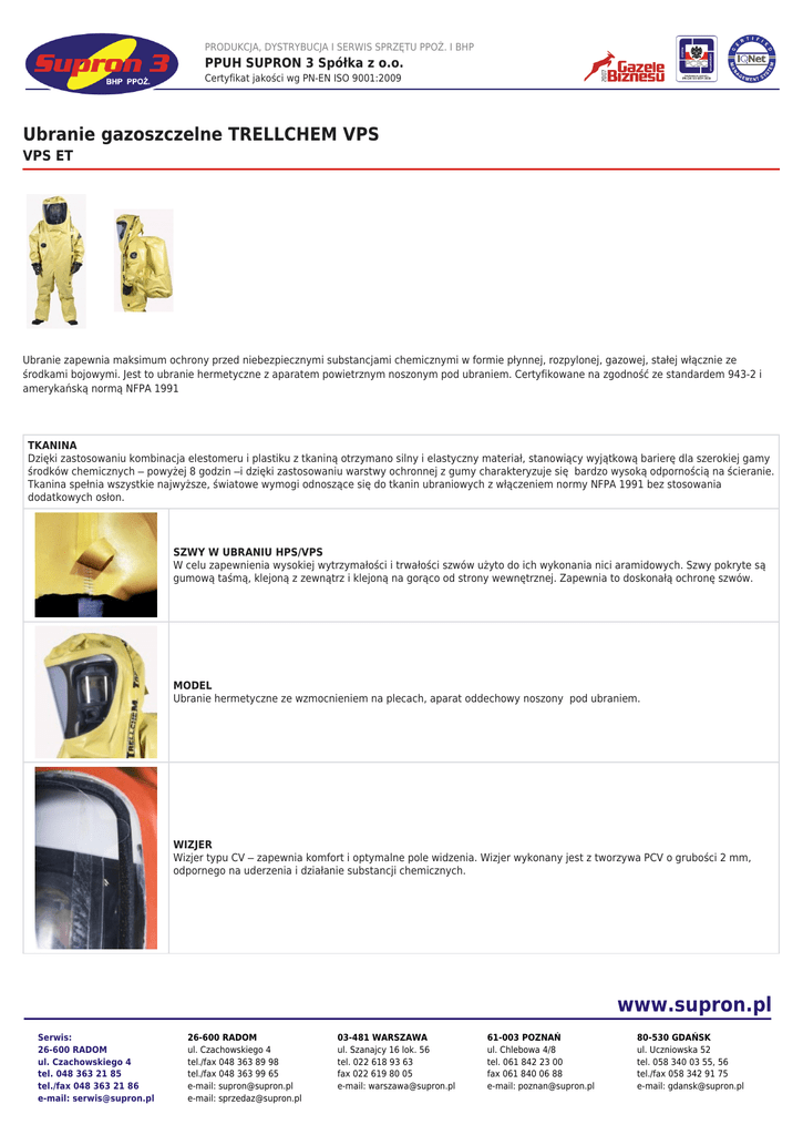 PRODUKCJA, DYSTRYBUCJA I SERWIS SPRZĘTU PPOŻ. I BHP PPUH SUPRON 3 Spółka z o.o. Certyfikat jakości wg PN-EN ISO 9001:2009 Ubranie gazoszczelne TRELLCHEM VPS VPS ET Ubranie zapewnia maksimum ochrony przed niebezpiecznymi substancjami chemicznymi w formie płynnej, rozpylonej, gazowej, stałej włącznie ze środkami bojowymi. Jest to ubranie hermetyczne z aparatem powietrznym noszonym pod ubraniem. Certyfikowane na zgodność ze standardem 943-2 i amerykańską normą NFPA 1991 TKANINA Dzięki zastosowaniu kombinacja elestomeru i plastiku z tkaniną otrzymano silny i elastyczny materiał, stanowiący wyjątkową barierę dla szerokiej gamy środków chemicznych – powyżej 8 godzin –i dzięki zastosowaniu warstwy ochronnej z gumy charakteryzuje się bardzo wysoką odpornością na ścieranie. Tkanina spełnia wszystkie najwyższe, światowe wymogi odnoszące się do tkanin ubraniowych z włączeniem normy NFPA 1991 bez stosowania dodatkowych osłon. SZWY W UBRANIU HPS/VPS W celu zapewnienia wysokiej wytrzymałości i trwałości szwów użyto do ich wykonania nici aramidowych. Szwy pokryte są gumową taśmą, klejoną z zewnątrz i klejoną na gorąco od strony wewnętrznej. Zapewnia to doskonałą ochronę szwów. MODEL Ubranie hermetyczne ze wzmocnieniem na plecach, aparat oddechowy noszony pod ubraniem. WIZJER Wizjer typu CV – zapewnia komfort i optymalne pole widzenia. Wizjer wykonany jest z tworzywa PCV o grubości 2 mm, odpornego na uderzenia i działanie substancji chemicznych. www.supron.pl Serwis: 26-600 RADOM ul. Czachowskiego 4 tel. 048 363 21 85 tel./fax 048 363 21 86 e-mail: [email protected] 26-600 RADOM ul. Czachowskiego 4 tel./fax 048 363 89 98 tel./fax 048 363 99 65 e-mail: [email protected] e-mail: [email protected] 03-481 WARSZAWA ul. Szanajcy 16 lok. 56 tel. 022 618 93 63 fax 022 619 80 05 e-mail: [email protected] 61-003 POZNAŃ ul. Chlebowa 4/8 tel. 061 842 23 00 fax 061 840 06 88 e-mail: [email protected] 80-530 GDAŃSK ul. Uczniowska 52 tel. 058 340 03 55, 56 tel./fax 058 342 91 75 e-mail: [email protected] PRODUKCJA, DYSTRYBUCJA I SERWIS SPRZĘTU PPOŻ. I BHP PPUH SUPRON 3 Spółka z o.o. Certyfikat jakości wg PN-EN ISO 9001:2009 WENTYLACJA Ubranie gazoszczelne Trellchem standardowo wyposażone jest w system wentylacyjny, który zapewnia stałe nadciśnienie wewnątrz ubrania, dzięki czemu ubranie jest bezpieczne dla użytkownika. Zawór regulujący wykonany jest z tworzywa odpornego na działanie substancji chemicznych. Trzy zakresy wentylacji: 2, 30 i 100l/min., oraz pozycje: zero/off. Duże pokrętło ułatwia manipulację. Zawór jest również dostępny w wersji przepływowej, do stosowania z zewnętrznym źródłem zasilania w powietrze. RĘKAWICE I ICH MOCOWANIE Standardowy zestaw rękawic składa się z dwóch warstw: wewnętrzne rękawice ochronne 4H SilverShield i zewnętrzne rękawice wykonane z odpornej na działanie płomieni gumy chloroprenowej. Zamiennie ubranie może być dostarczone z gumowymi rękawicami TrellchemViton/butyl wyposażonymi w mankiety, które stanowią dodatkowe zabezpieczenie. Rękawice są mocowane przy pomocy pierścieni Trellchem Bayonet, które zapewniają ich łatwą i szybką wymianę BUTY I ICH MOCOWANIE Buty wykonane są z czarnej, nitrylowej gumy. Spełniają standardy europejskie w odniesieniu do butów strażackich. Buty mocowane są przy pomocy ergonomicznych pierścieni, które zapewniają łatwą wymianę butów i dobre ułożenie nogawki ubrania do nogawki buta. Zamiennie ubranie może być wyposażone w doszywane skarpety. SUWAK Gazoszczelny, silny i wytrzymały. Dla zwiększenia bezpieczeństwa zamyka się od góry do dołu. Suwak chroniony jest specjalną taśmą ochronną. www.supron.pl Serwis: 26-600 RADOM ul. Czachowskiego 4 tel. 048 363 21 85 tel./fax 048 363 21 86 e-mail: [email protected] 26-600 RADOM ul. Czachowskiego 4 tel./fax 048 363 89 98 tel./fax 048 363 99 65 e-mail: [email protected] e-mail: [email protected] 03-481 WARSZAWA ul. Szanajcy 16 lok. 56 tel. 022 618 93 63 fax 022 619 80 05 e-mail: [email protected] 61-003 POZNAŃ ul. Chlebowa 4/8 tel. 061 842 23 00 fax 061 840 06 88 e-mail: [email protected] 80-530 GDAŃSK ul. Uczniowska 52 tel. 058 340 03 55, 56 tel./fax 058 342 91 75 e-mail: [email protected]
