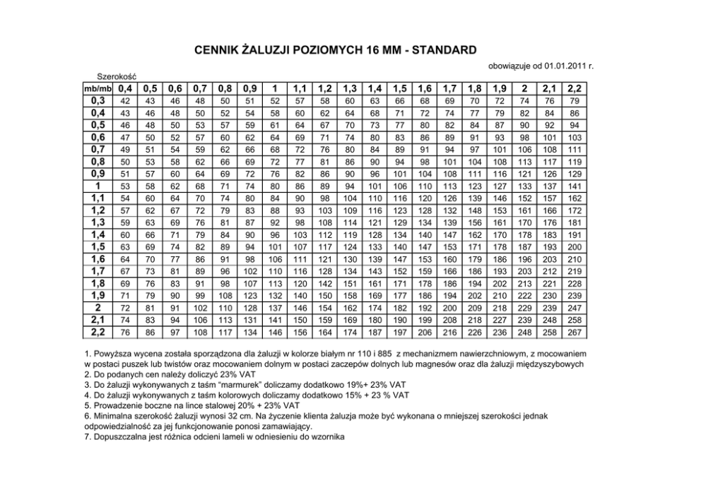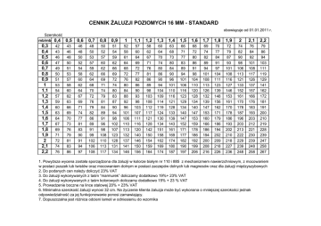 CENNIK ŻALUZJI POZIOMYCH 16 MM - STANDARD obowiązuje od 01.01.2011 r. Szerokość mb/mb 0,4 0,5 0,3 42 43 0,4 43 46 0,5 46 48 0,6 47 50 0,7 49 51 0,8 50 53 0,9 51 57 1 53 58 1,1 54 60 1,2 57 62 1,3 59 63 1,4 60 66 1,5 63 69 1,6 64 70 1,7 67 73 1,8 69 76 1,9 71 79 2 72 81 2,1 74 83 2,2 76 86 0,6 0,7 0,8 0,9 1 1,1 1,2 1,3 1,4 1,5 1,6 1,7 1,8 1,9 2 2,1 2,2 46 48 50 52 54 58 60 62 64 67 69 71 74 77 81 83 90 91 94 97 48 50 53 57 59 62 64 68 70 72 76 79 82 86 89 91 99 102 106 108 50 52 57 60 62 66 69 71 74 79 81 84 89 91 96 98 108 110 113 117 51 54 59 62 66 69 72 74 80 83 87 90 94 98 102 107 123 128 131 134 52 58 61 64 68 72 76 80 84 88 92 96 101 106 110 113 132 137 141 146 57 60 64 69 72 77 82 86 90 93 98 103 107 111 116 120 140 146 150 156 58 62 67 71 76 81 86 89 98 103 108 112 117 121 128 142 150 154 159 164 60 64 70 74 80 86 90 94 104 109 114 119 124 130 134 151 158 162 169 174 63 68 73 80 84 90 96 101 110 116 121 128 133 139 143 161 169 174 180 187 66 71 77 83 89 94 101 106 116 123 129 134 140 147 152 171 177 182 190 197 68 72 80 86 91 98 104 110 120 128 134 140 147 153 159 178 186 192 199 206 69 74 82 89 94 101 108 113 126 132 139 147 153 160 166 186 194 200 208 216 70 77 84 91 97 104 111 123 139 148 156 162 171 179 186 194 202 209 218 226 72 79 87 93 101 108 116 127 146 153 161 170 178 186 193 202 210 218 227 236 74 82 90 98 106 113 121 133 152 161 170 178 187 196 203 213 222 229 239 248 76 84 92 101 108 117 126 137 157 166 176 183 193 203 212 221 230 239 248 258 79 86 94 103 111 119 129 141 162 172 181 191 200 210 219 228 239 247 258 267 1. Powyższa wycena została sporządzona dla żaluzji w kolorze białym nr 110 i 885 z mechanizmem nawierzchniowym, z mocowaniem w postaci puszek lub twistów oraz mocowaniem dolnym w postaci zaczepów dolnych lub magnesów oraz dla żaluzji międzyszybowych 2. Do podanych cen należy doliczyć 23% VAT 3. Do żaluzji wykonywanych z taśm “marmurek” doliczamy dodatkowo 19%+ 23% VAT 4. Do żaluzji wykonywanych z taśm kolorowych doliczamy dodatkowo 15% + 23 % VAT 5. Prowadzenie boczne na lince stalowej 20% + 23% VAT 6. Minimalna szerokość żaluzji wynosi 32 cm. Na życzenie klienta żaluzja może być wykonana o mniejszej szerokości jednak odpowiedzialność za jej funkcjonowanie ponosi zamawiający. 7. Dopuszczalna jest różnica odcieni lameli w odniesieniu do wzornika