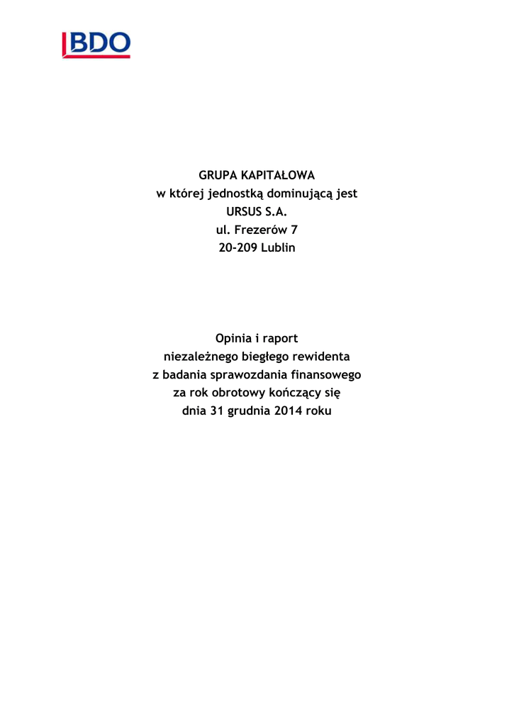 GRUPA KAPITAŁOWA w której jednostką dominującą jest URSUS S.A. ul. Frezerów 7 20-209 Lublin Opinia i raport niezależnego biegłego rewidenta z badania sprawozdania finansowego za rok obrotowy kończący się dnia 31 grudnia 2014 roku OPINIA NIEZALEŻNEGO BIEGŁEGO REWIDENTA dla Walnego Zgromadzenia i Rady Nadzorczej URSUS S.A. Przeprowadziliśmy badanie załączonego skonsolidowanego sprawozdania finansowego Grupy Kapitałowej, w której jednostką dominującą jest URSUS S.A. z siedzibą w Lublinie ul. Frezerów 7, na które składa się: informacja dodatkowa o przyjętych zasadach rachunkowości, skonsolidowane sprawozdanie z sytuacji finansowej sporządzone na dzień 31 grudnia 2014 roku, skonsolidowane sprawozdanie z całkowitych dochodów za rok obrotowy od 1 stycznia do 31 grudnia 2014 roku, skonsolidowane sprawozdanie ze zmian w kapitale własnym za rok obrotowy od 1 stycznia do 31 grudnia 2014 roku, skonsolidowane sprawozdanie z przepływów pieniężnych 31 grudnia 2014 roku, oraz dodatkowe informacje i objaśnienia. za rok obrotowy od 1 stycznia do Za sporządzenie zgodnego z obowiązującymi przepisami skonsolidowanego sprawozdania finansowego oraz sprawozdania z działalności Grupy Kapitałowej odpowiedzialny jest Zarząd Jednostki Dominującej. Zarząd Spółki oraz członkowie Rady Nadzorczej Jednostki Dominującej są zobowiązani do zapewnienia, aby sprawozdanie finansowe oraz sprawozdanie z działalności spełniały wymagania przewidziane w ustawie z dnia 29 września 1994 r. o rachunkowości (Dz. U. z 2013 r. poz. 330, z późn. zm.), zwanej dalej „ustawą o rachunkowości”. Naszym zadaniem było zbadanie i wyrażenie opinii o zgodności z wymagającymi zastosowania zasadami (polityką) rachunkowości Grupy Kapitałowej tego skonsolidowanego sprawozdania finansowego oraz czy rzetelnie i jasno przedstawia ono, we wszystkich istotnych aspektach, sytuację majątkową i finansową, jak też wynik finansowy Grupy Kapitałowej oraz o prawidłowości ksiąg rachunkowych stanowiących podstawę jego sporządzenia. Badanie skonsolidowanego sprawozdania finansowego przeprowadziliśmy stosownie do postanowień: 1/ rozdziału 7 ustawy o rachunkowości, 2/ krajowych standardów rewizji finansowej, wydanych przez Krajową Radę Biegłych Rewidentów w Polsce. Badanie skonsolidowanego sprawozdania finansowego zaplanowaliśmy i przeprowadziliśmy w taki sposób, aby uzyskać racjonalną pewność, pozwalającą na wyrażenie opinii o sprawozdaniu. W szczególności badanie obejmowało sprawdzenie poprawności zastosowanych przez Jednostkę Dominującą zasad (polityki) rachunkowości i znaczących szacunków, sprawdzenie – w przeważającej mierze w sposób wyrywkowy – dowodów i zapisów księgowych, z których wynikają liczby i informacje zawarte w skonsolidowanym sprawozdaniu finansowym, jak i całościową ocenę skonsolidowanego sprawozdania finansowego. Uważamy, że badanie dostarczyło wystarczającej podstawy do wyrażenia opinii. Naszym zdaniem zbadane sprawozdanie finansowe, we wszystkich istotnych aspektach: a) przedstawia rzetelnie i jasno informacje istotne dla oceny sytuacji majątkowej i finansowej Grup Kapitałowej na dzień 31 grudnia 2014 roku, jak też jej wyniku finansowego za rok obrotowy kończący się dnia 31 grudnia 2014 roku, b) zostało sporządzone zgodnie z Międzynarodowymi Standardami Rachunkowości, Międzynarodowymi Standardami Sprawozdawczości Finansowej oraz związanymi z nimi interpretacjami ogłoszonymi w formie rozporządzeń Komisji Europejskiej, a w zakresie nieuregulowanym w tych standardach – stosownie do wymogów ustawy o rachunkowości i wydanych na jej podstawie przepisów wykonawczych, c) jest zgodne z wpływającymi na obowiązującymi Grupę Kapitałową. treść sprawozdania finansowego przepisami prawa Nie zgłaszając zastrzeżeń do prawidłowości i rzetelności zbadanego skonsolidowanego sprawozdania finansowego zwracamy uwagę na istotne transakcje opisane w nocie 24. Sprawozdanie z działalności Grupy jest kompletne w rozumieniu art. 49 ust. 2 ustawy o rachunkowości oraz uwzględnia przepisy rozporządzenia Ministra Finansów z 19 lutego 2009 roku w sprawie informacji bieżących i okresowych przekazywanych przez emitentów papierów wartościowych oraz warunków uznawania za równoważne informacji wymaganych przepisami prawa państwa niebędącego państwem członkowskim (Dz.U.z dnia 28 stycznia 2014 poz 133), a zawarte w nim informacje, pochodzące ze zbadanego sprawozdania finansowego, są z nim zgodne. Poznań, 9 marca 2015 roku BDO Sp. z o.o. ul. Postępu 12 02-676 Warszawa Podmiot uprawniony do badania sprawozdań finansowych nr 3355 Kluczowy biegły rewident przeprowadzający badanie: Działający w imieniu BDO Sp. z o.o.: Michał Włodarczyk Biegły Rewident nr ewid. 12436 dr André Helin Prezes Zarządu Biegły Rewident nr ewid. 90004 2 Raport z badania skonsolidowanego sprawozdania finansowego GRUPY KAPITAŁOWEJ w której jednostką dominującą jest URSUS S.A. za rok obrotowy kończący się dnia 31 grudnia 2014 roku Raport z badania skonsolidowanego sprawozdania finansowego Grupy Kapitałowej, w której jednostką dominującą jest URSUS S.A. za rok obrotowy kończący się dnia 31 grudnia 2014 roku I. CZĘŚĆ OGÓLNA RAPORTU 1. Dane identyfikujące Jednostkę Dominującą Spółka działa pod firmą URSUS Spółka Akcyjna. Siedzibą Spółki jest 20 -209 Lublin, ul Frezerów 7 Zgodnie z wpisem do rejestru i statutem Spółki przeważająca działalność Spółki to: - produkcja maszyn dla rolnictwa i leśnictwa, - produkcja obrabiarek i narzędzi mechanicznych, - produkcja pojazdów samochodowych, przyczep i naczep, - prace badawczo-rozwojowe w dziedzinie nauk technicznych. Spółka działa na podstawie: statutu Spółki sporządzonego w formie aktu notarialnego w dniu 24 czerwca 1997 roku (Rep. A nr 1796/1997) wraz z późniejszymi zmianami, Kodeksu spółek handlowych, W dniu 23 maja 2001