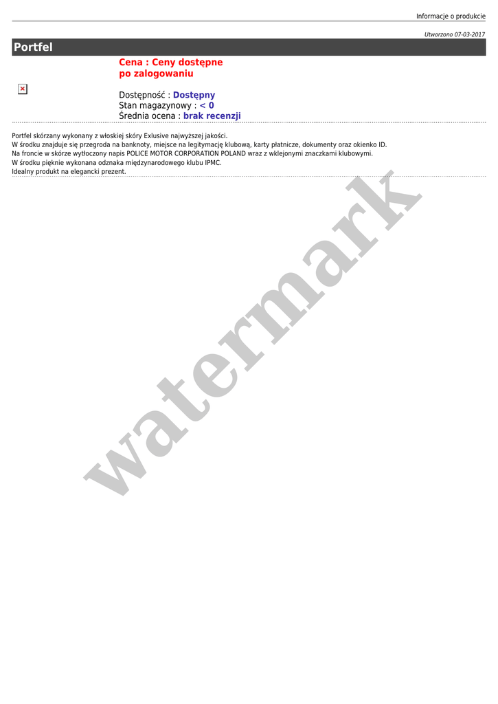 Informacje o produkcie Utworzono 07-03-2017 Portfel Cena : Ceny dostępne po zalogowaniu Dostępność : Dostępny Stan magazynowy : < 0 Średnia ocena : brak recenzji w at er m ar k Portfel skórzany wykonany z włoskiej skóry Exlusive najwyższej jakości. W środku znajduje się przegroda na banknoty, miejsce na legitymację klubową, karty płatnicze, dokumenty oraz okienko ID. Na froncie w skórze wytłoczony napis POLICE MOTOR CORPORATION POLAND wraz z wklejonymi znaczkami klubowymi. W środku pięknie wykonana odznaka międzynarodowego klubu IPMC. Idealny produkt na elegancki prezent.