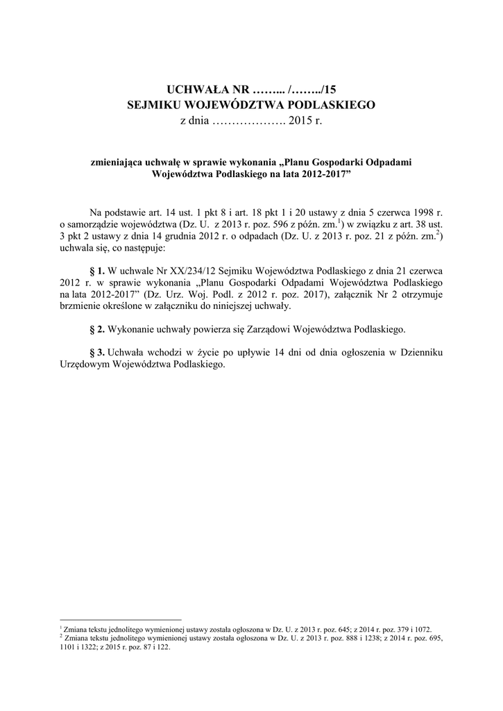 UCHWAŁA NR ……... /……../15 SEJMIKU WOJEWÓDZTWA PODLASKIEGO z dnia ………………. 2015 r. zmieniająca uchwałę w sprawie wykonania „Planu Gospodarki Odpadami Województwa Podlaskiego na lata 2012-2017” Na podstawie art. 14 ust. 1 pkt 8 i art. 18 pkt 1 i 20 ustawy z dnia 5 czerwca 1998 r. o samorządzie województwa (Dz. U. z 2013 r. poz. 596 z późn. zm.1) w związku z art. 38 ust. 3 pkt 2 ustawy z dnia 14 grudnia 2012 r. o odpadach (Dz. U. z 2013 r. poz. 21 z późn. zm.2) uchwala się, co następuje: § 1. W uchwale Nr XX/234/12 Sejmiku Województwa Podlaskiego z dnia 21 czerwca 2012 r. w sprawie wykonania „Planu Gospodarki Odpadami Województwa Podlaskiego na lata 2012-2017” (Dz. Urz. Woj. Podl. z 2012 r. poz. 2017), załącznik Nr 2 otrzymuje brzmienie określone w załączniku do niniejszej uchwały. § 2. Wykonanie uchwały powierza się Zarządowi Województwa Podlaskiego. § 3. Uchwała wchodzi w życie po upływie 14 dni od dnia ogłoszenia w Dzienniku Urzędowym Województwa Podlaskiego. Zmiana tekstu jednolitego wymienionej ustawy została ogłoszona w Dz. U. z 2013 r. poz. 645; z 2014 r. poz. 379 i 1072. Zmiana tekstu jednolitego wymienionej ustawy została ogłoszona w Dz. U. z 2013 r. poz. 888 i 1238; z 2014 r. poz. 695, 1101 i 1322; z 2015 r. poz. 87 i 122. 1 2 Załącznik do Uchwały Nr ………/………/15 Sejmiku Województwa Podlaskiego z dnia …… maja 2015 r. Regionalne instalacje do przetwarzania odpadów komunalnych w województwie podlaskim i instalacje do zastępczej obsługi regionów Do obsługi czterech wytyczonych regionów gospodarki odpadami komunalnymi wyznacza się w województwie podlaskim regionalne instalacje do przetwarzania odpadów komunalnych (RIPOK) oraz instalacje do zastępczej obsługi: Nazwa regionu gospodarki Rodzaj regionalnej odpadami instalacji* komunalny mi Funkcjonujące regionalne instalacje do przetwarzania odpadów komunalnych nazwa instalacji A Region Centralny B - ZUOK w Hryniewiczach instalacja MBP - CIGO w Studziankach kompostownia na odpady brak zielone - ZUOK w Hryniewiczach Instalacje przewidziane do zastępczej obsługi regionów do czasu uruchomienia lub uzyskania przez w przypadku gdy regionalne regionalna instalacja instalacje uległa awarii lub nie wystarczającej może przyjmować mocy przerobowej odpadów z innych do przetwarzania przyczyn odpadów komunalnych z regionu nazwa instalacji nazwa instalacji - ZUOK w Hryniewiczach - ZZO w Hajnówce -SOK w Studziankach -SOK w Odnodze -SOK w Sidrze -SOK w Knyszynie - CIGO w Studziankach - ZZO w Hajnówce - ZUOK w Hryniewiczach nie wyznacza się, gdyż nie istnieje regionalna instalacja -SOK w Studziankach -SOK w Odnodze -SOK w Sidrze -SOK w Knyszynie C składowisko A instalacja MBP brak - ZZO w Hajnówce - ZUOK w Hryniewiczach nie wyznacza się, gdyż nie istnieje regionalna instalacja B kompostownia na odpady zielone - ZZO w Hajnówce - ZUOK w Hryniewiczach nie wyznacza się, gdyż nie istnieje regionalna instalacja Region Południowy brak Region Północny - ZZO w Hajnówce -SOK w m. Augustowo -SOK w Narwi -SOK w Olchówce -SOK w Siemiatyczach -SOK w Brańsku -SOK w Drohiczynie nie wyznacza się, gdyż nie istnieje regionalna instalacja C składowisko A - ZUOK instalacja MBP w Suwałkach - ZZO Koszarówka - - ZUOK w Suwałkach - ZZO Koszarówka - CIGO w Studziankach B kompostownia na odpady zielone - - ZUOK w Suwałkach - ZZO Koszarówka C składowisko - - ZUOK w Suwałkach - ZZO Koszarówka A - ZPiUO w Czartorii instalacja MBP - ZPiUO w Czerwonym Borze B kompostownia na odpady zielone C składowisko Region Zachodni brak - ZUOK w Suwałkach - ZZO Koszarówka - ZUOK w Suwałkach - ZZO Koszarówka - ZPiUO w Czerwonym Borze - ZPiUO w Czartorii - ZZO Koszarówka - ZPiUO w Czartorii nie wyznacza się, gdyż brak - ZPiUO w nie istnieje regionalna Czerwonym Borze instalacja -ZPiUO w Czerwonym Borze -SOK w Ratowie -ZPiUO w Czartorii Piotrowie -SOK w Ratowie - ZPiUO w Czartorii -SOK w Korytkach Piotrowie - ZPiUO w Borowych -SOK w Korytkach Czerwonym Borze -SOK w m. Osipy Borowych Lepertowizna -SOK w m. Osipy -SOK w Uhowie Lepertowizna -SOK w Uhowie * Używane skróty oznaczają: A – instalacja MBP: instalacja do mechaniczno-biologicznego przetwarzania zmieszanych odpadów komunalnych i wydzielania ze zmieszanych odpadów komunalnych frakcji nadających się w całości lub w części do odzysku. B – kompostownia na odpady zielone: instalacja do przetwarzania selektywnie zebranych odpadów zielonych i innych bioodpadów oraz wytwarzania z nich produktu o właściwościach nawozowych lub środków wspomagających uprawę roślin, spełniających wymagania określone w przepisach odrębnych, lub materiału po procesie kompostowania lub fermentacji dopuszczonego do odzysku w procesie odzysku R10, spełniającego wymagania określone w przepisach wydanych na podstawie art. 30 ust. 4 ustawy z dnia 14 grudnia 2012 r. o odpadach. C – składowisko: instalacja do składowania odpadów powstających w procesie mechanicznobiologicznego przetwarzania zmieszanych odpadów komunalnych oraz pozostałości z sortowania odpadów komunalnych o pojemności pozwalającej na przyjmowanie przez okres nie krótszy niż 15 lat odpadów w ilości nie mniejszej niż powstająca w instalacji do mechaniczno-biologicznego przetwarzania zmieszanych odpadów komunalnych. UZASADNIENIE do uchwały w sprawie zmiany uchwały w sprawie wykonania „Planu Gospodarki Odpadami Województwa Podlaskiego na lata 2012-2017” Wypełniając obowiązek wynikający z art. 15 ust. 1 ustawy z dnia 27 kwietnia 2001 r. o odpadach (Dz. U. z 2010 r. Nr 185, poz. 1243 ze zm.) Sejmik Województwa Podlaskiego wraz z przyjęciem „Planu Gospodarki Odpadami Województwa Podlaskiego na lata 20122017” podjął w dniu 21 czerwca 2012 r. uchwałę Nr XX/234/12 w sprawie jego wykonania, która jest aktem prawa miejscowego, opublikowanym w Dzienniku Urzędowym Województwa Podlaskiego z dnia 9 lipca 2012 r. pod