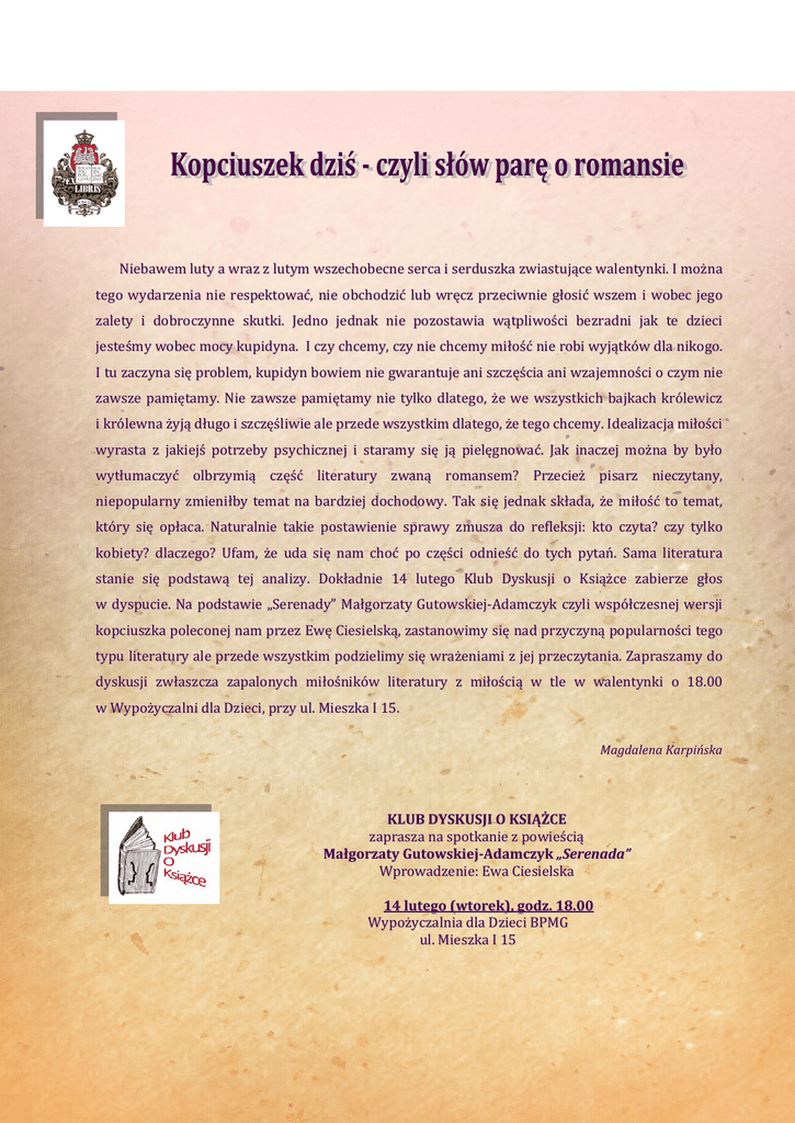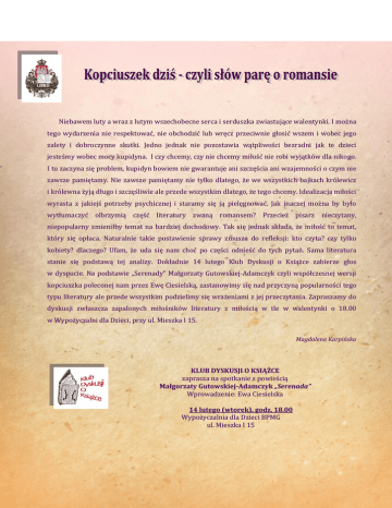 Niebawem luty a wraz z lutym wszechobecne serca i serduszka zwiastujące walentynki. I można tego wydarzenia nie respektować, nie obchodzić lub wręcz przeciwnie głosić wszem i wobec jego zalety i dobroczynne skutki. Jedno jednak nie pozostawia wątpliwości bezradni jak te dzieci jesteśmy wobec mocy kupidyna. I czy chcemy, czy nie chcemy miłość nie robi wyjątków dla nikogo. I tu zaczyna się problem, kupidyn bowiem nie gwarantuje ani szczęścia ani wzajemności o czym nie zawsze pamiętamy. Nie zawsze pamiętamy nie tylko dlatego, że we wszystkich bajkach królewicz i królewna żyją długo i szczęśliwie ale przede wszystkim dlatego, że tego chcemy. Idealizacja miłości wyrasta z jakiejś potrzeby psychicznej i staramy się ją pielęgnować. Jak inaczej można by było wytłumaczyć olbrzymią część literatury zwaną romansem? Przecież pisarz nieczytany, niepopularny zmieniłby temat na bardziej dochodowy. Tak się jednak składa, że miłość to temat, który się opłaca. Naturalnie takie postawienie sprawy zmusza do refleksji: kto czyta? czy tylko kobiety? dlaczego? Ufam, że uda się nam choć po części odnieść do tych pytań. Sama literatura stanie się podstawą tej analizy. Dokładnie 14 lutego Klub Dyskusji o Książce zabierze głos w dyspucie. Na podstawie „Serenady” Małgorzaty Gutowskiej-Adamczyk czyli współczesnej wersji kopciuszka poleconej nam przez Ewę Ciesielską, zastanowimy się nad przyczyną popularności tego typu literatury ale przede wszystkim podzielimy się wrażeniami z jej przeczytania. Zapraszamy do dyskusji zwłaszcza zapalonych miłośników literatury z miłością w tle w walentynki o 18.00 w Wypożyczalni dla Dzieci, przy ul. Mieszka I 15. Magdalena Karpińska KLUB DYSKUSJI O KSIĄŻCE zaprasza na spotkanie z powieścią Małgorzaty Gutowskiej-Adamczyk „Serenada” Wprowadzenie: Ewa Ciesielska 14 lutego (wtorek), godz. 18.00 Wypożyczalnia dla Dzieci BPMG ul. Mieszka I 15