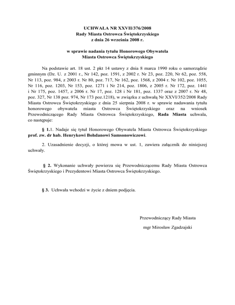 UCHWAŁA NR XXVII/376/2008 Rady Miasta Ostrowca Świętokrzyskiego z dnia 26 września 2008 r. w sprawie nadania tytułu Honorowego Obywatela Miasta Ostrowca Świętokrzyskiego Na podstawie art. 18 ust. 2 pkt 14 ustawy z dnia 8 marca 1990 roku o samorządzie gminnym (Dz. U. z 2001 r., Nr 142, poz. 1591, z 2002 r. Nr 23, poz. 220, Nr 62, poz. 558, Nr 113, poz. 984, z 2003 r. Nr 80, poz. 717, Nr 162, poz. 1568, z 2004 r. Nr 102, poz. 1055, Nr 116, poz. 1203, Nr 153, poz. 1271 i Nr 214, poz. 1806, z 2005 r. Nr 172, poz. 1441 i Nr 175, poz. 1457, z 2006 r. Nr 17, poz. 128 i Nr 181, poz. 1337 oraz z 2007 r. Nr 48, poz. 327, Nr 138 poz. 974, Nr 173 poz.1218), w związku z uchwałą Nr XXVI/352/2008 Rady Miasta Ostrowca Świętokrzyskiego z dnia 25 sierpnia 2008 r. w sprawie nadawania tytułu honorowego obywatela miasta Ostrowca Świętokrzyskiego oraz na wniosek Przewodniczącego Rady Miasta Ostrowca Świętokrzyskiego, Rada Miasta uchwala, co następuje: § 1.1. Nadaje się tytuł Honorowego Obywatela Miasta Ostrowca Świętokrzyskiego prof. zw. dr hab. Henrykowi Bohdanowi Samsonowiczowi. 2. Uzasadnienie decyzji, o której mowa w ust. 1, zawiera załącznik do niniejszej uchwały. § 2. Wykonanie uchwały powierza się Przewodniczącemu Rady Miasta Ostrowca Świętokrzyskiego i Prezydentowi Miasta Ostrowca Świętokrzyskiego. § 3. Uchwała wchodzi w Ŝycie z dniem podjęcia. Przewodniczący Rady Miasta mgr Mirosław Zgadzajski Załącznik do uchwały Nr XXVII/376/2008 Rady Miasta Ostrowca Świętokrzyskiego z dnia 26 września 2008 r. UZASADNIENIE Henryk Bohdan Samsonowicz, urodzony 23 stycznia 1930 r. w Warszawie, wybitny historyk mediewista, profesor Uniwersytetu Warszawskiego, syn Jana Samsonowicza, uczonego geologa, odkrywcy Krzemionek. W 1950 r. ukończył studia na Wydziale Humanistycznym Uniwersytetu Warszawskiego, po których podjął pracę na stanowisku asystenta tej uczelni. W 1954 r. otrzymał stopień doktora nauk historycznych, w 1960 obronił habilitację. Profesorem nadzwyczajnym został w 1971 r., a dziewięć lat później profesorem zwyczajnym nauk humanistycznych. Od 1967 r. był prodziekanem Wydziału Historycznego, w okresie 1970-1973 pełnił funkcję dziekana tej jednostki. W latach 1975-1980 był dyrektorem Instytutu Historycznego. W latach 70-tych często bywał ekspertem Wielkiej Gry. W 1975 r. organizował i tworzył I olimpiadę historyczną. NaleŜał do opozycji demokratycznej u schyłku PRL. Działał w „Solidarności”. Od 1 października 1980 r. do 8 kwietnia 1982 r. był rektorem Uniwersytetu Warszawskiego. Po wyborach do Sejmu kontraktowego w 1989 r. został ministrem edukacji narodowej w rządzie Tadeusza Mazowieckiego. W 1990 r. zdecydował o wprowadzeniu do szkół lekcji religii. Urząd ministra sprawował do stycznia 1991 r. Członek Towarzystwa Historycznego oraz wielu towarzystw regionalnych. Pan Profesor od lat pięćdziesiątych regularnie przebywał w Ostrowcu Świętokrzyskim, biorąc udział w organizowanych spotkaniach dyskusyjnych na temat Ziemi Świętokrzyskiej i Zagłębia Staropolskiego, głównie w ramach Polskiego Towarzystwa Historycznego. Obecnie wykłada w Akademii Humanistycznej w Pułtusku. Jest członkiem Polskiej Akademii Umiejętności, zasiada w prezydium Polskiej Akademii Nauk. Opublikował ponad 800 prac naukowych, głównie z zakresu historii Polski okresu Średniowiecza, w tym 16 ksiąŜek i podręczników uniwersyteckich. Za swoje dokonania otrzymał tytuły doktora honoris causa Uniwersytetu Mikołaja Kopernika (19 lutego 1998 r.), Uniwersytetu Marii Curie-Skłodowskiej w Lublinie (2002 r.) oraz Uniwersytetu Wrocławskiego (1 października 2007 r.). Odznaczony Orderem Legii Honorowej (1982 r.). Przewodniczący Rady Miasta mgr Mirosław Zgadzajski