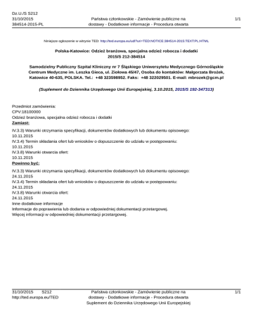 Dz.U./S S212 31/10/2015 384514-2015-PL Państwa członkowskie - Zamówienie publiczne na dostawy - Dodatkowe informacje - Procedura otwarta 1/1 Niniejsze ogłoszenie w witrynie TED: http://ted.europa.eu/udl?uri=TED:NOTICE:384514-2015:TEXT:PL:HTML Polska-Katowice: Odzież branżowa, specjalna odzież robocza i dodatki 2015/S 212-384514 Samodzielny Publiczny Szpital Kliniczny nr 7 Śląskiego Uniwersytetu Medycznego Górnośląskie Centrum Medyczne im. Leszka Gieca, ul. Ziołowa 45/47, Osoba do kontaktów: Małgorzata Brożek, Katowice 40-635, POLSKA. Tel.: +48 323598952. Faks: +48 322029501. E-mail: [email protected] (Suplement do Dziennika Urzędowego Unii Europejskiej, 3.10.2015, 2015/S 192-347313) Przedmiot zamówienia: CPV:18100000 Odzież branżowa, specjalna odzież robocza i dodatki Zamiast: IV.3.3) Warunki otrzymania specyfikacji, dokumentów dodatkowych lub dokumentu opisowego: 10.11.2015 IV.3.4) Termin składania ofert lub wniosków o dopuszczenie do udziału w postępowaniu: 10.11.2015 IV.3.8) Warunki otwarcia ofert: 10.11.2015 Powinno być: IV.3.3) Warunki otrzymania specyfikacji, dokumentów dodatkowych lub dokumentu opisowego: 24.11.2015 IV.3.4) Termin składania ofert lub wniosków o dopuszczenie do udziału w postępowaniu: 24.11.2015 IV.3.8) Warunki otwarcia ofert: 24.11.2015 Inne dodatkowe informacje Informacje do poprawienia lub dodania w odpowiedniej dokumentacji przetargowej. Więcej informacji w odpowiedniej dokumentacji przetargowej. 31/10/2015 S212 http://ted.europa.eu/TED Państwa członkowskie - Zamówienie publiczne na dostawy - Dodatkowe informacje - Procedura otwarta Suplement do Dziennika Urzędowego Unii Europejskiej 1/1