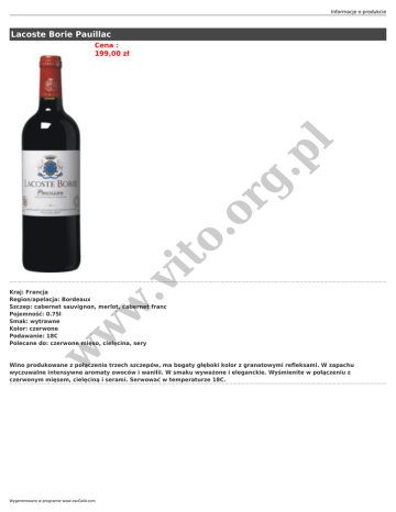 Informacje o produkcie Lacoste Borie Pauillac w .v it o. or g. pl Cena : 199,00 zł w w Kraj: Francja Region/apelacja: Bordeaux Szczep: cabernet sauvignon, merlot, cabernet franc Pojemność: 0.75l Smak: wytrawne Kolor: czerwone Podawanie: 18C Polecane do: czerwone mięso, cielęcina, sery Wino produkowane z połączenia trzech szczepów, ma bogaty głęboki kolor z granatowymi refleksami. W zapachu wyczuwalne intensywne aromaty owoców i wanilii. W smaku wyważone i eleganckie. Wyśmienite w połączeniu z czerwonym mięsem, cielęciną i serami. Serwować w temperaturze 18C. Wygenerowano w programie www.oscGold.com