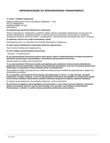 WPROWADZENIE DO SPRAWOZDANIA FINANSOWEGO 1) nazwa i siedziba organizacji 0,ĉ'=<1$52'2:<58&+1$5=(&==:,(5=Ą79,9$ 03-772 WARSZAWA .$:ĉ&=<ē6.$16 42A 0000135274 SRGVWDZRZ\SU]HGPLRWG]LDáDOQRĞFLRUJDQL]DFML 3RPRFFKDU\WDW\ZQDLHGXNDF\MQDZ]DNUHVLHRSLHNLLSRPRF\]ZLHU]ĊWRPEH]GRPQ\PSRU]XFRQ\POXE RNUXWQLHWUDNWRZDQ\PZVSLHUDQLHG]LDáDĔZ]DNUHVLHRFKURQ\ĞURGRZLVNDLLQIRUPRZDQLDRSUREOHPLH Z\Ī\ZLHQLDOXG]NRĞFLSURPRFML]GURZLDSURSDJRZDQLDLXSRZV]HFKQLDQLD]GURZHJRVW\OXĪ\FLDLĪ\ZLHQLD ZáDĞFLZ\VąGOXELQQ\RUJDQSURZDG]ąF\UHMHVWU 6ąG5HMRQRZ\GODPVW:DUV]DZ\;9,:\G]LDá*RVSRGDUF]\5HMHVWURZ\ F]DVWUZDQLDG]LDáDOQRĞFLRUJDQL]DFMLMHĪHOLMHVWRJUDQLF]RQ\ Czas trwania Fundacji jest nieograniczony. RNUHVREMĊW\VSUDZR]GDQLHPILQDQVRZ\P 1 stycznia - 31 grudnia 2013 F]\VSUDZR]GDQLHILQDQVRZH]DZLHUDGDQHáąF]QHMHĪHOLZVNáDGMHGQRVWNLZFKRG]ąZHZQĊWU]QH MHGQRVWNLRUJDQL]DF\MQHVSRU]ąG]DMąFHVDPRG]LHOQHVSUDZR]GDQLDILQDQVRZH 6SUDZR]GDQLHQLH]DZLHUDGDQ\FKáąF]Q\FK F]\VSUDZR]GDQLHILQDQVRZH]RVWDáRVSRU]ąG]RQHSU]\]DáRĪHQLXNRQW\QXRZDQLDG]LDáDOQRĞFL JRVSRGDUF]HMSU]H]MHGQRVWNĊZGDMąFHMVLĊSU]HZLG]LHüSU]\V]áRĞFLRUD]F]\QLHLVWQLHMąRNROLF]QRĞFL ZVND]XMąFHQD]DJURĪHQLHNRQW\QXRZDQLDSU]H]QLąG]LDáDOQRĞFL 6SUDZR]GDQLH]RVWDáRVSRU]ąG]RQHSU]\]DáRĪHQLXNRQW\QXRZDQLDG]LDáDOQRĞFLJRVSRGDUF]HMZGDMąFHMVLĊ SU]HZLG]LHüSU]\V]áRĞFL ZSU]\SDGNXVSUDZR]GDQLDILQDQVRZHJRVSRU]ąG]RQHJR]DRNUHVZFLąJXNWyUHJRQDVWąSLáR SRáąF]HQLHSURVLP\ZVND]DüĪHMHVWWRVSUDZR]GDQLHILQDQVRZHVSRU]ąG]RQHSRSRáąF]HQLXVSyáHN RUD]SURVLP\ZVND]Dü]DVWRVRZDQąPHWRGĊUR]OLF]HQLDSRáąF]HQLDQDE\FLDáąF]HQLDXG]LDáyZ :RNUHVLHVSUDZR]GDZF]\PQLHQDVWąSLáRSRáąF]HQLH]LQQ\PSRGPLRWHP RPyZLHQLHSU]\MĊW\FK]DVDGSROLW\NLUDFKXQNRZRĞFLZW\PPHWRGZ\FHQ\DNW\ZyZLSDV\ZyZ WDNĪHDPRUW\]DFMLSRPLDUXZ\QLNXILQDQVRZHJRRUD]VSRVREXVSRU]ąG]HQLDVSUDZR]GDQLD finansowego w zakresie, w jakim ustawa pozostawia jednostce prawo wyboru Druk: MPiPS 6WRVRZDQHPHWRG\L]DVDG\UDFKXQNRZRĞFLRUD]PHWRG\Z\FHQ\DNW\ZyZLSDV\ZyZ 6SUDZR]GDQLHILQDQVRZH]RVWDáRVSRU]ąG]RQH]XZ]JOĊGQLHQLHPQDGU]ĊGQ\FK]DVDGUDFKXQNRZRĞFL RNUHĞORQ\FKXVWDZąRUDFKXQNRZRĞFLRUD]RGUĊEQ\FKSU]HSLVyZUHJXOXMąF\FK]DVDG\JRVSRGDUNLILQDQVRZHM RUJDQL]DFMLSR]DU]ąGRZ\FK :\QLNILQDQVRZ\)XQGDFML]DGDQ\URNREURWRZ\REHMPXMHZV]\VWNLHRVLąJQLĊWHLSU]\SDGDMąFHQDMHJRU]HF] SU]\FKRG\RUD]]ZLą]DQH]W\PLSU]\FKRGDPLNRV]W\]JRGQH]]DVDGDPLPHPRULDáXZVSyáPLHUQRĞFL SU]\FKRGyZLNRV]WyZRUD]RVWURĪQHMZ\FHQ\ RACHUNEK WYNIKÓW 1 Przychody 3U]\FKRG\REHMPXMąRWU]\PDQHĞURGNLSLHQLĊĪQHLLQQHDNW\ZDILQDQVRZH]HĨUyGHáRNUHĞORQ\FKSU]HSLVDPL SUDZDOXEVWDWXWHPDWDNĪHNZRW\QDOHĪQH]HVSU]HGDĪ\VNáDGQLNyZPDMąWNXSU]\FKRG\ILQDQVRZHGRWDFMHL VXEZHQFMHSU]\FKRG\]W\WXáXSURZDG]RQHMG]LDáDOQRĞFLJRVSRGDUF]HMRUD]Z\QLNILQDQVRZ\]DURNSRSU]HGQL 2 Koszty .RV]W\G]LDáDOQRĞFL)XQGDFMLWRNRV]W\UHDOL]DFML]DGDĔVWDWXWRZ\FKZW\PUyZQLHĪĞZLDGF]HĔRNUHĞORQ\FK statutem. 'RNRV]WyZZUDFKXQNXZ\QLNyZ]DOLF]DVLĊ NRV]W\UHDOL]DFML]DGDĔVWDWXWRZ\FKF]\OL]ZLą]DQH]Z\NRQ\ZDQLHPSU]H])XQGDFMD]DGDĔSU]HZLG]LDQ\FK statutem, NRV]W\SURZDG]RQHMG]LDáDOQRĞFLJRVSRGDUF]HM NRV]W\DGPLQLVWUDF\MQHGRNWyU\FK]DOLF]DVLĊNRV]W\XWU]\PDQLDNRPyUHNDGPLQLVWUDF\MQ\FK)XQGDFML 31DZ\QLNILQDQVRZ\)XQGDFMLZSá\ZDMąSRQDGWR SR]RVWDáHSU]\FKRG\LNRV]W\DZLĊFPLQSU]\FKRG\LNRV]W\]ZLą]DQH]H]E\FLHPĞURGNyZWUZDá\FKVNXWNL DNWXDOL]DFMLZDUWRĞFLQDOHĪQRĞFLRUD]RGSLVDQHQDOHĪQRĞFLL]RERZLą]DQLD NRV]W\LSU]\FKRG\ILQDQVRZHZ\QLNDMąFH]RSHUDFMLILQDQVRZ\FKWDNLHPLQMDNRGVHWNLEDQNRZHRGVHWNL]D ]ZáRNĊGRGDWQLHLXMHPQHUyĪQLFHNXUVRZH BILANS 15]HF]RZHDNW\ZDWUZDáH±Z\ND]XMHVLĊ]DOLF]RQHGRDNW\ZyZWUZDá\FKĞURGNLWUZDáHĞURGNLWUZDáHZ EXGRZLHZ\FHQLRQHZJFHQQDE\FLDOXENRV]WyZZ\WZRU]HQLDSRPQLHMV]RQ\FKRRGSLV\DPRUW\]DF\MQHDWDNĪH RGSLV\]W\WXáXWUZDáHMXWUDW\ZDUWRĞFL 2=DSDV\U]HF]RZ\FKDNW\ZyZREURWRZ\FK±Z\ND]XMHVLĊPDWHULDá\LWRZDU\Z\FHQLRQHZJFHQ]DNXSXQLH Z\ĪV]\FKRGLFKFHQVSU]HGDĪ\QHWWRQDG]LHĔELODQVRZ\ 31DOHĪQRĞFLNUyWNRWHUPLQRZH±Z\ND]XMHVLĊQDOHĪQRĞFL]W\WXáXGRVWDZLXVáXJEH]Z]JOĊGXQDWHUPLQLFK ]DSáDW\RUD]SR]RVWDáHQDOHĪQRĞFLZ\PDJDOQHZFLąJX12PLHVLĊF\RGGQLDELODQVRZHJR1DOHĪQRĞFLZ\FHQLRQH VąZNZRFLHZ\PDJDQHM]DSáDW\]]DFKRZDQLHPRVWURĪQRĞFL 4ĝURGNLSLHQLĊĪQHZ\ND]XMHVLĊZZDUWRĞFLQRPLQDOQHM2EHMPXMąRQHĞURGNLSLHQLĊĪQHZNDVLHQDUDFKXQNDFK EDQNRZ\FKRUD]W]ZĞURGNLSLHQLĊĪQHZGURG]H 55R]OLF]HQLDPLĊG]\RNUHVRZH±Z\ND]XMHVLĊF]\QQHUR]OLF]HQLDPLĊG]\RNUHVRZHNRV]WyZ 6)XQGXV]HZáDVQH±Z\ND]XMHVLĊZZ\VRNRĞFLIXQGXV]XVWDWXWRZHJRRUD]Z\QLNXILQDQVRZHJR]DRNUHV sprawozdawczy. 7:\QLNILQDQVRZ\QHWWR]DURNREURWRZ\±Z\ND]XMHVLĊUyĪQLFąSRPLĊG]\SU]\FKRGDPLDNRV]WDPL]DGDQ\ rok obrotowy. 8,QQH]RERZLą]DQLD±Z\ND]XMHVLĊ]RERZLą]DQLD]W\WXáXGRVWDZLXVáXJEH]Z]JOĊGXQDWHUPLQSáDWQRĞFLRUD] SR]RVWDáH]RERZLą]DQLD]W\WXáXZ\QDJURG]HĔUR]UDFKXQNyZ]SUDFRZQLNDPLLUR]UDFKXQNyZ SXEOLF]QRSUDZQ\FKRRNUHVLHZ\PDJDOQRĞFLGR12PLHVLĊF\=RERZLą]DQLDWHZ\FHQLDVLĊZNZRFLHZ\PDJDQHM ]DSáDW\ 9,QQHUR]OLF]HQLDPLĊG]\RNUHVRZH±Z\ND]XMHVLĊVWDQELHUQ\FKUR]OLF]HĔPLĊG]\RNUHVRZ\FKSU]\FKRGyZZ Z\VRNRĞFLSU]\FKRGyZGRW\F]ąF\FKURNXREURWRZHJRD]DIDNWXURZDQ\FKZURNXQDVWĊSQ\P 10 Wycena transakcji w walutach obcych :\UDĪRQHZZDOXWDFKREF\FKRSHUDFMHJRVSRGDUF]HXMPXMHVLĊZNVLĊJDFKUDFKXQNRZ\FKQDG]LHĔLFK przeprowadzenia odpowiednio po kursie: NXSQDOXEVSU]HGDĪ\ZDOXWVWRVRZDQ\PSU]H]EDQN]NWyUHJRXVáXJNRU]\VWDMHGQRVWND±ZSU]\SDGNX RSHUDFMLVSU]HGDĪ\OXENXSQDZDOXWRUD]RSHUDFML]DSáDW\QDOHĪQRĞFLOXE]RERZLą]DĔ ĞUHGQLPXVWDORQ\PGODGDQHMZDOXW\SU]H]1%3QDWHQG]LHĔFK\EDĪHZ]JáRV]HQLXFHOQ\POXELQQ\P ZLąĪąF\PMHGQRVWNĊGRNXPHQFLHXVWDORQ\]RVWDáLQQ\NXUVZSU]\SDGNXSR]RVWDá\FKRSHUDFML 11=PLDQ\]DVDGUDFKXQNRZRĞFLZRNUHVLHVSUDZR]GDZF]\P :RNUHVLHVSUDZR]GDZF]\PSROLW\NDUDFKXQNRZRĞFLQLHXOHJáD]PLDQLH 6SRU]ąG]RQRGQLD Druk: MPiPS